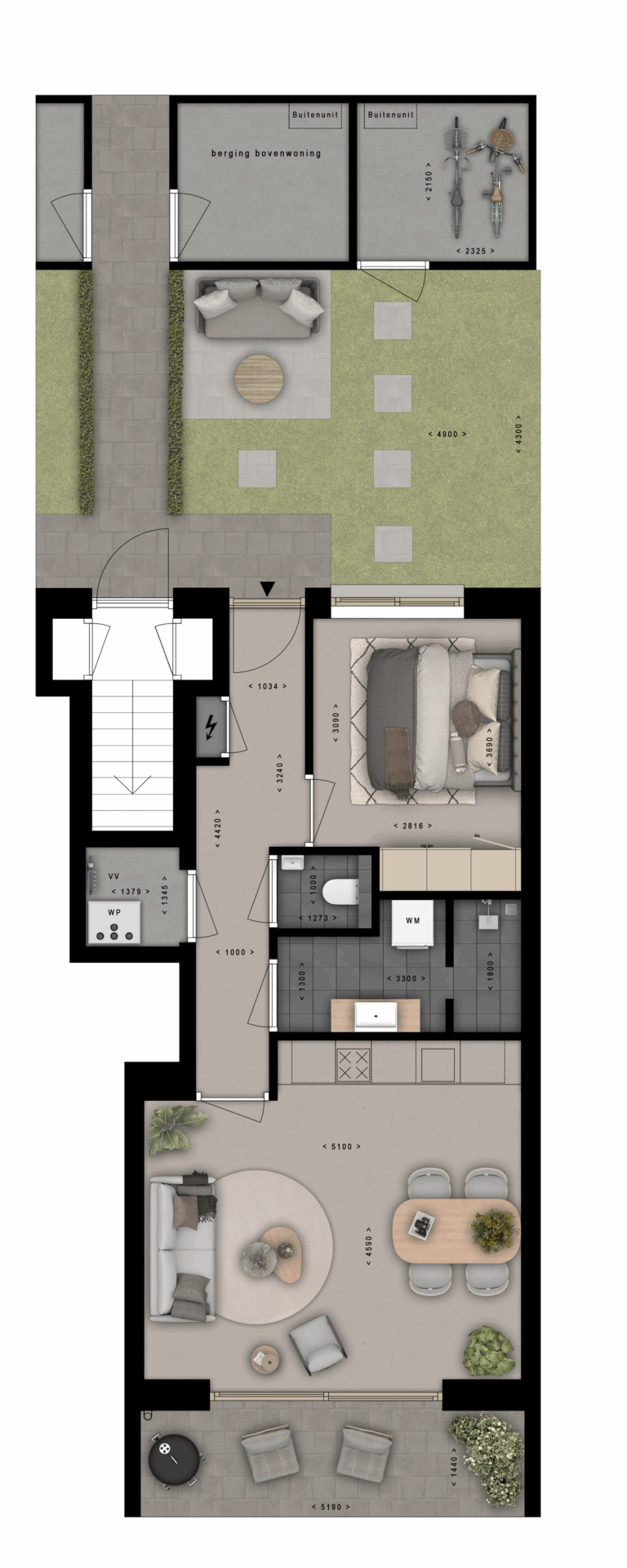 De sfeervolle benedenwoningen hebben een woonoppervlakte van ca. 50 m². De woning biedt een gelijkvloerse plattegrond voorzien van een entree, slaapkamer, toilet, badkamer, berging, open woonkeuken en een terras op het zuiden met een grote gevelpui, waardoor het woongedeelte heerlijk licht is. Deze benedenwoningen hebben ook een eigen achtertuin en zijn ideaal voor senioren en starters.