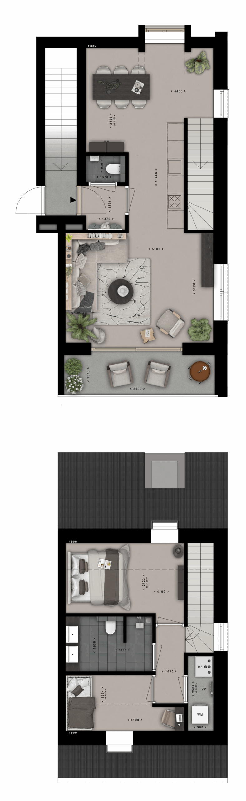Via de gemeenschappelijke entree bereikt u met de trap de bovenwoningen met een woonoppervlakte van ca. 80 m². Op de eerste woonlaag bevindt zich de entree met toilet, de open woonkeuken en woonkamer, gericht op het zuiden met een grote gevelpui. De bovenwoning is voorzien van een ruim balkon. Op de tweede woonlaag vindt u een badkamer, berging en twee (slaap)kamers. Deze bovenwoningen zijn uitermate geschikt voor starters of gezinnen.