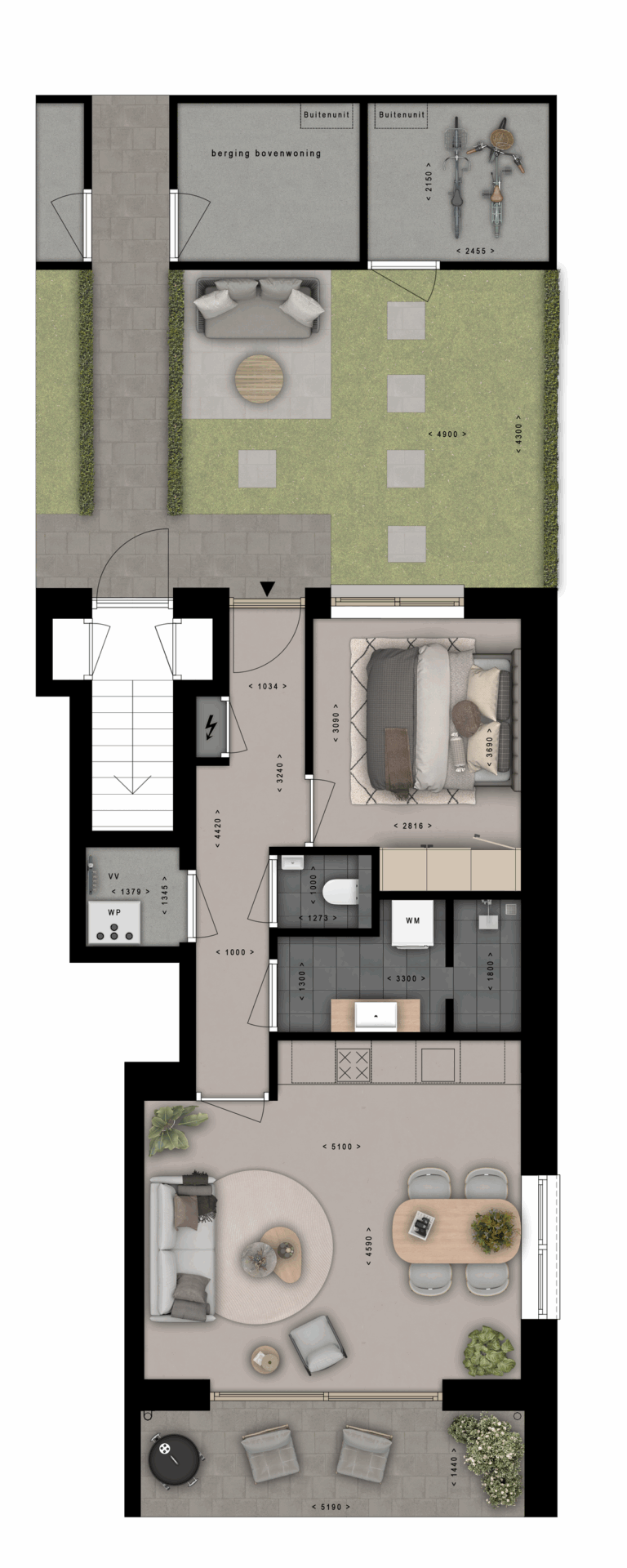 De sfeervolle benedenwoningen hebben een woonoppervlakte van ca. 50 m². De woning biedt een gelijkvloerse plattegrond voorzien van een entree, slaapkamer, toilet, badkamer, berging, open woonkeuken en een terras op het zuiden met een grote gevelpui, waardoor het woongedeelte heerlijk licht is. Deze benedenwoningen hebben ook een eigen achtertuin en zijn ideaal voor senioren en starters.