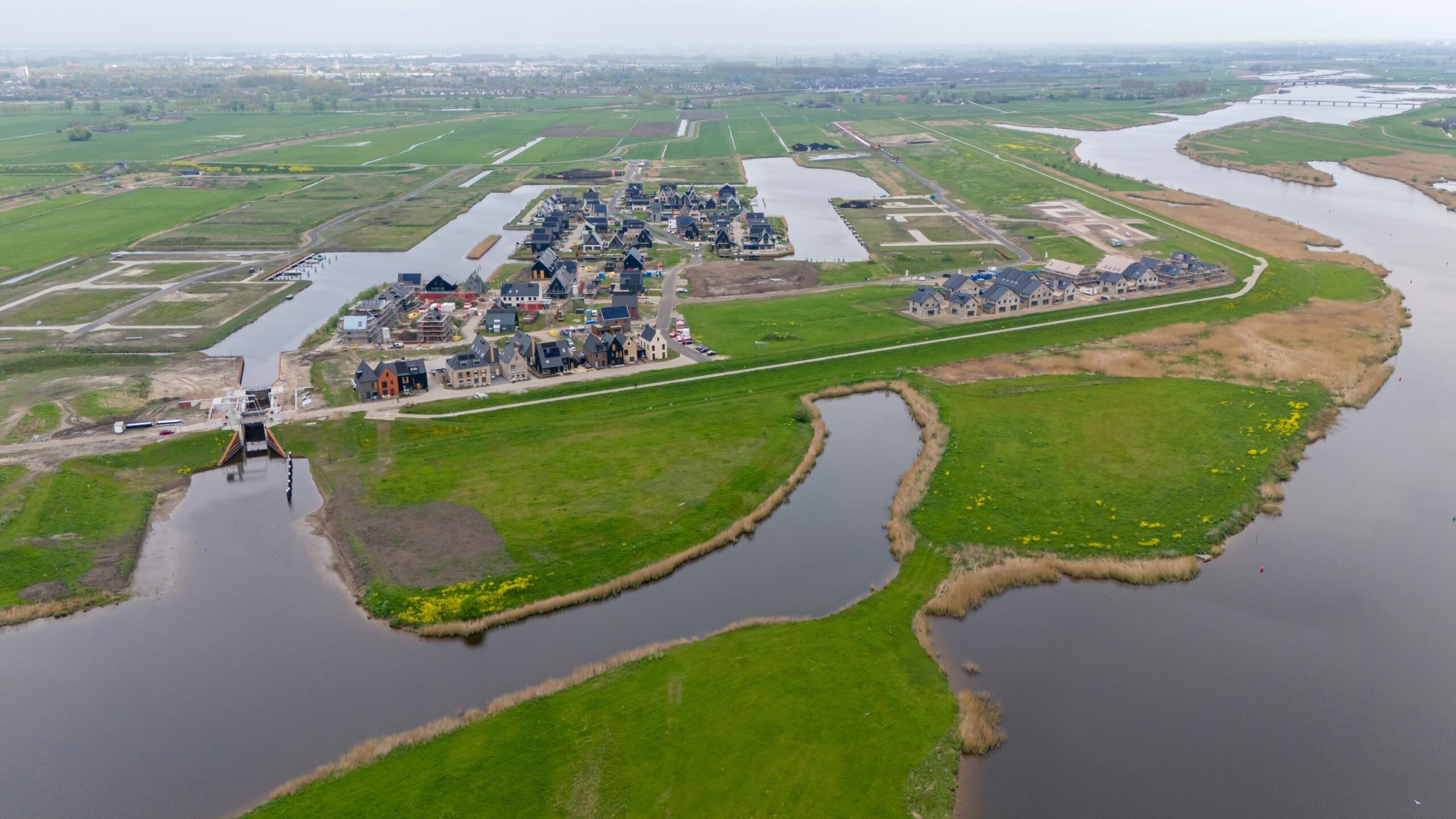 Aan de zuidzijde van de weg ligt de klimaatdijk. een open landschappelijk ingericht dijklichaam, met kenmerkende compacte bouwclusters erop.