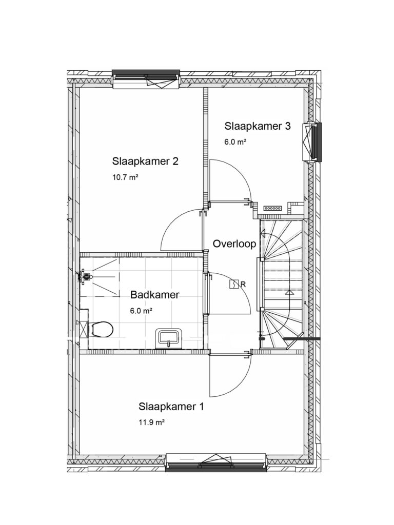 De 1e etage biedt via de overloop toegang tot 3 slaapkamers die in grootte oplopen. Perfect voor een gezin dat groeit of verandert, met ruimte voor iedereen om zich thuis te voelen. De badkamer met douche, wastafel en 2e toilet biedt alle comfort. De bovenste etage geeft je de vrijheid om je eigen invulling aan het huis te geven. Aan 3 slaapkamers niet genoeg? Op deze etage maak je makkelijk een 4e slaapkamer. Plus een wasruimte, want hier zijn ook de aansluitingen voor de wasmachine en droger.