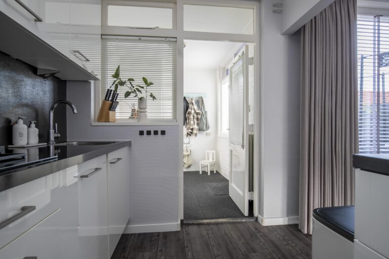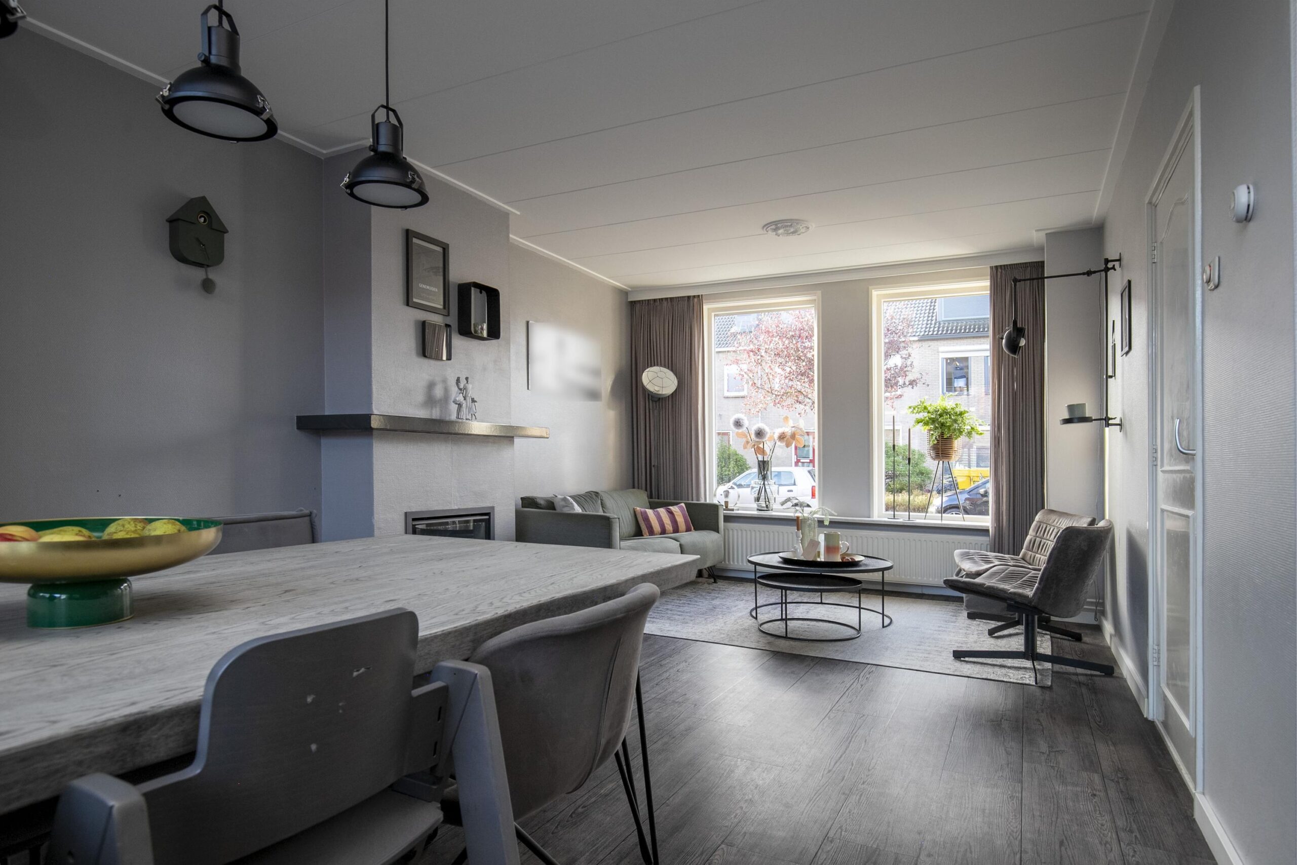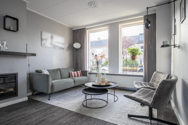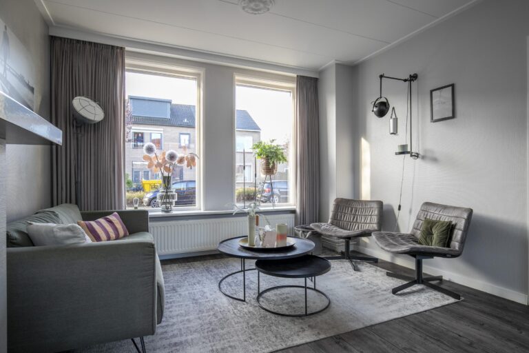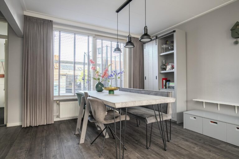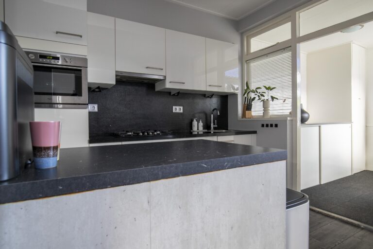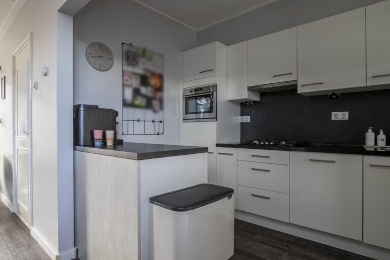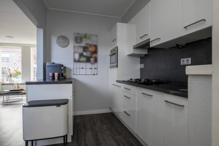 De woonkamer strekt zich uit over de gehele lengte van de woning en is licht en sfeervol dankzij de grote raampartijen aan de voor- en achterzijde. Aan de voorzijde is een gezellige zithoek gecreëerd, terwijl aan de achterzijde ruimte is voor een eettafel met zicht op de tuin. De goede afwerking en de neutrale kleurstelling zorgen voor een moderne uitstraling. De gaskachel zorgt daarbij voor extra warmte en sfeer in de herfst- en wintermaanden. De open keuken met schiereiland is uitgevoerd in wit met een donker werkblad en beschikt over diverse inbouwapparatuur, waaronder een gasfornuis, afzuigkap, koelkast, vaatwasser en combi-oven. Aansluitend bevindt zich de praktische bijkeuken met vaste kasten, aansluitingen voor de wasmachine en toegang tot de achtertuin.