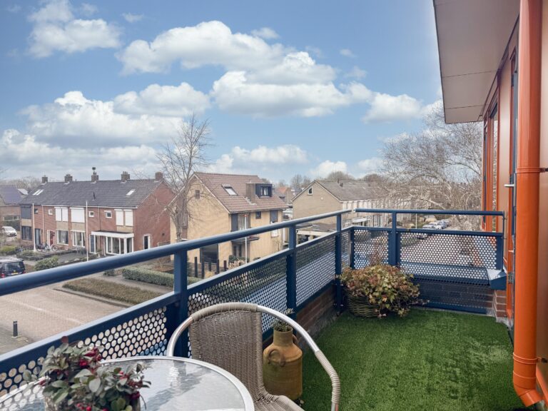 Hal/entree – ruime bergkast – badkamer – woonkamer met toegang tot balkon – half open keuken – ruime slaapkamer.