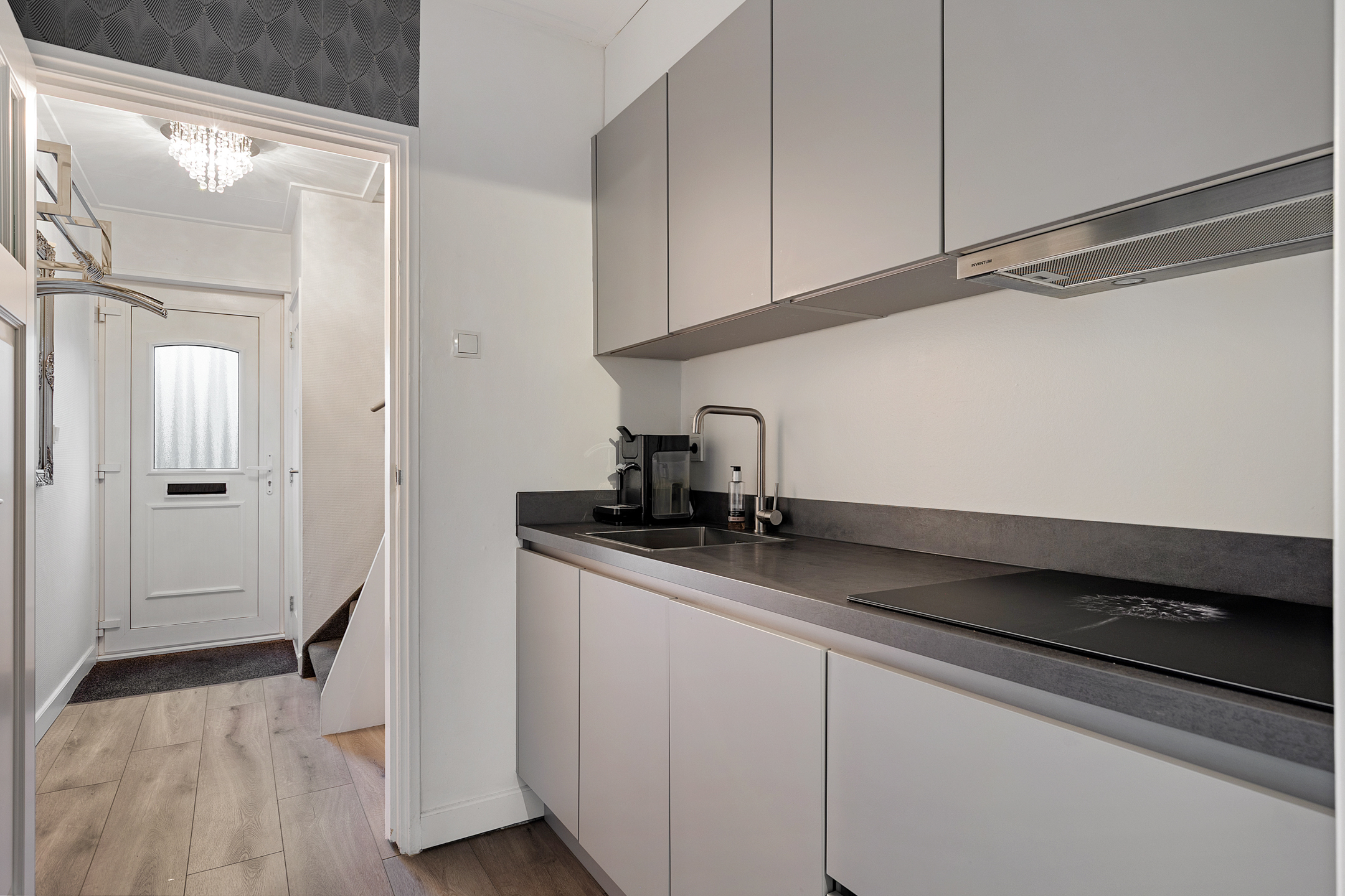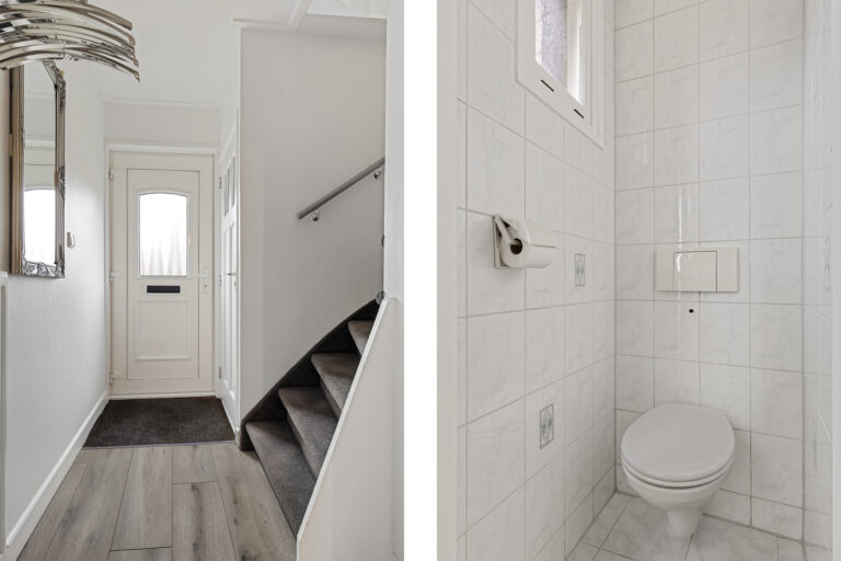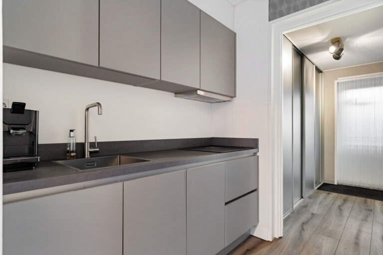 Via de ruime voortuin bereik je de voordeur. Bij binnenkomst stap je in de hal, waar zich het toilet en de trapopgang naar de eerste verdieping bevinden. Vanuit de hal loop je door naar de moderne keuken, die strak is uitgevoerd en voorzien is van diverse inbouwapparatuur. De keuken is praktisch ingericht en biedt volop werk- en bergruimte, waardoor koken hier zowel comfortabel als efficiënt is. Aansluitend bevindt zich de bijkeuken, waar een vaste kast met schuifdeuren extra opbergruimte biedt voor voorraad en andere benodigdheden. De achterdeur geeft toegang tot de achtertuin.