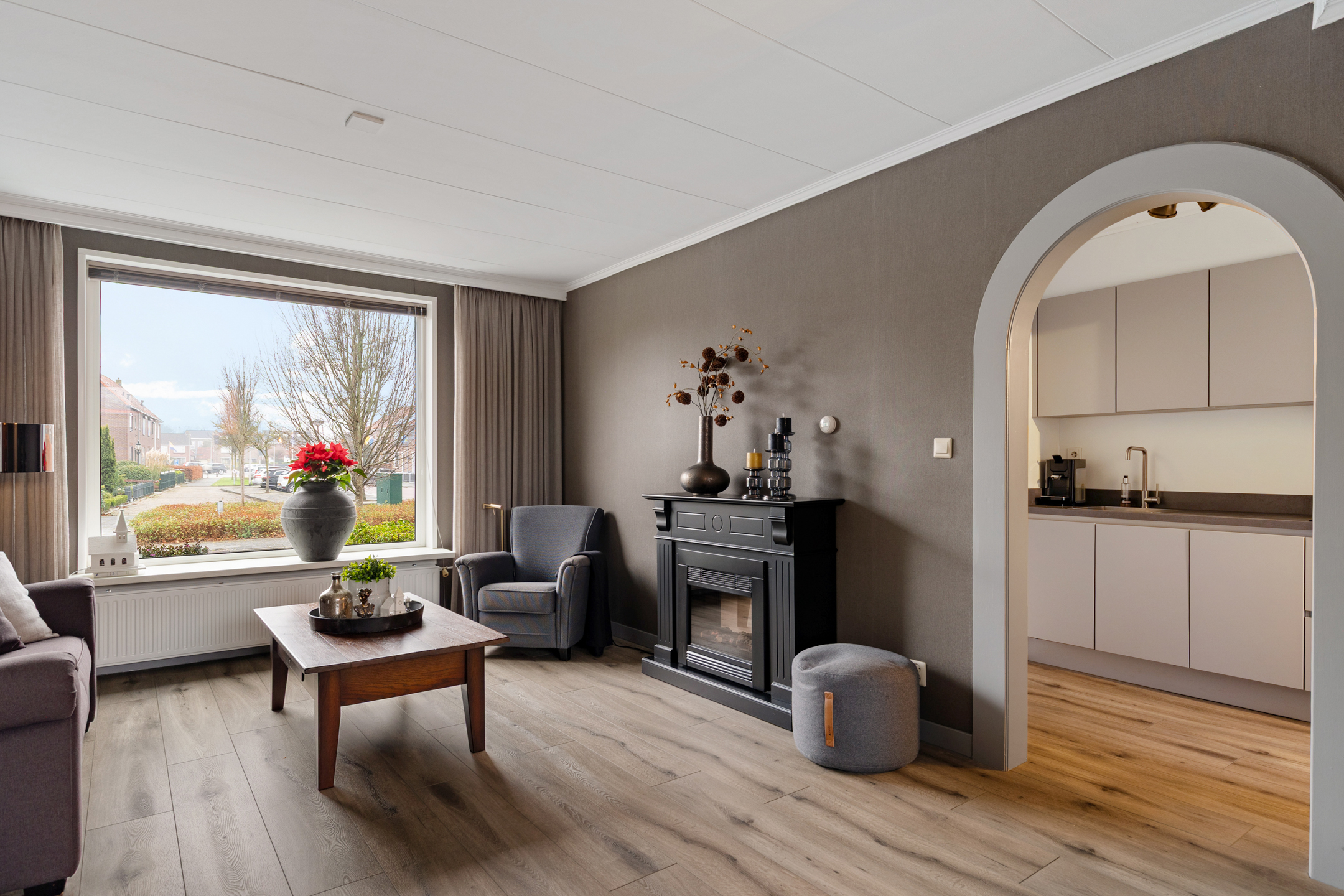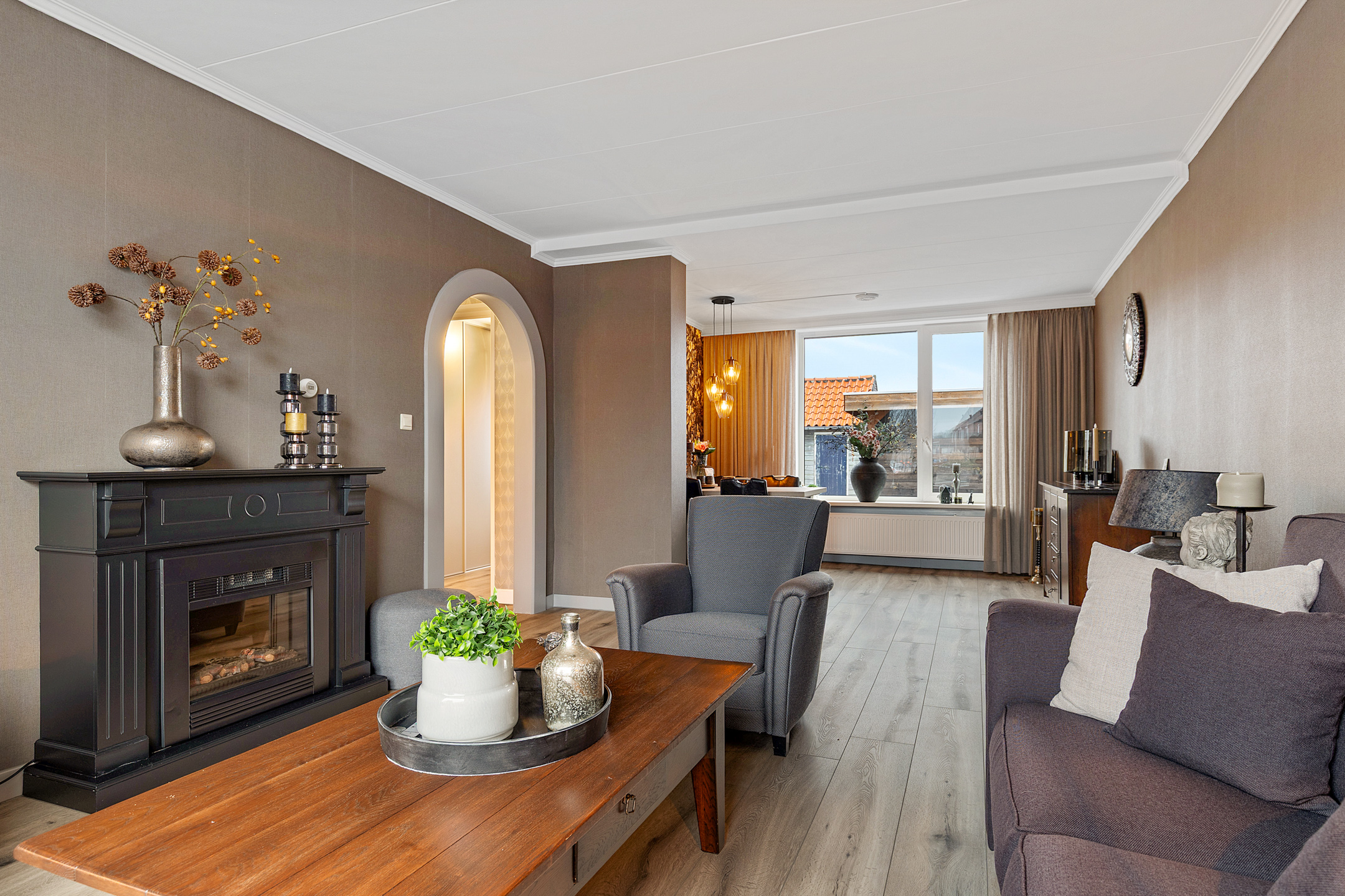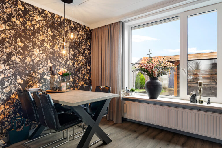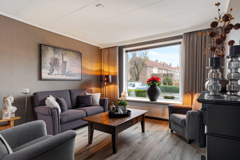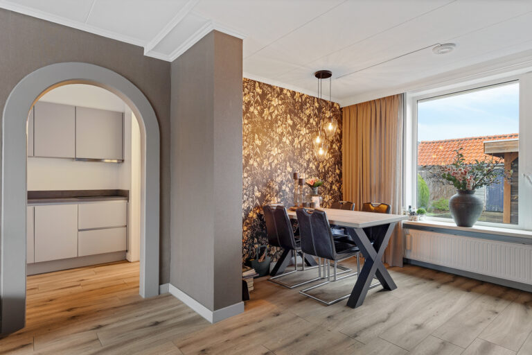 De woonkamer is ruim opgezet en staat in open verbinding met de eetkamer. Deze indeling zorgt voor een aangename, open leefruimte waar wonen en eten naadloos in elkaar overlopen. Dankzij de grote raampartijen en de vrije uitkijk aan de voorzijde valt er veel natuurlijk licht binnen, wat bijdraagt aan een lichte en uitnodigende sfeer in huis..