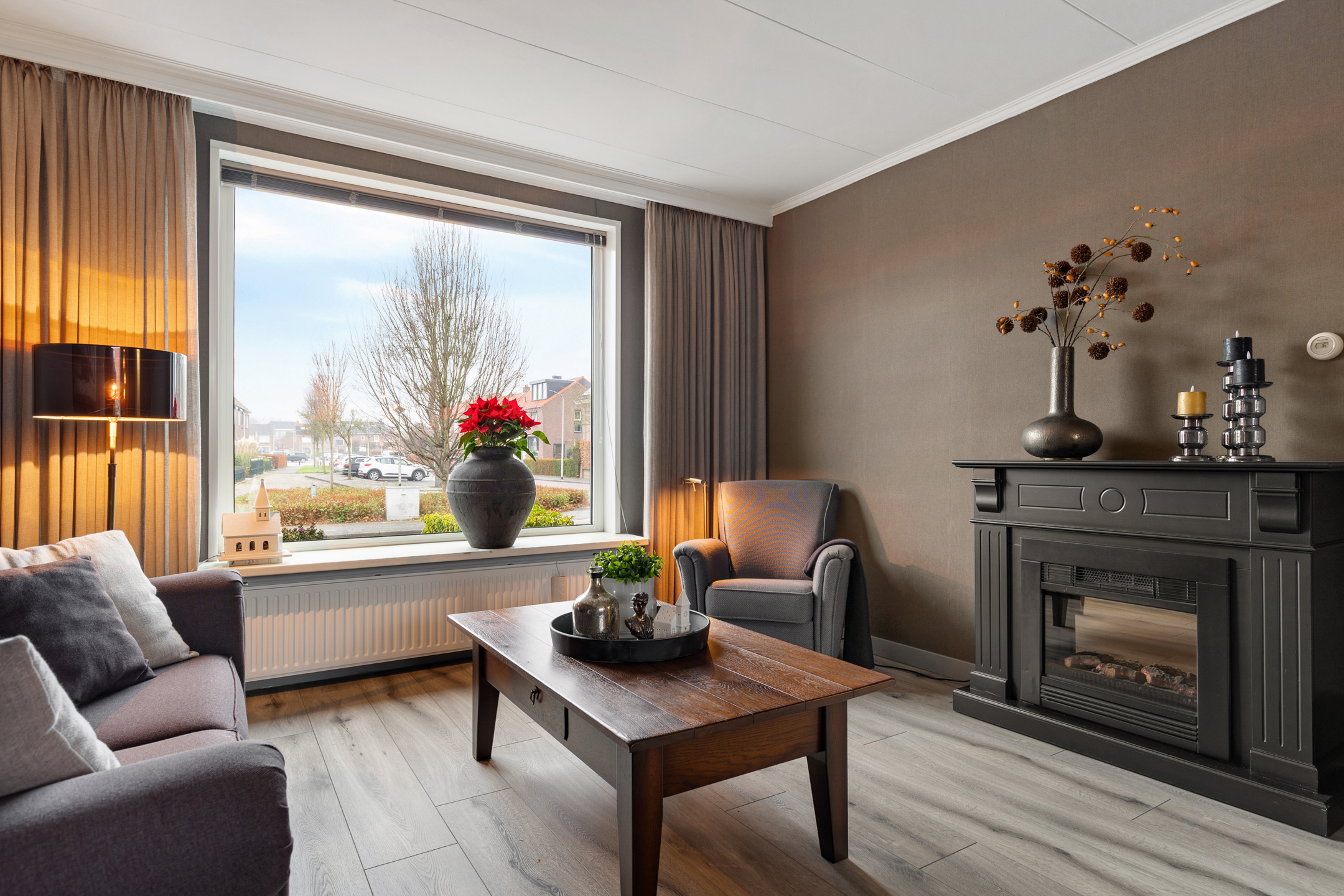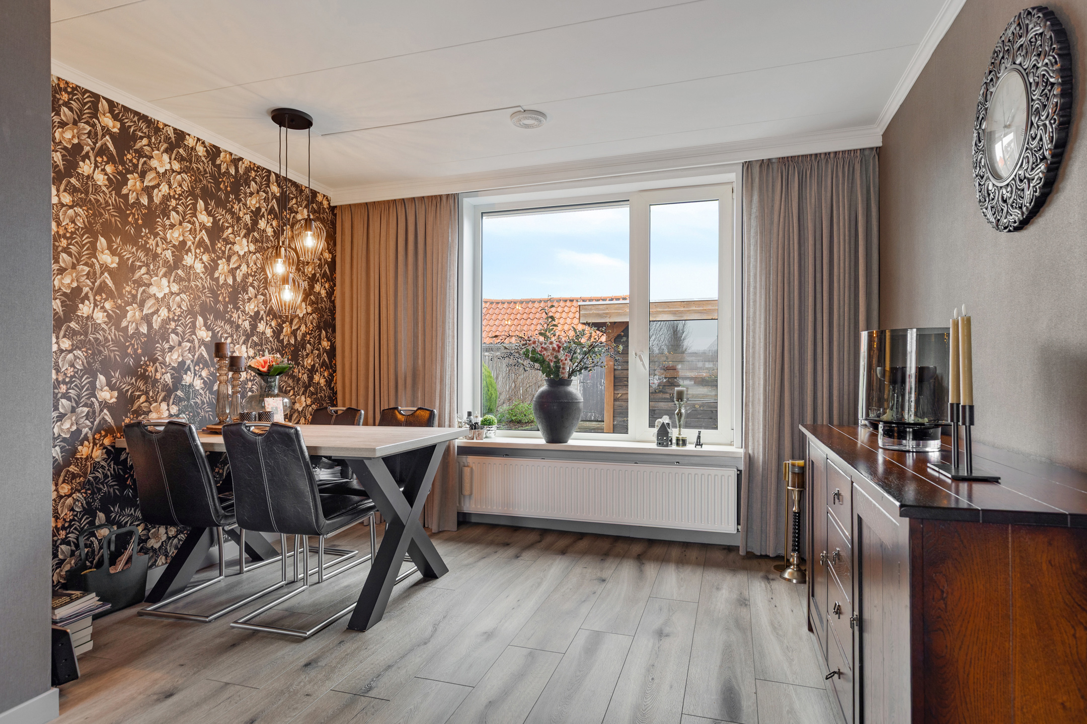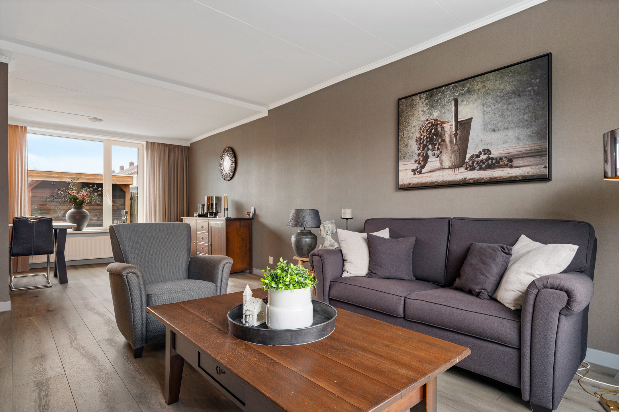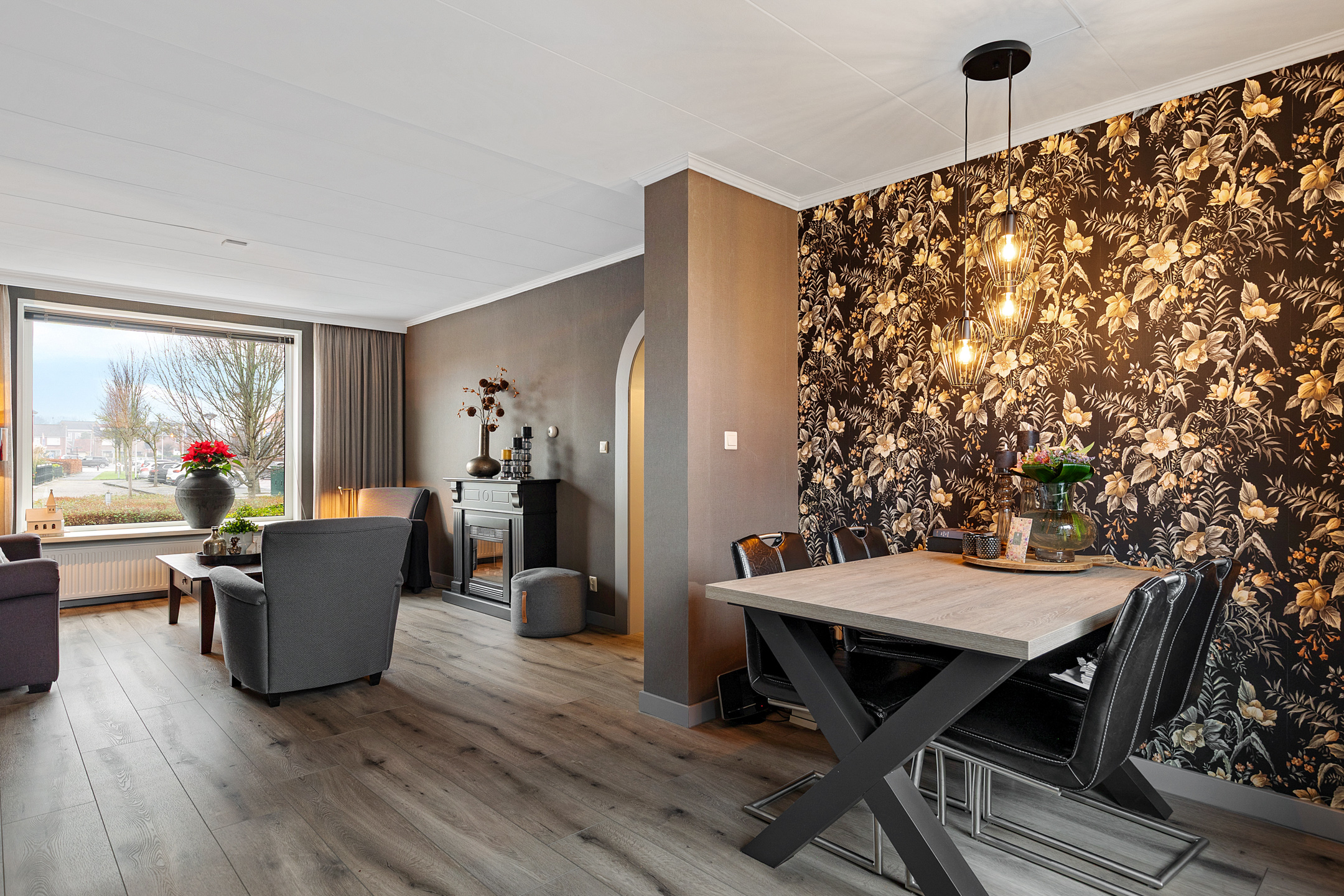 De woonkamer is ruim opgezet en staat in open verbinding met de eetkamer. Deze indeling zorgt voor een aangename, open leefruimte waar wonen en eten naadloos in elkaar overlopen. Dankzij de grote raampartijen en de vrije uitkijk aan de voorzijde valt er veel natuurlijk licht binnen, wat bijdraagt aan een lichte en uitnodigende sfeer in huis..