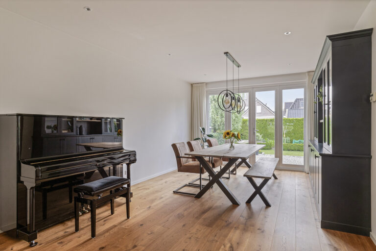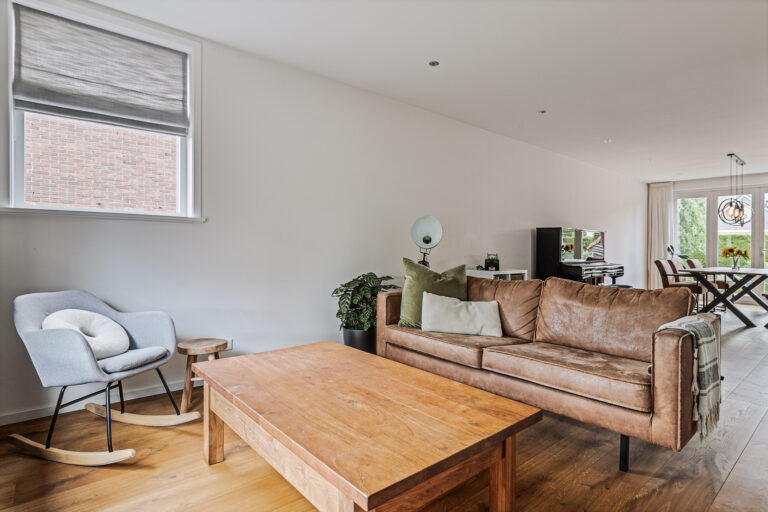 Via de entree aan de voorzijde kom je binnen in de hal met trapopgang en toegang tot de woonkamer. De ruime woonkamer is licht en sfeervol, met voldoende ruimte voor een comfortabele zithoek. Aansluitend bevindt zich de eetkamer, die mooi in verbinding staat met de keuken. Deze verdieping is voorzien van vloerverwarming.