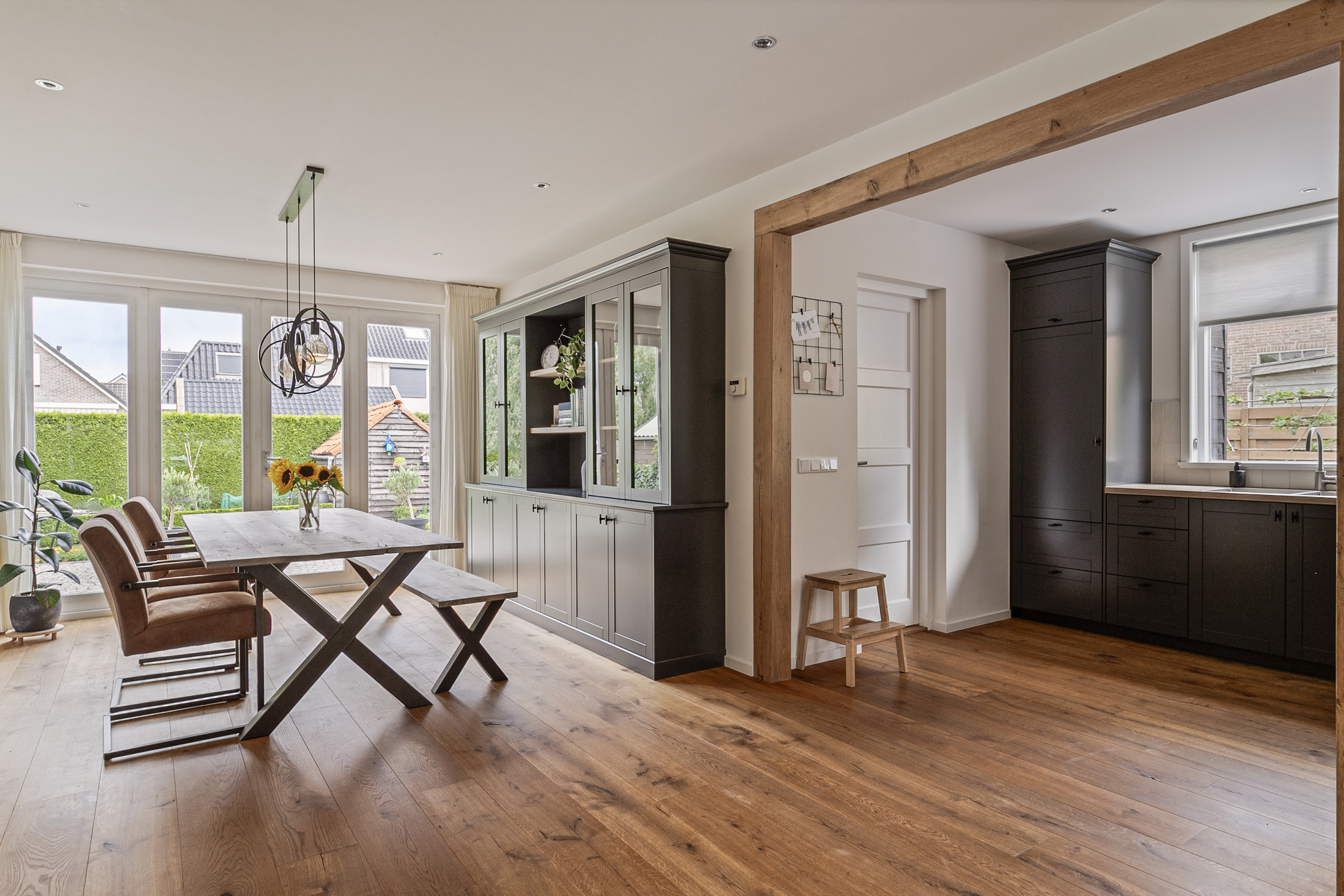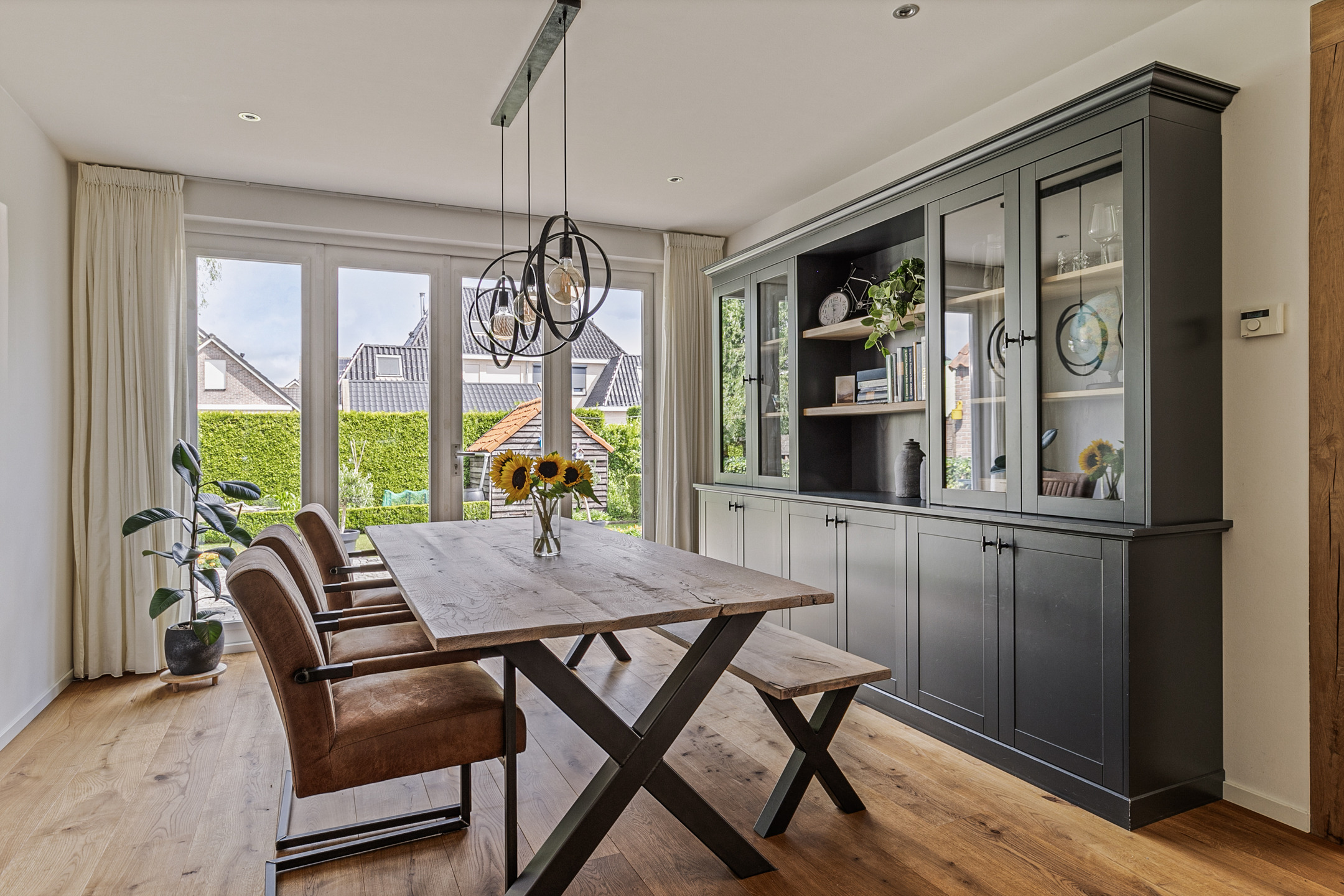 Via de openslaande deuren in de eetkamer bereik je het terras en de achtertuin. Wat een ruimte vind je hier!