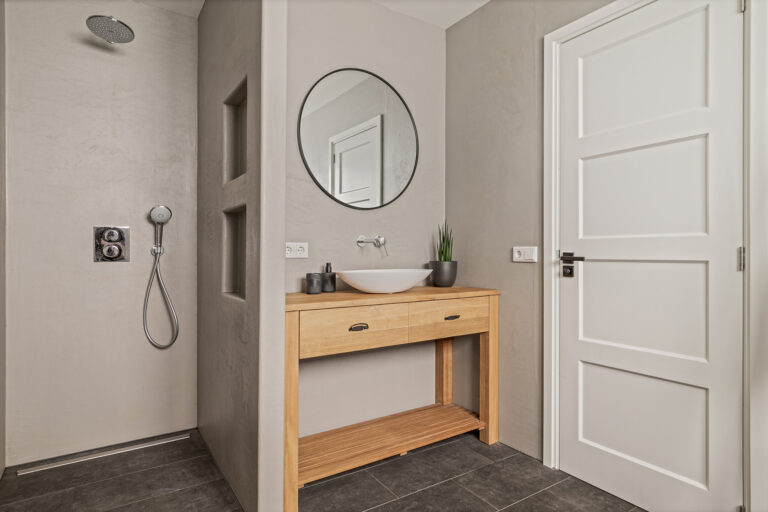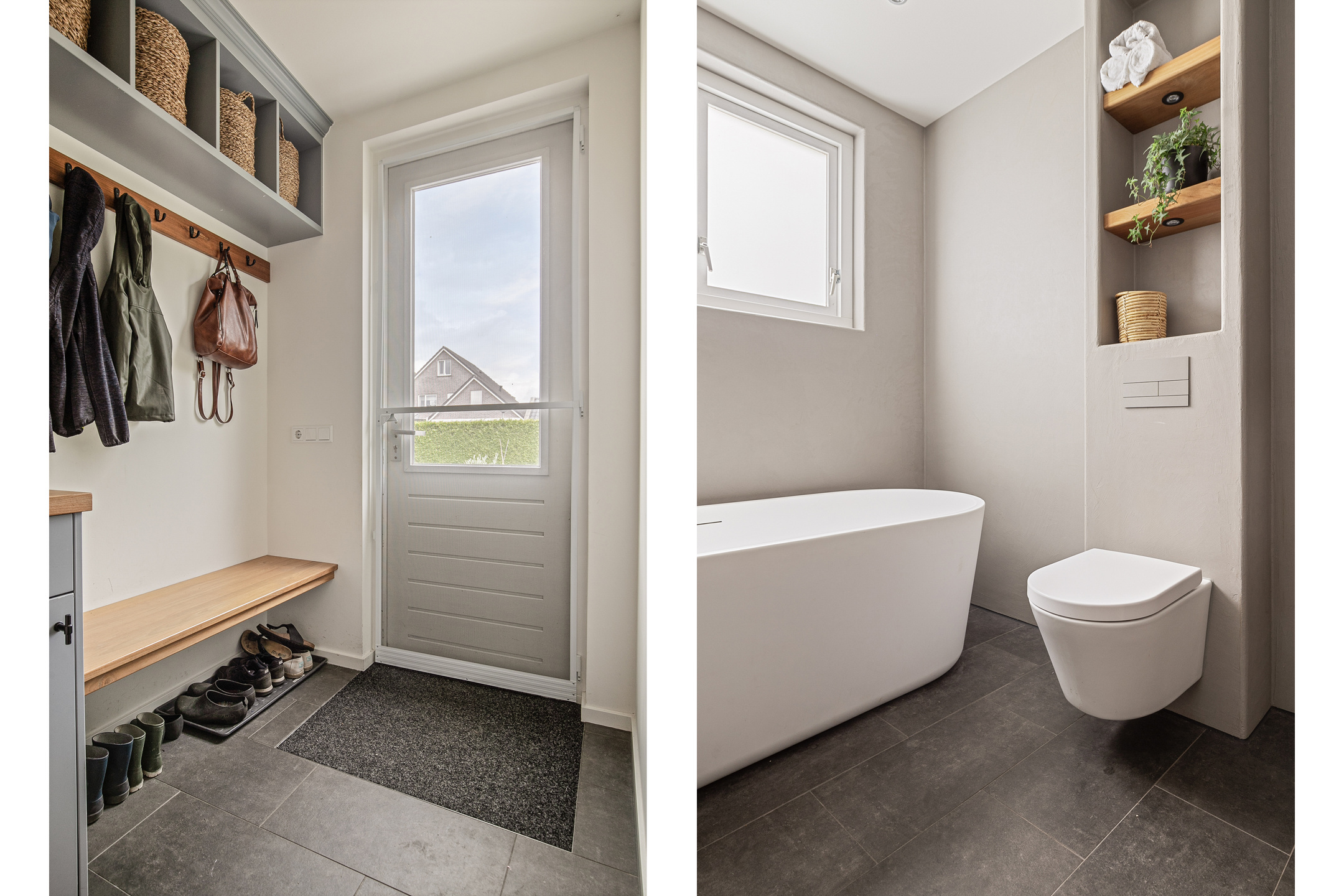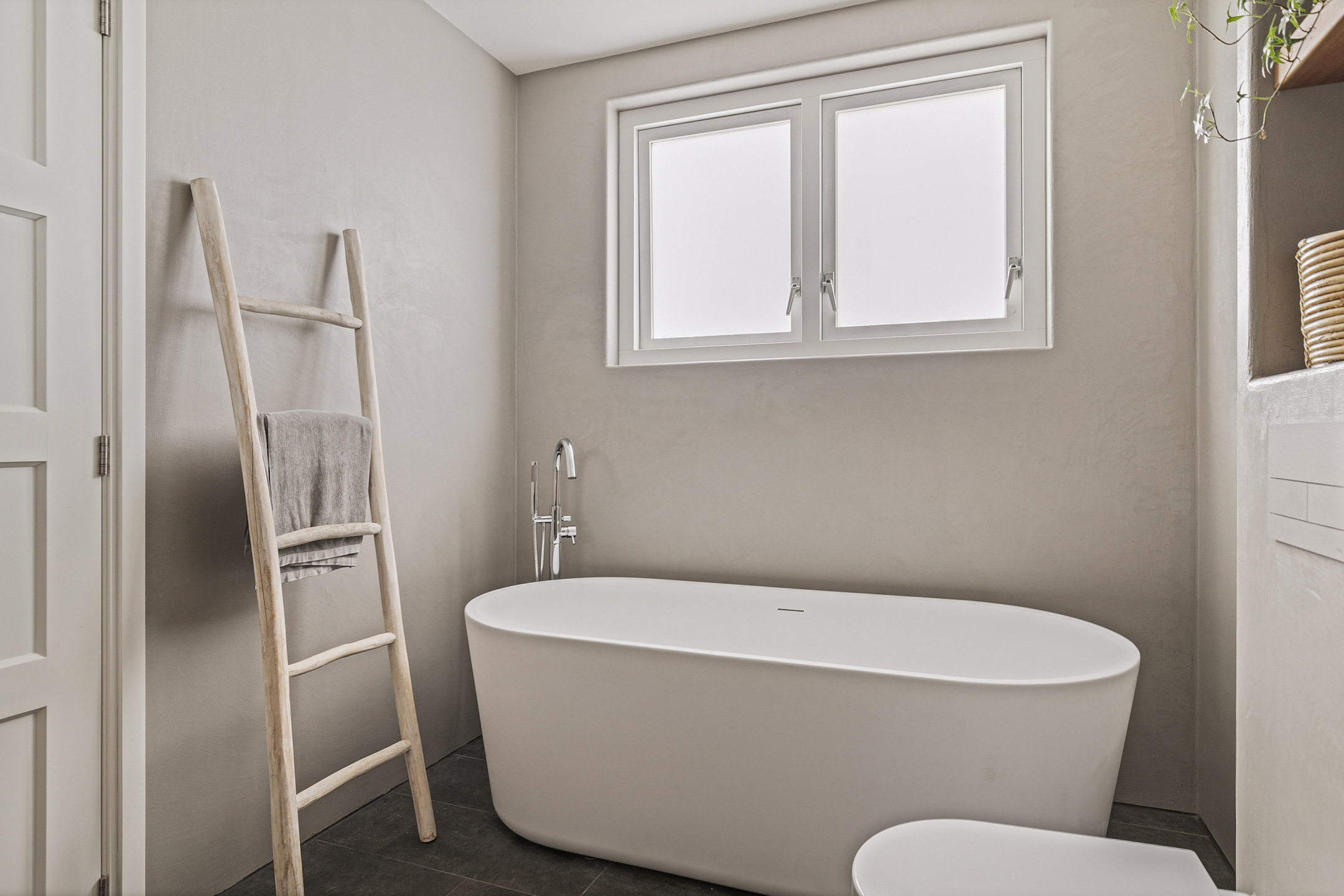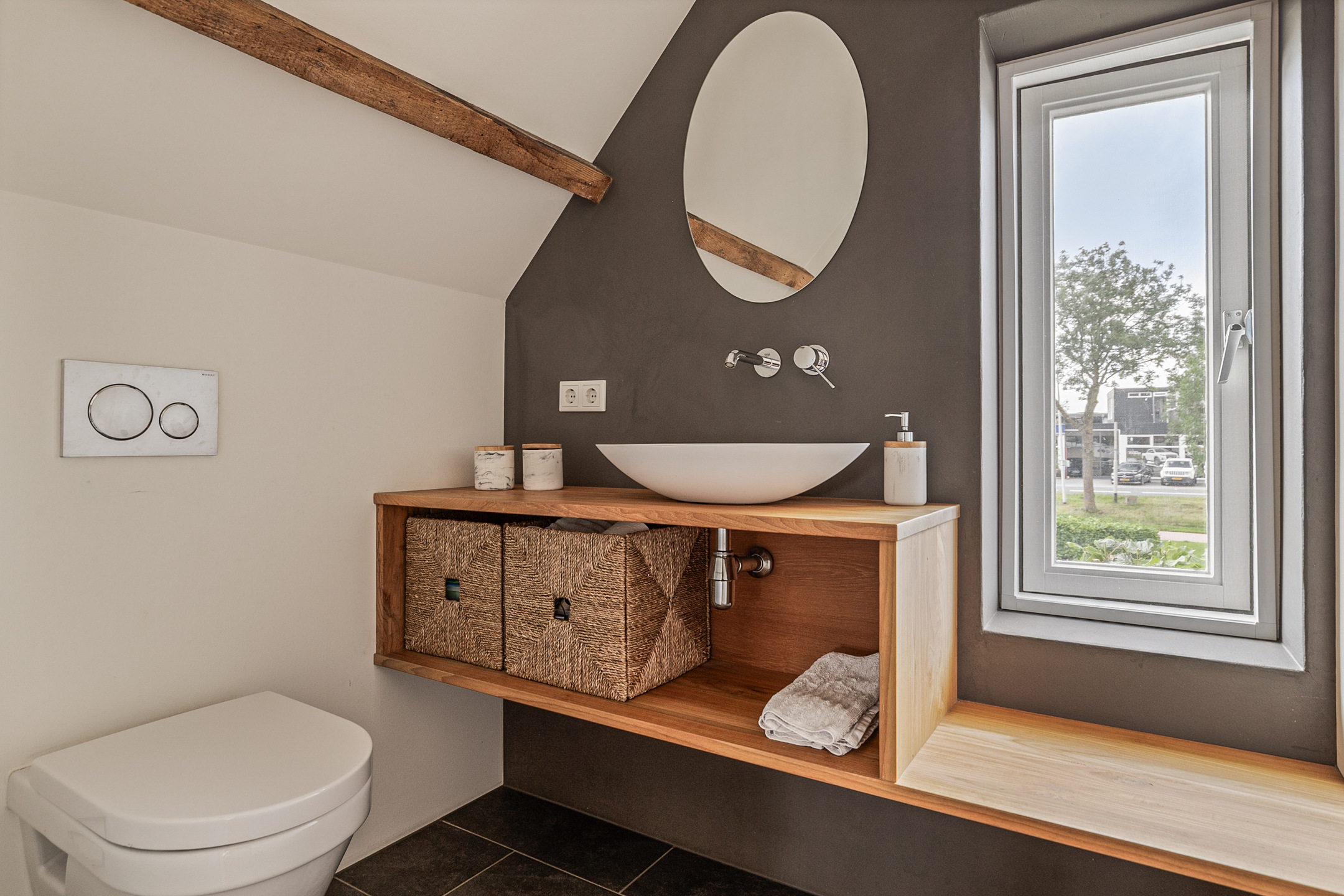 De badkamer op de begane grond is luxe en compleet uitgevoerd met een inloopdouche, vrijstaand bad, wastafelmeubel en toilet.