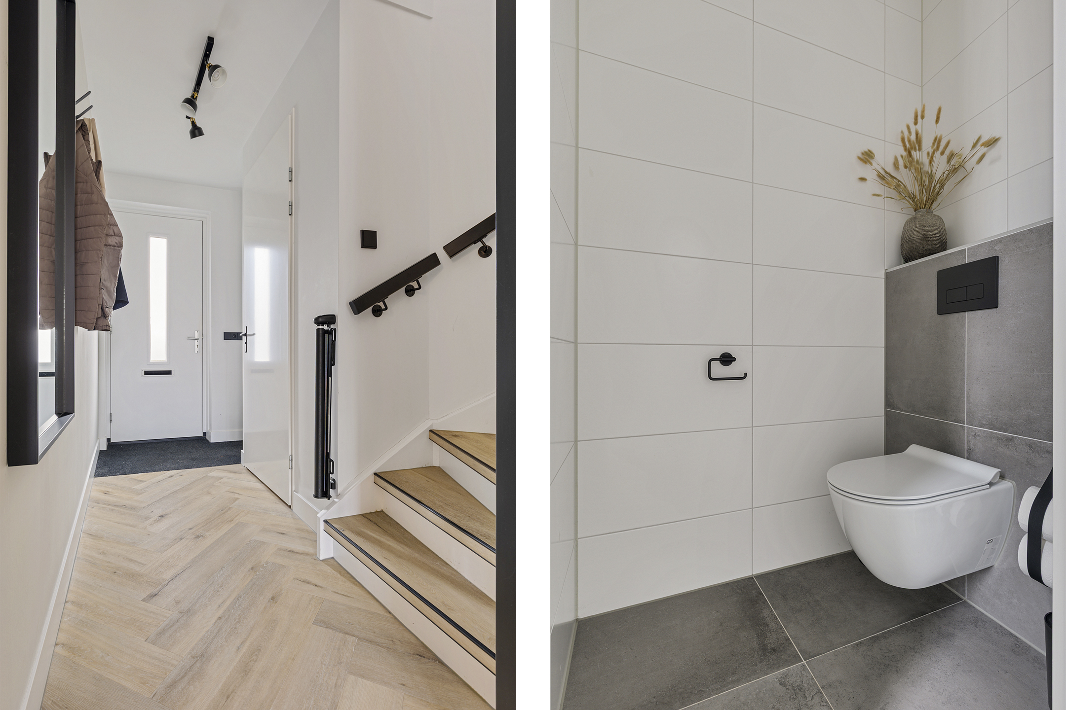 Via de voordeur stap je de ruime hal binnen, waar direct het gevoel van kwaliteit overheerst. De strakke afwerking, het gebruik van neutrale kleuren en de moderne binnendeuren zetten de toon voor de rest van de woning. In de hal vind je het toilet met fontein, de meterkast en toegang tot de woonkamer. Een vaste trap leidt naar de eerste verdieping, terwijl een handige trapkast extra opbergruimte biedt.