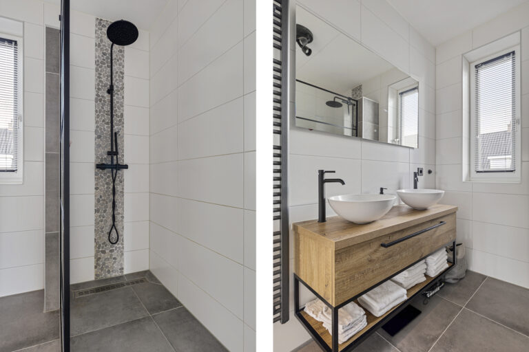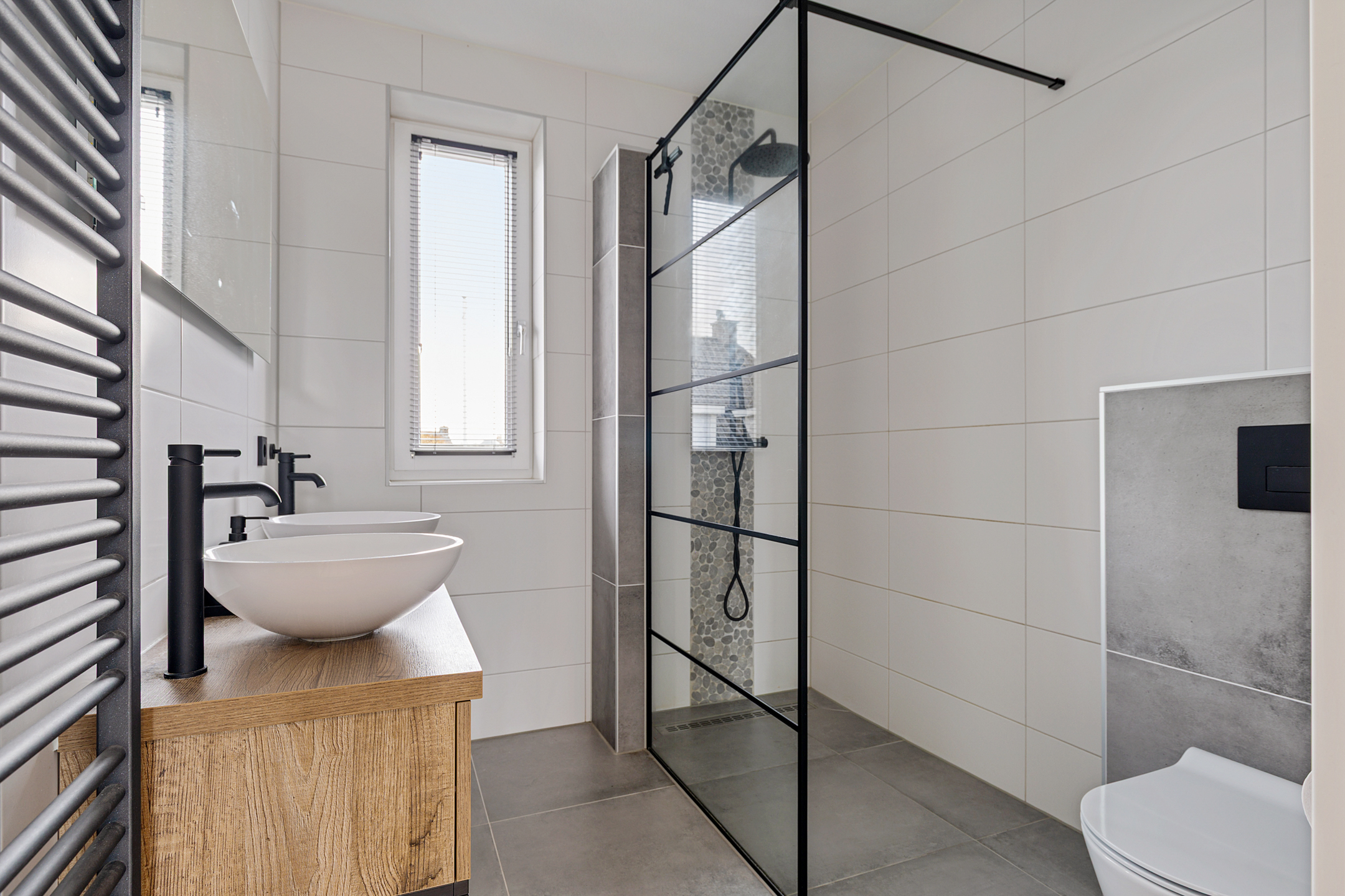 De badkamer is modern en stijlvol uitgevoerd in neutrale tinten. Hier vind je een ruime inloopdouche met glazen wand en zwarte accenten, een dubbele wastafel met meubel, een tweede toilet en een handdoekradiator.