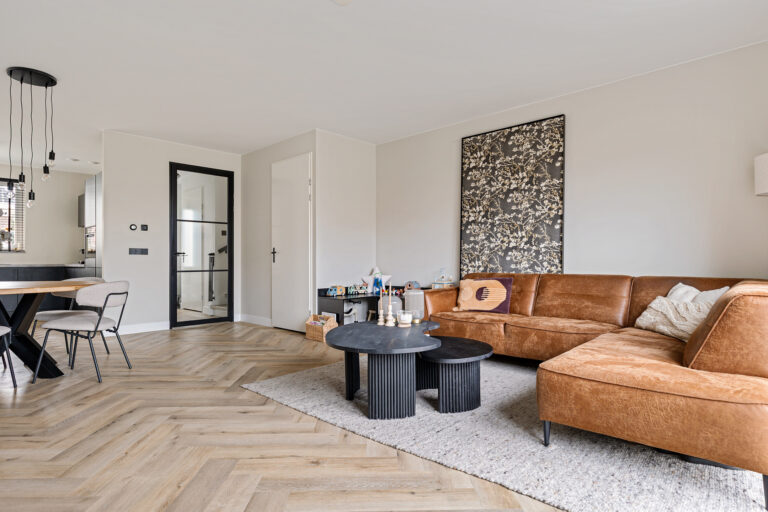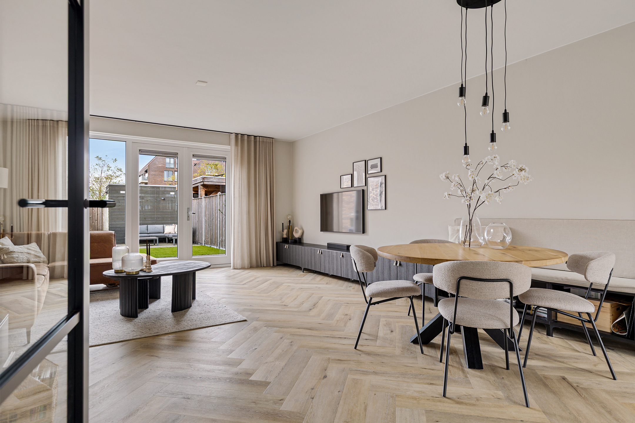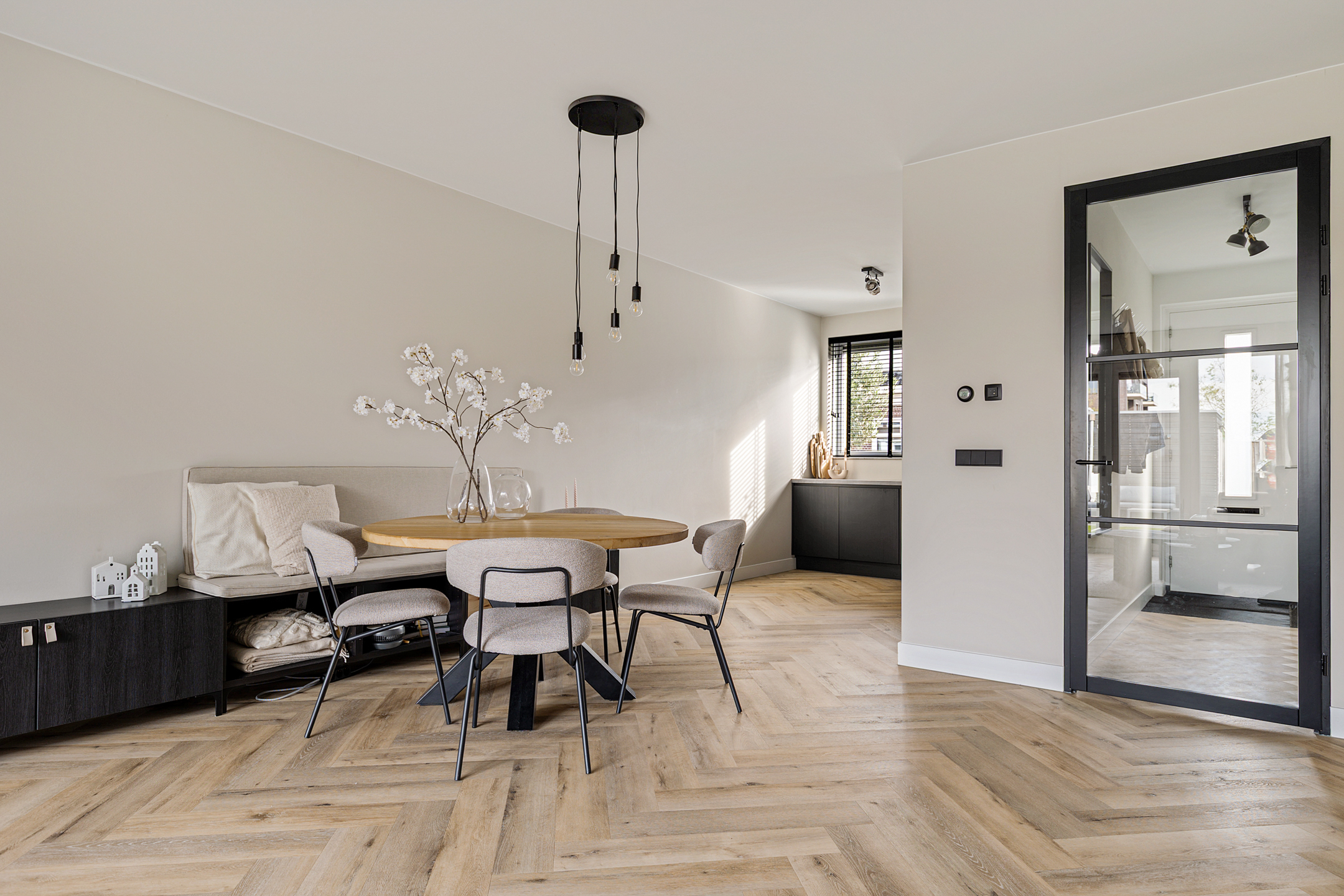 Zodra je de woonkamer binnenkomt, valt het direct op hoe licht en ruim deze leefruimte is. Dankzij de grote raampartijen en de dubbele openslaande tuindeuren komt er een zee van daglicht binnen. De lichte pvc-visgraatvloer met vloerverwarming loopt drempelloos door over de gehele begane grond en zorgt voor een warme, luxe uitstraling.