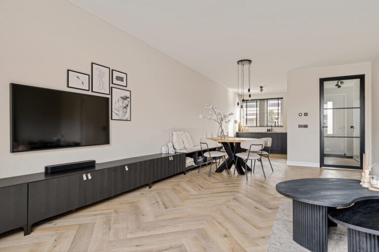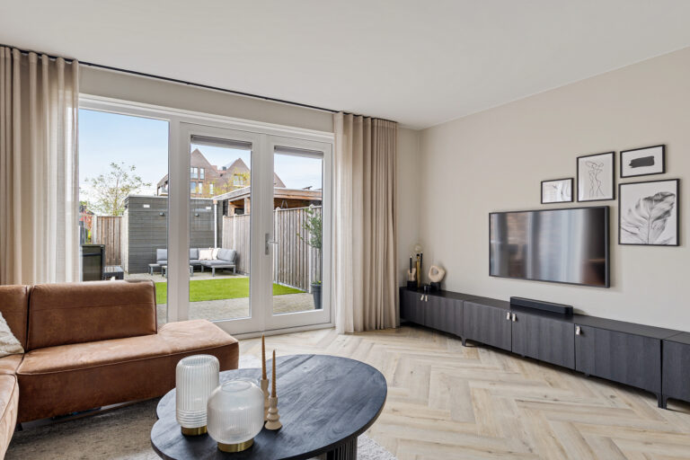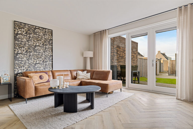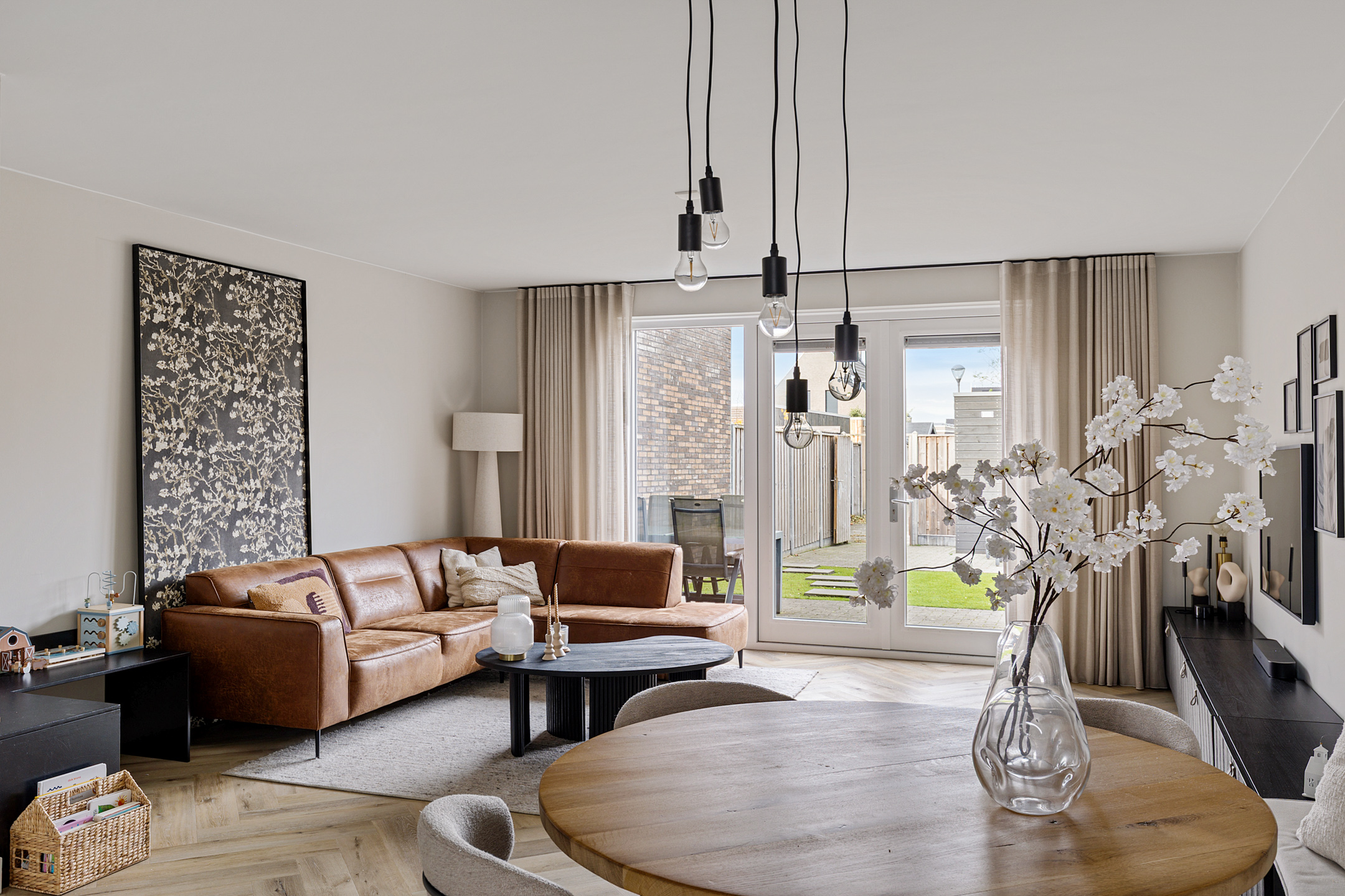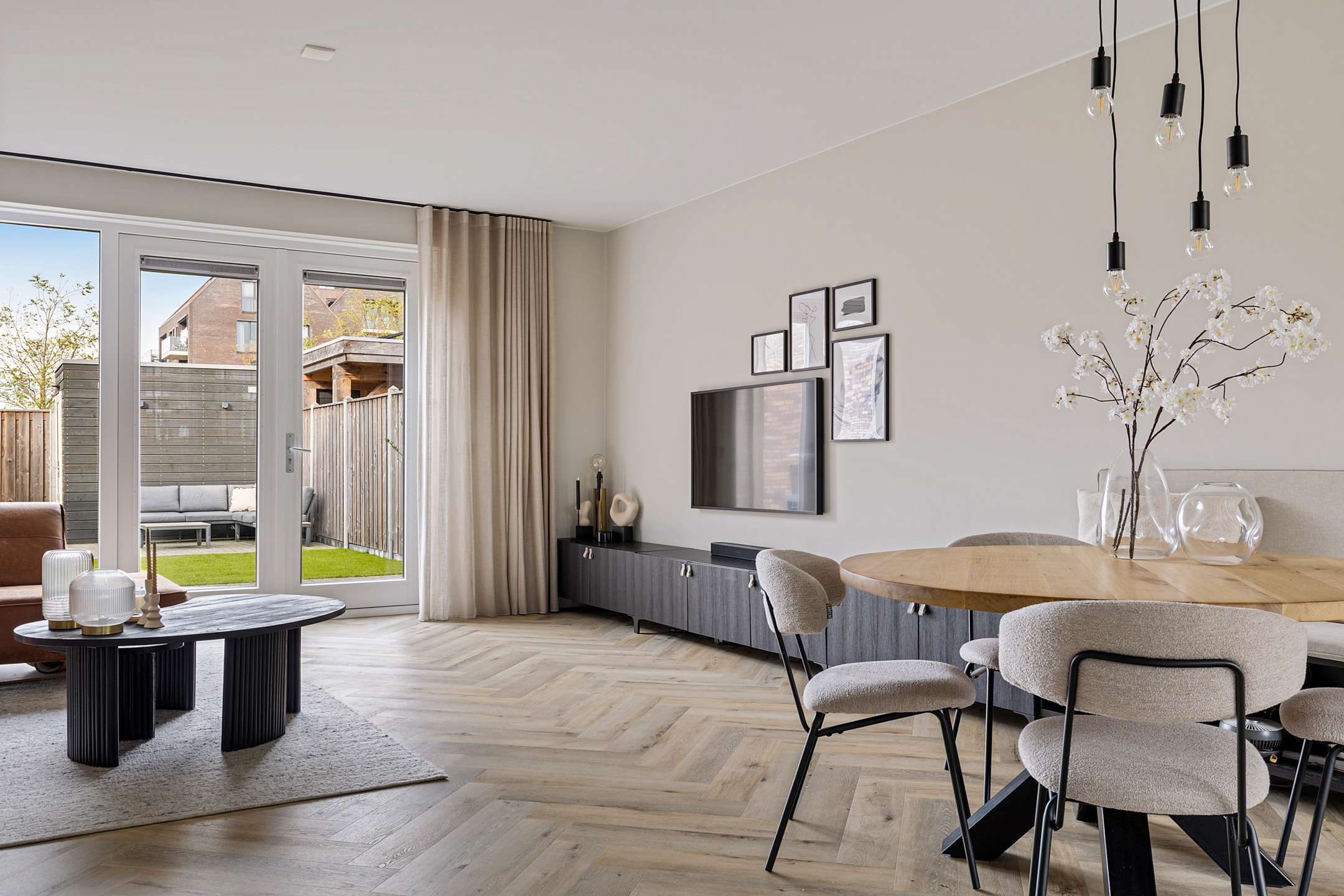 Zodra je de woonkamer binnenkomt, valt het direct op hoe licht en ruim deze leefruimte is. Dankzij de grote raampartijen en de dubbele openslaande tuindeuren komt er een zee van daglicht binnen. De lichte pvc-visgraatvloer met vloerverwarming loopt drempelloos door over de gehele begane grond en zorgt voor een warme, luxe uitstraling.