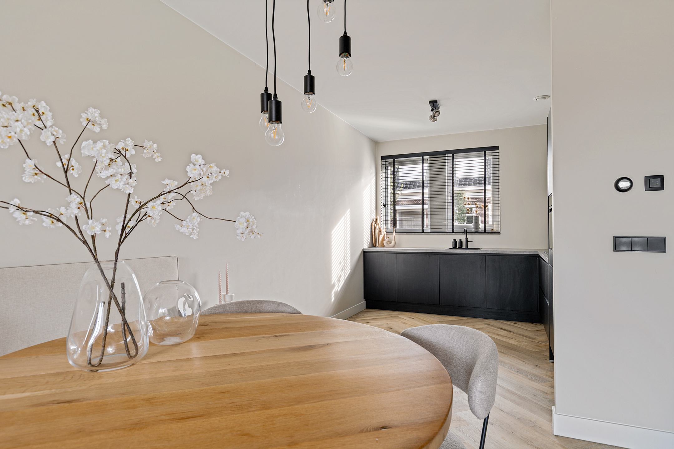 Aan de voorzijde bevindt zich de eethoek, met genoeg plek voor een grote eettafel. Hier dineer je gezellig met vrienden of geniet je van een rustig ontbijt. De stalen deur met glas naar de hal geeft de ruimte een eigentijdse, industriële touch die naadloos aansluit bij de moderne inrichting.