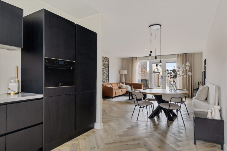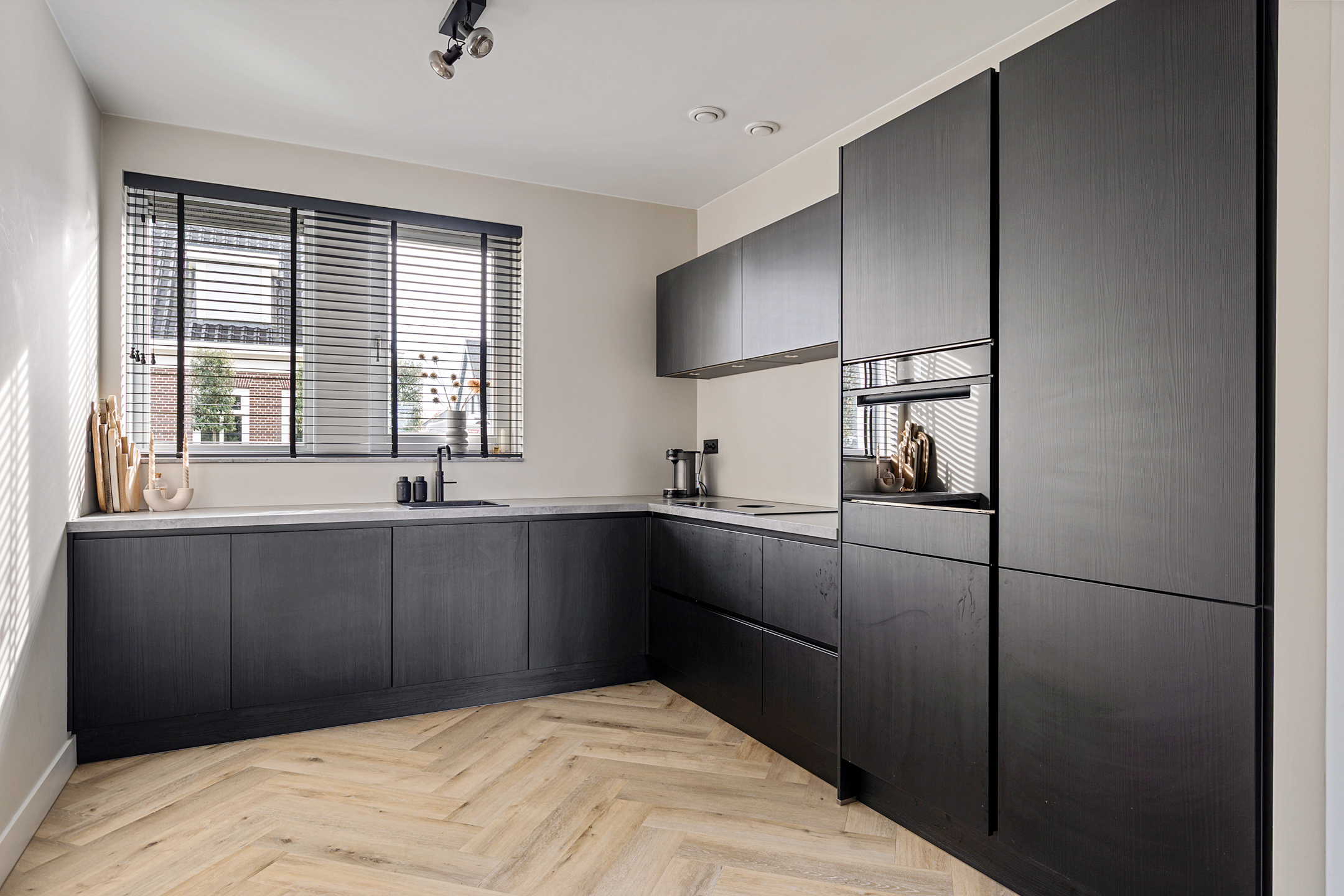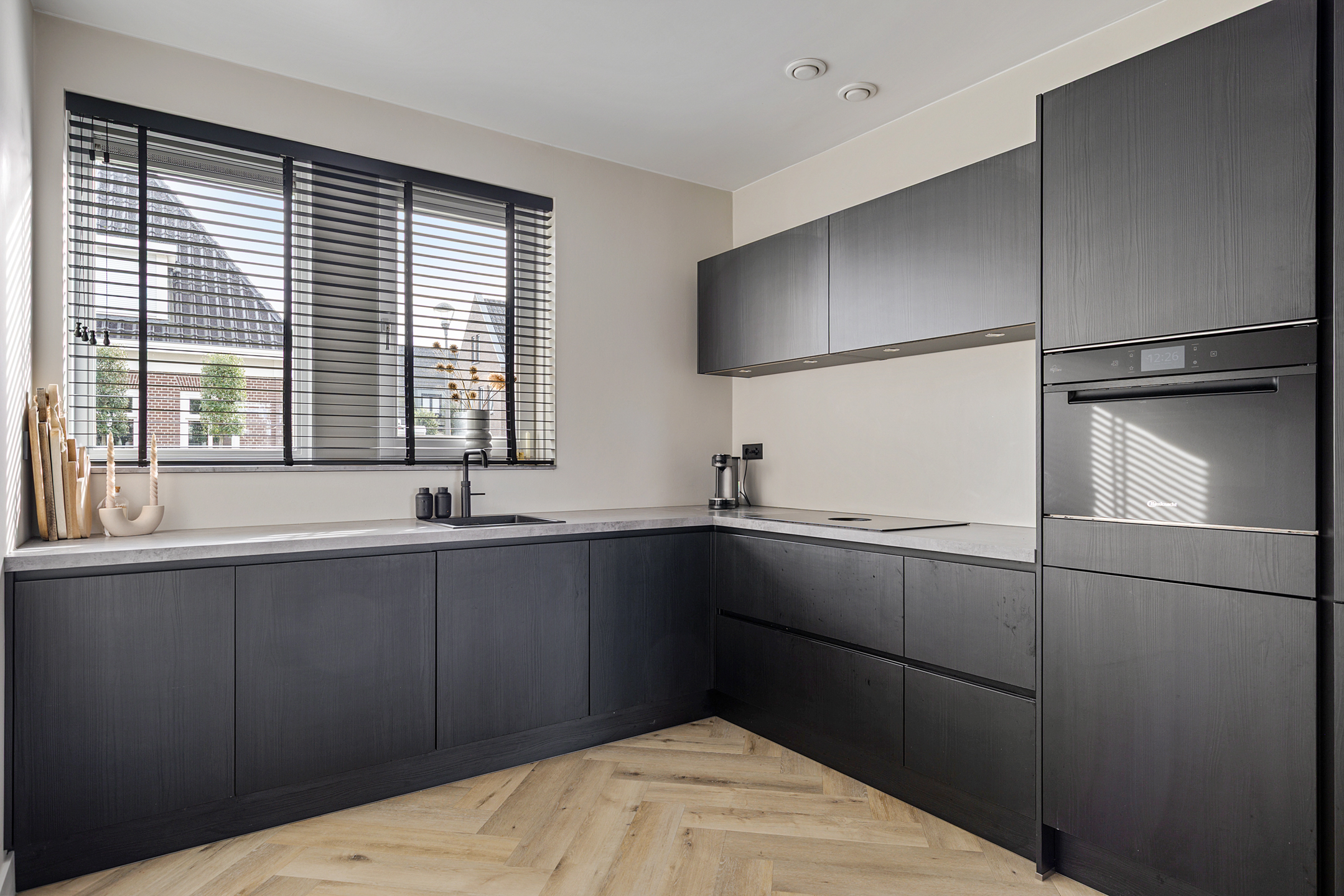 De open keuken aan de voorzijde van de woning is een waar pronkstuk. De strakke, zwarte keukenopstelling met greeploze fronten, een composiet werkblad en hoogwaardige inbouwapparatuur ademt luxe uit. De keuken is volledig uitgerust met o.a. een inductiekookplaat, afzuigkap, combi-oven, vaatwasser en koel-vriescombinatie. Dankzij de ruime opstelling heb je meer dan genoeg kastruimte én werkoppervlak, ideaal voor de kookliefhebber. De grote raampartij zorgt bovendien voor veel natuurlijk licht, waardoor koken hier niet alleen praktisch maar ook bijzonder prettig is.