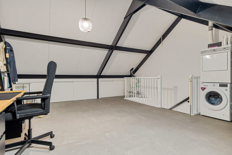 Via de vaste trap bereik je de tweede verdieping. Deze zolderkamer is verrassend ruim en multifunctioneel. Dankzij de rechte gevels is de ruimte uitstekend te benutten. Er is voldoende plek voor een extra slaapkamer, werkkamer of hobbyruimte. De keuze is aan jou! De wasmachine- en drogeraansluitingen zijn hier gesitueerd en er is nog genoeg ruimte over voor opbergkasten of een thuiswerkplek.