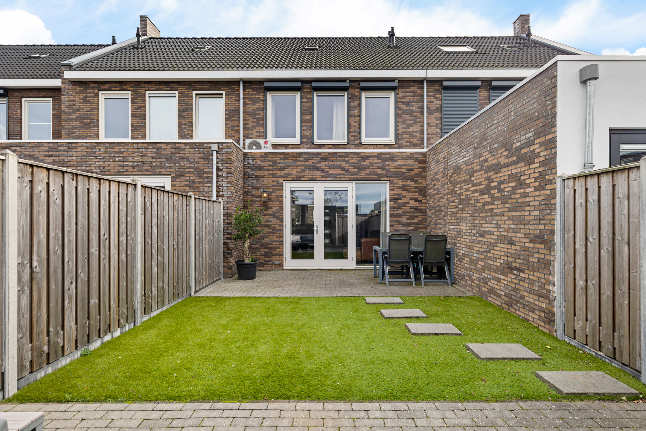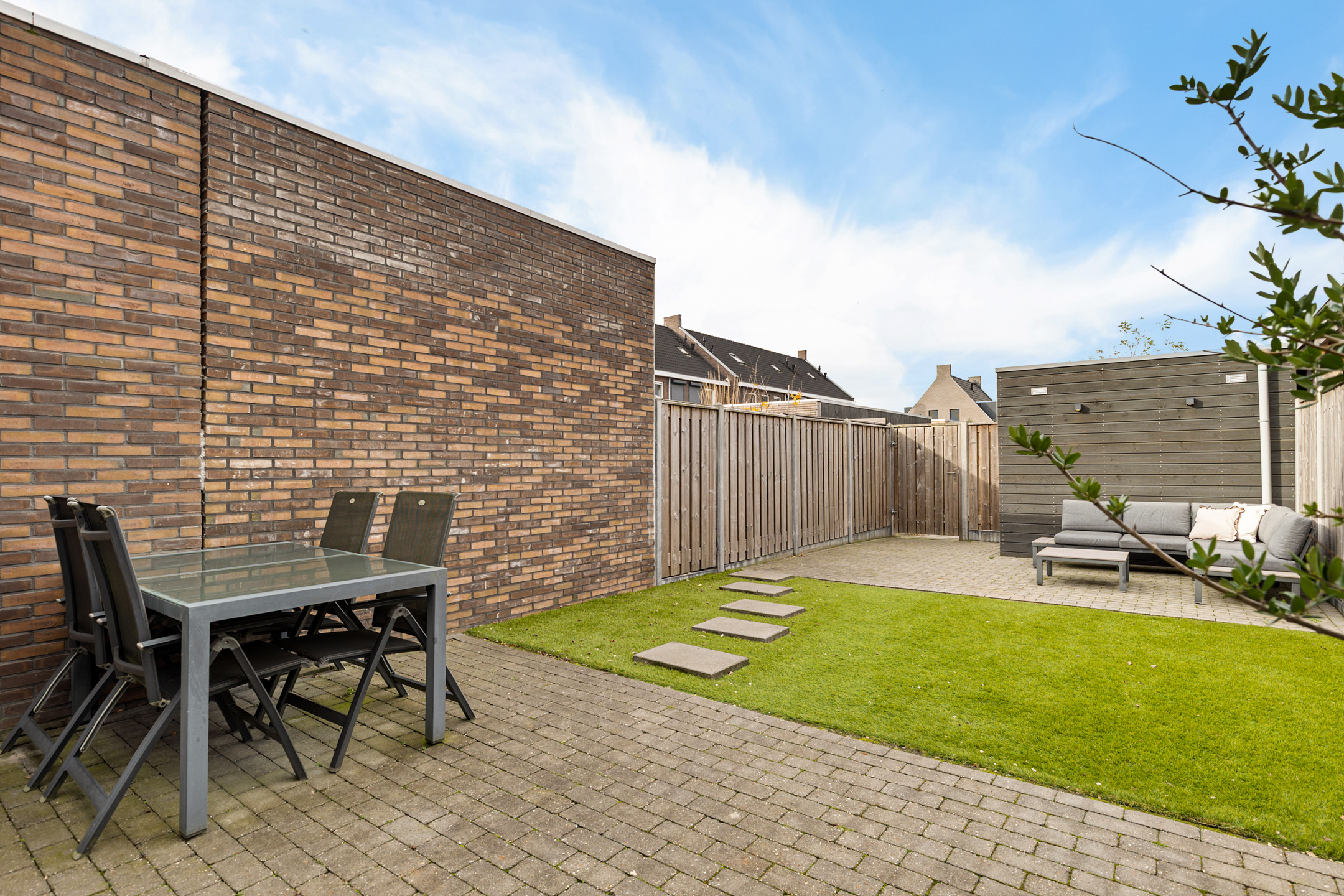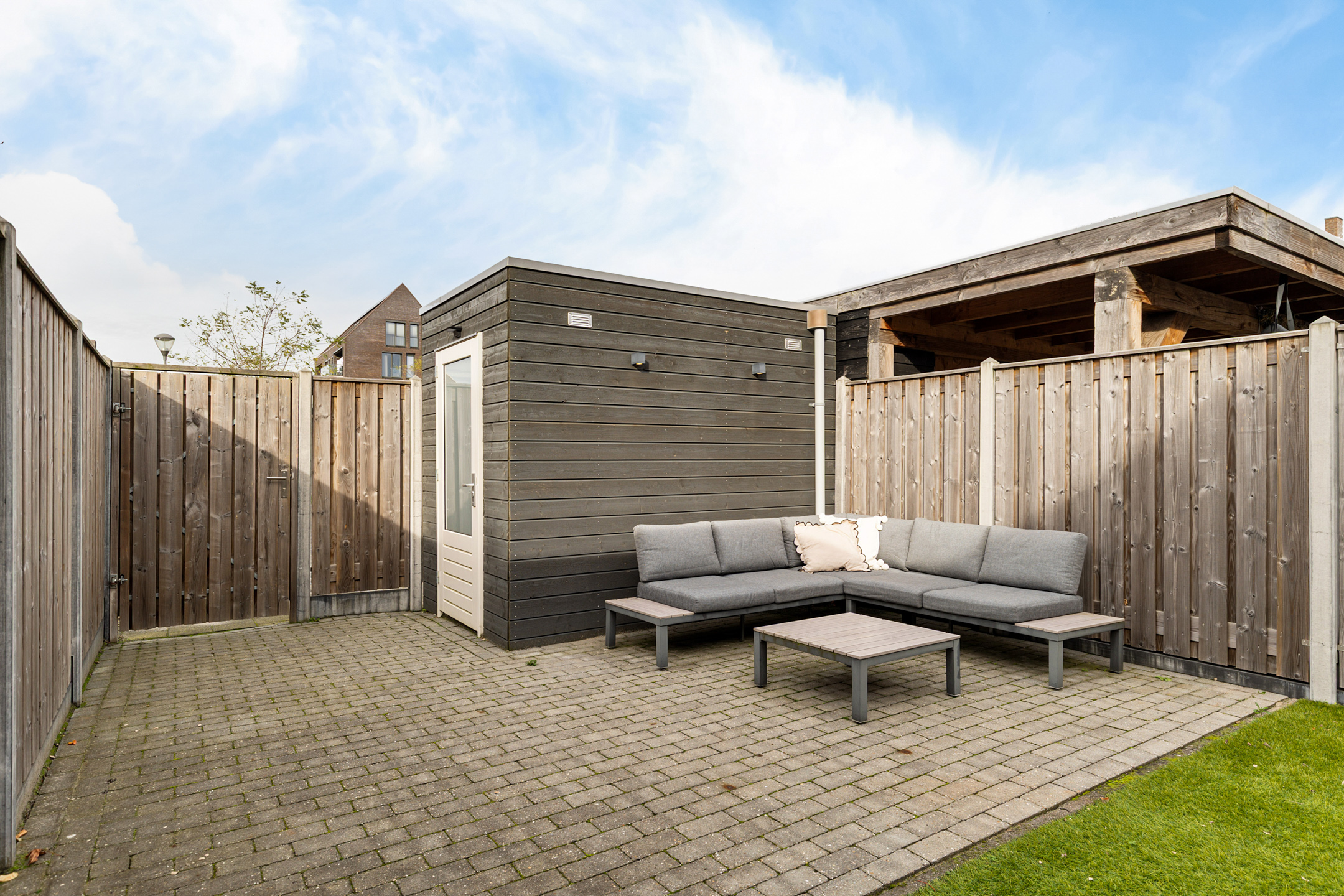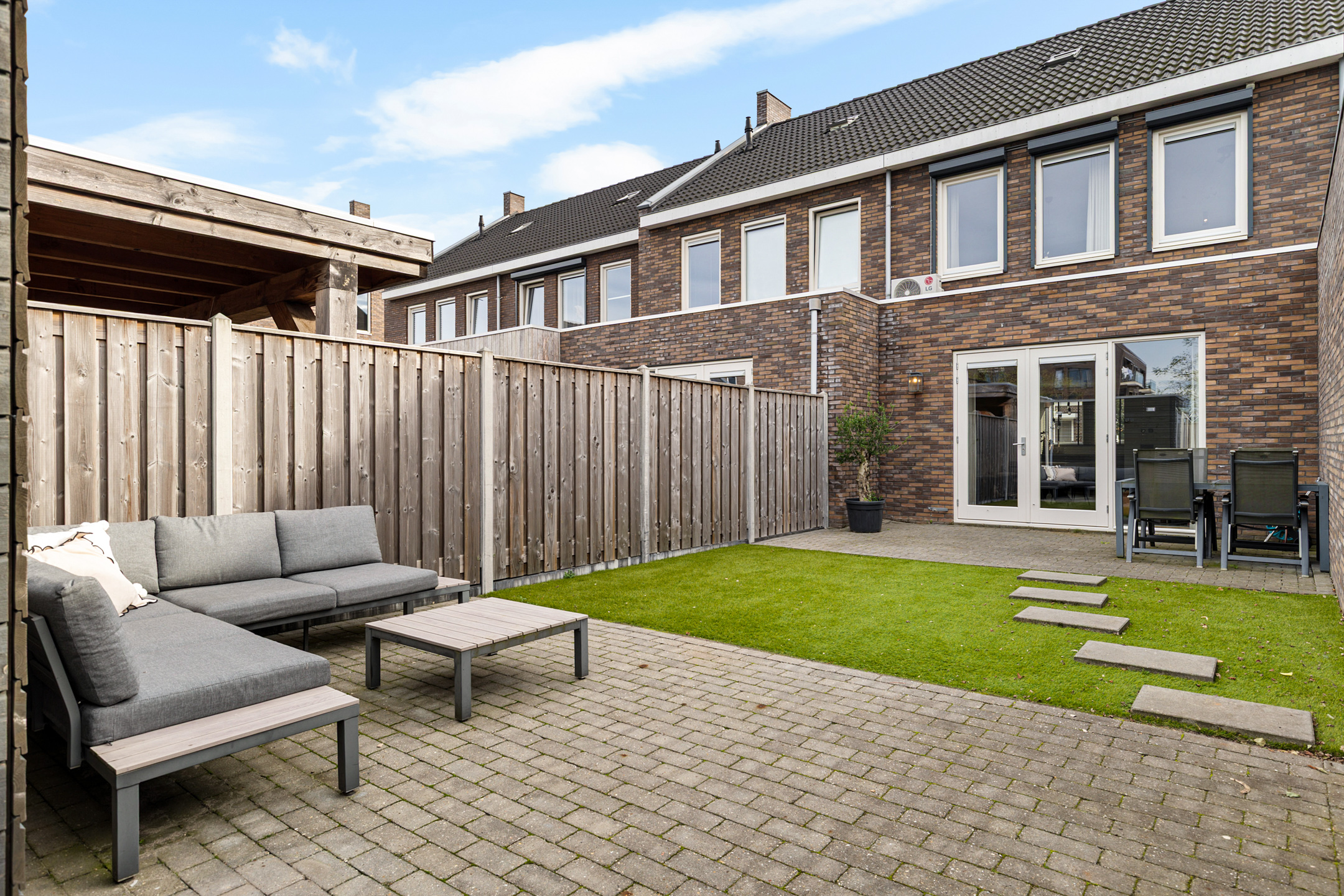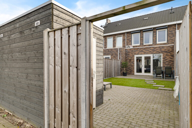 De achtertuin is een heerlijke plek om te genieten van het buitenleven. De tuin is onderhoudsvriendelijk aangelegd met sierbestrating, kunstgras en een terras direct aan de woning waar je gezellig kunt dineren of ontspannen met een goed boek. Achterin bevindt zich een berging met ruimte voor fietsen en tuingereedschap, bereikbaar via een achterom.