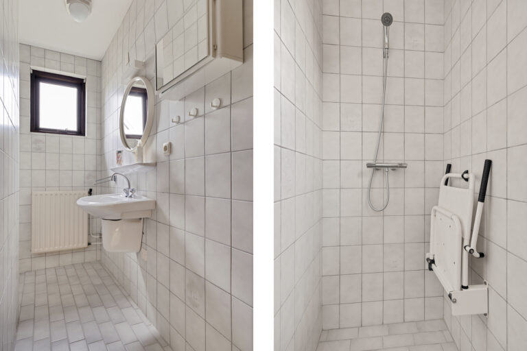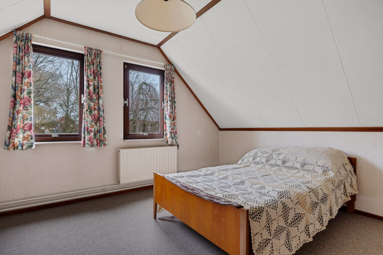 Op de begane grond bevindt zich ook een slaapkamer, waardoor gelijkvloers wonen hier tot de mogelijkheden behoort. Deze slaapkamer is rustig gelegen en biedt voldoende ruimte voor een tweepersoonsbed en kasten. De badkamer is centraal gesitueerd en voorzien van een douche en wastafel. Het separate toilet is vanuit de hal bereikbaar, wat extra comfort geeft.