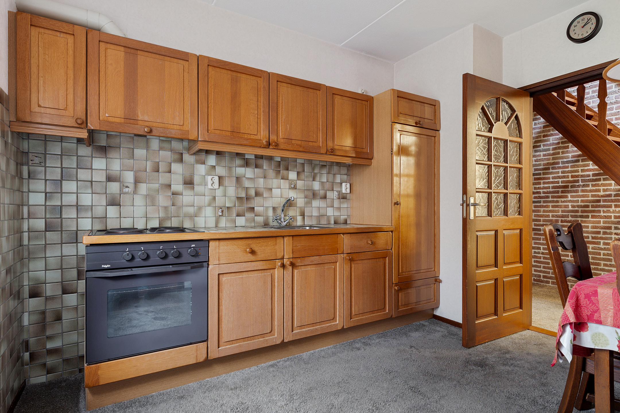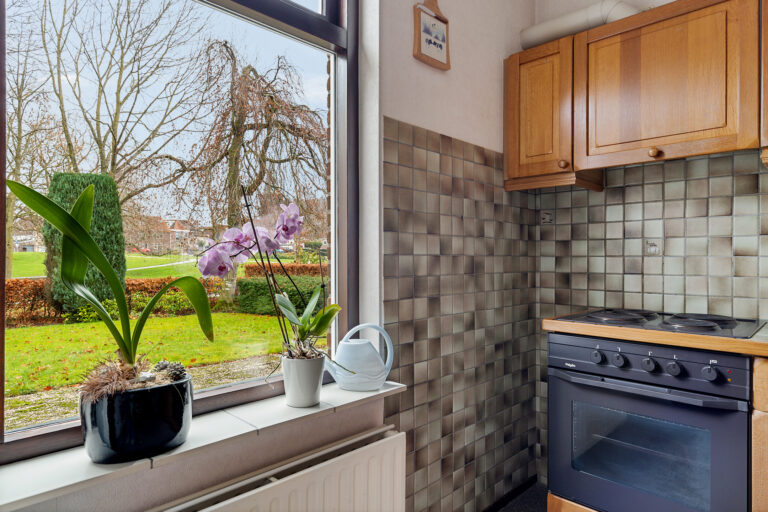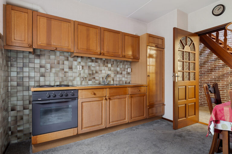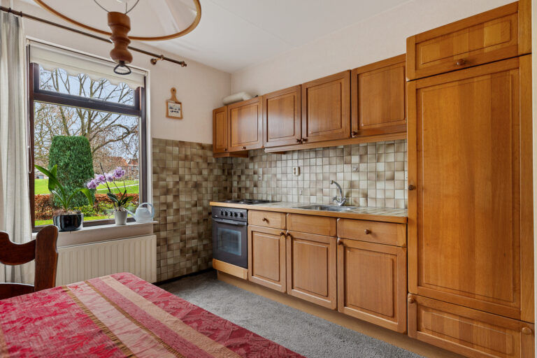 Aansluitend bereik je de keuken. Deze kijkt uit op de tuin en is praktisch ingericht met voldoende kastruimte. De keuken biedt volop mogelijkheden om naar eigen smaak te moderniseren en vormt samen met de woonkamer een fijne basis voor het dagelijkse leven.