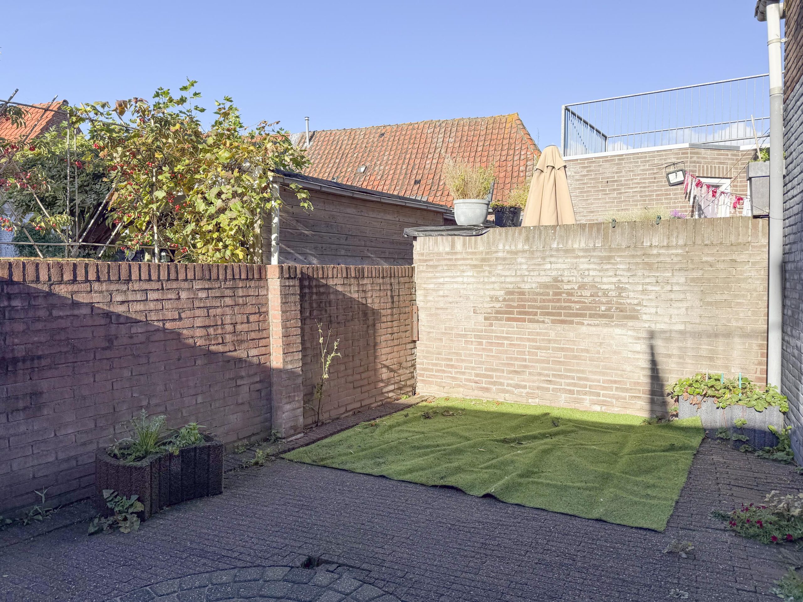De achtertuin is onderhoudsvriendelijk aangelegd met sierbestrating en biedt volop mogelijkheden om je eigen stijl te creëren. Plaats mooie bloempotten voor een groene uitstraling of richt een gezellige loungeset in om de perfecte sfeer te maken voor lange zomeravonden. Daarnaast bestaat de optie om een achterom te realiseren via het achterpad, wat extra gemak biedt.