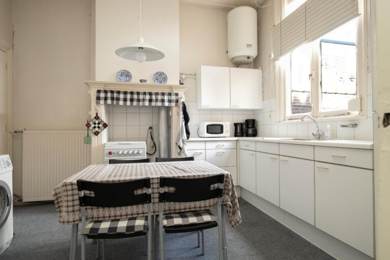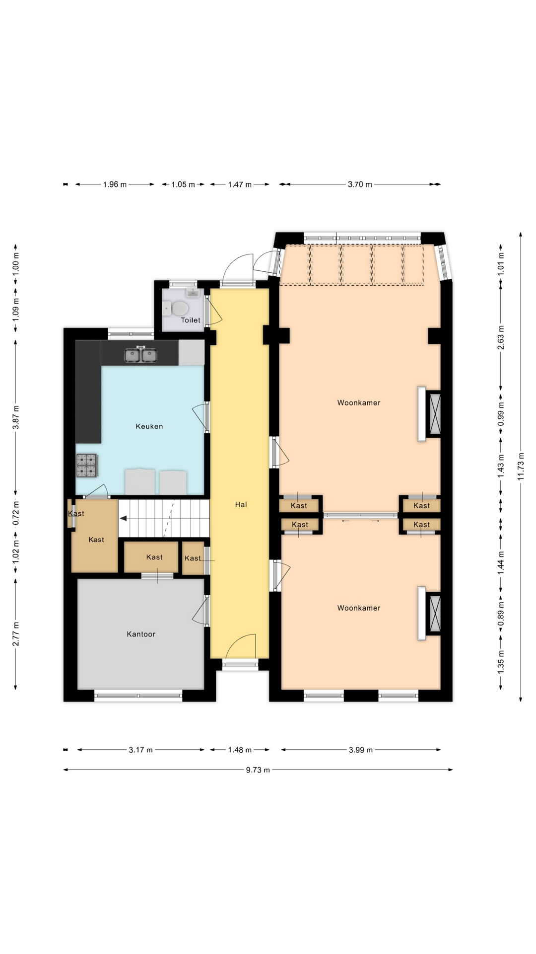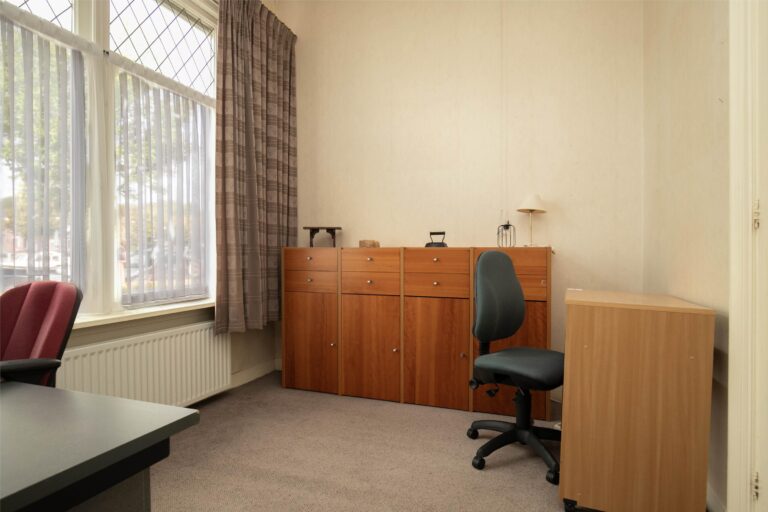 Aan de achterzijde bevindt zich een voormalige kantoorruimte, uitstekend geschikt als werkkamer, atelier of speelruimte. De keuken ligt aan de achterzijde. Zowel keuken als sanitair zijn eenvoudig van uitvoering, maar de ruimte biedt volop mogelijkheden voor het realiseren van een moderne leefkeuken met zicht op de diepe achtertuin.