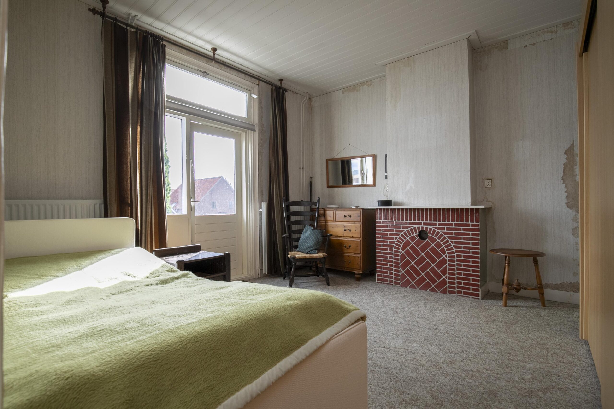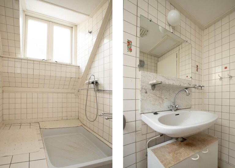 Op de eerste verdieping bevinden zich vier royale slaapkamers, elk met grote raampartijen en hoge plafonds. De huidige badkamer is compact en eenvoudig, maar de verdieping biedt voldoende ruimte voor het creëren van een ruime, moderne badkamer. Vanuit twee slaapkamers is toegang tot het balkon aan de achterzijde, waar u uitkijkt over de tuin en de karakteristieke bebouwing. Diverse vaste kasten zorgen voor extra bergruimte.