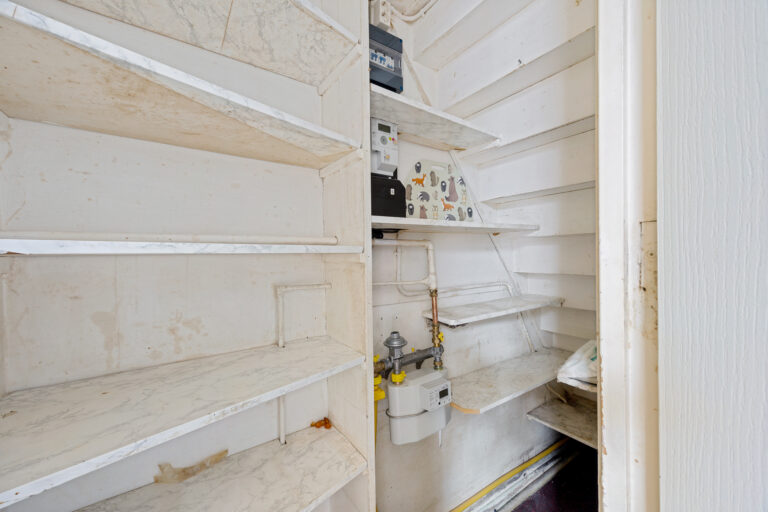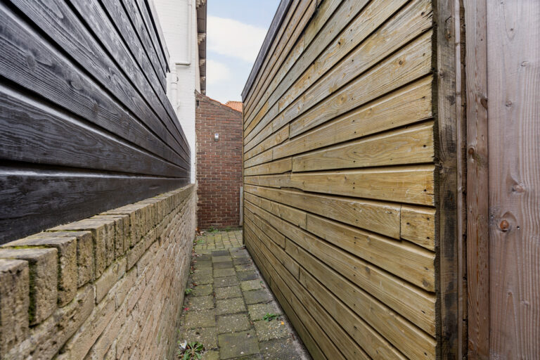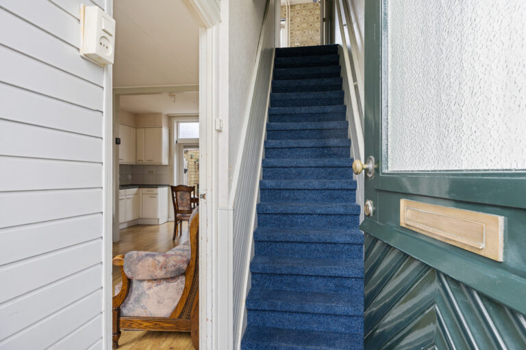 Via de openslaande deuren loop je zo de achtertuin in, wat zorgt voor een fijne verbinding tussen binnen en buiten. Aansluitend aan de keuken vind je de een tweede hal, waar zich de toiletruimte bevindt en extra praktische ruimte is voor het opslaan van voorrad. Vanuit hier heb je eveneens toegang tot de tuin.
