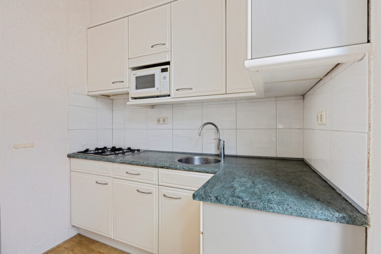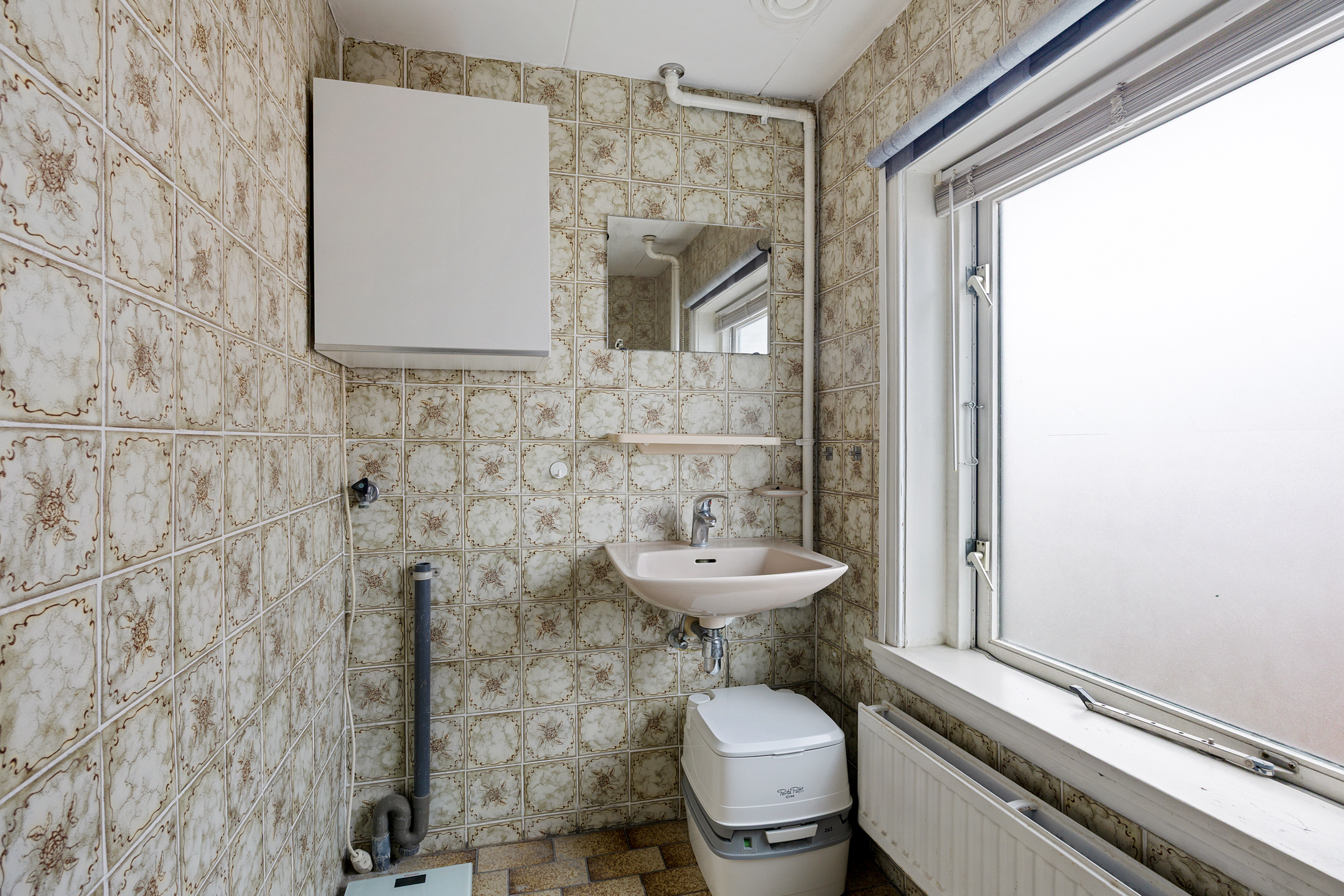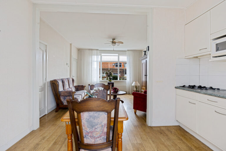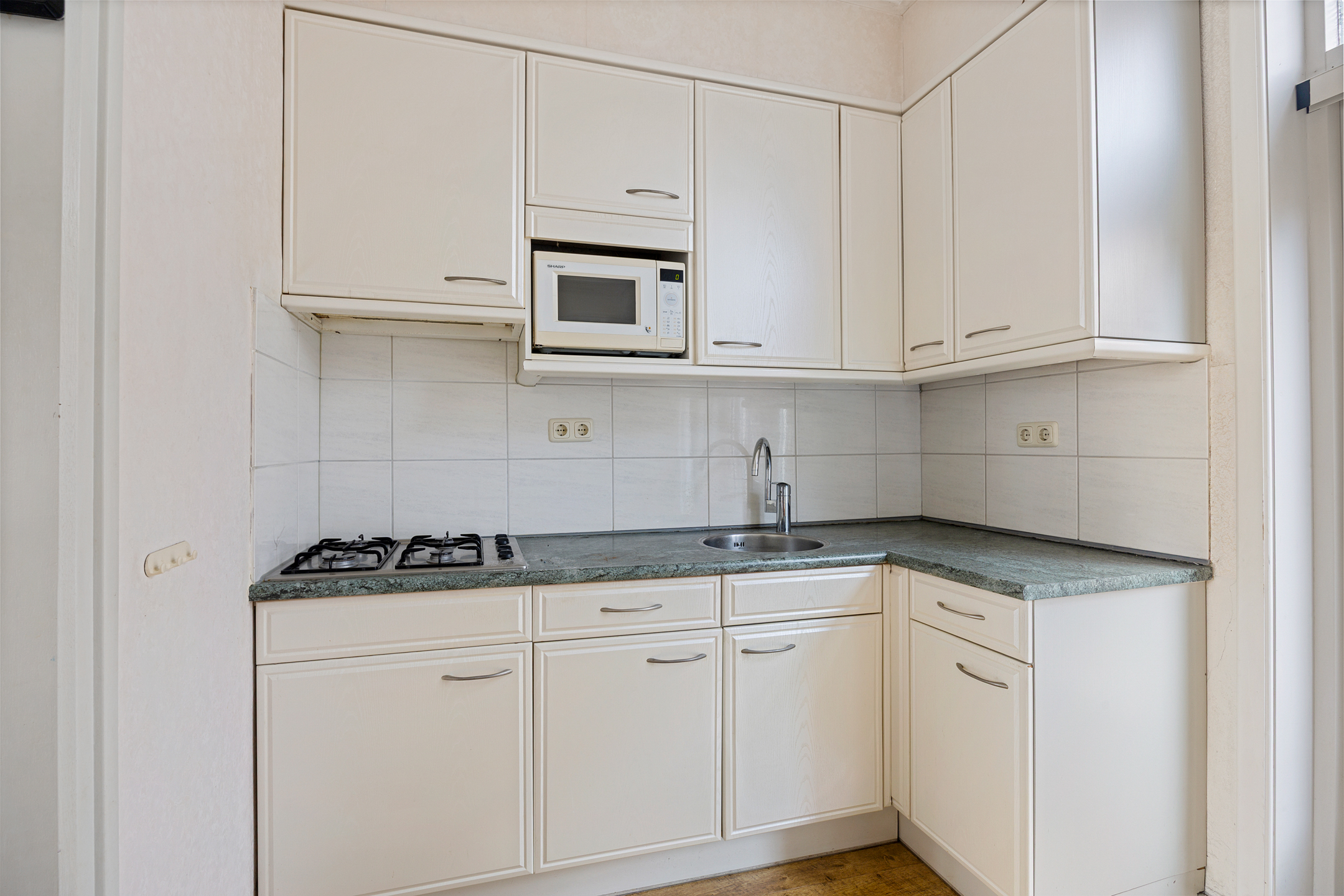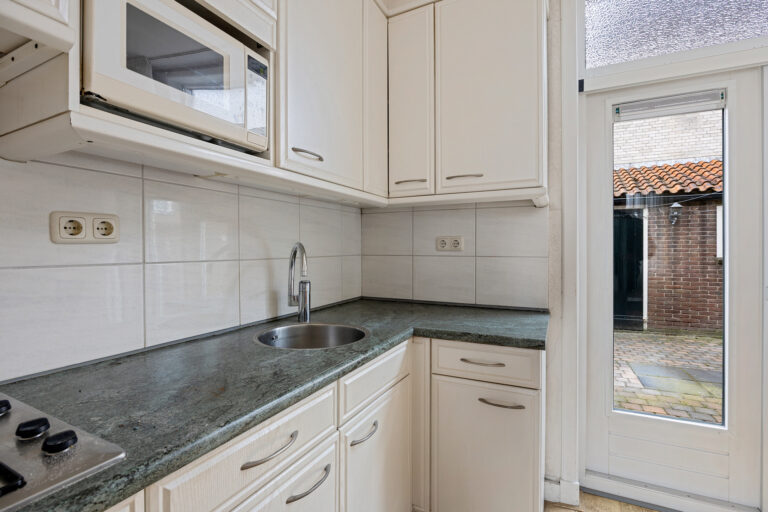 Aan de achterzijde bevindt zich de keuken, met uitzicht op de tuin. De keuken is eenvoudig uitgevoerd, maar biedt een uitstekende basis voor het realiseren van een moderne, open of halfopen keuken. Denk bijvoorbeeld aan het betrekken van de keuken bij de woonkamer voor één grote leefruimte, een mooie kans om helemaal naar eigen smaak te moderniseren.
