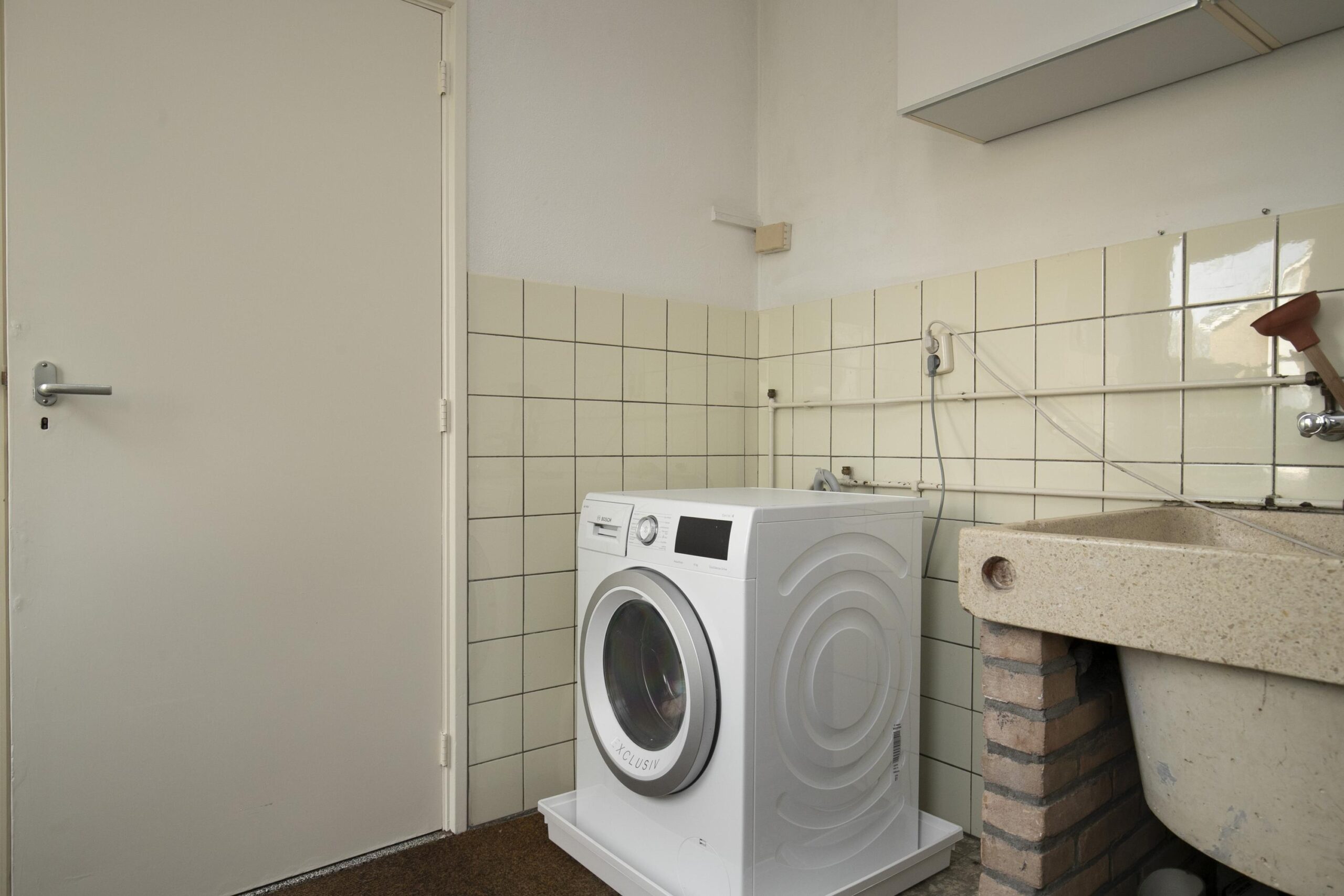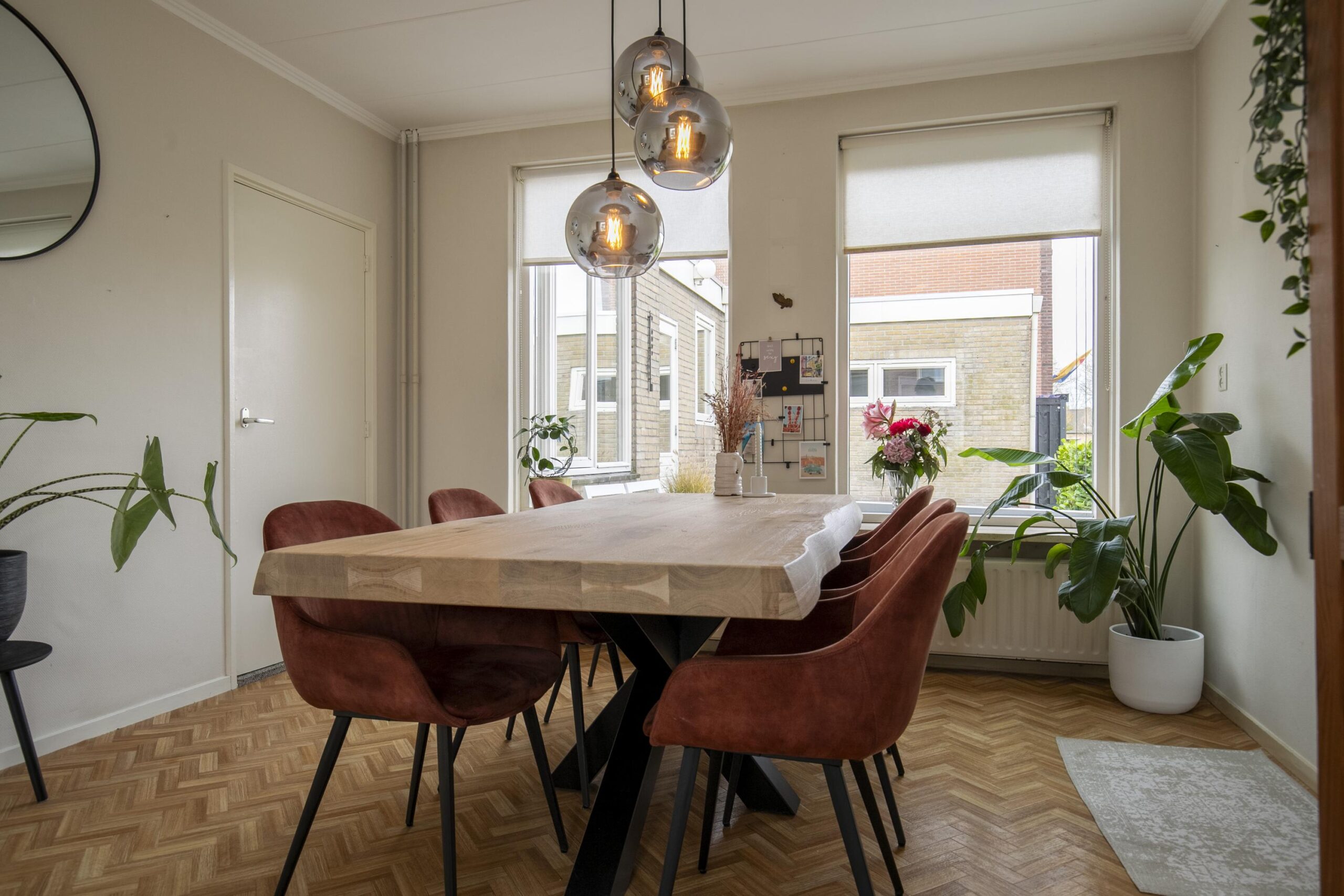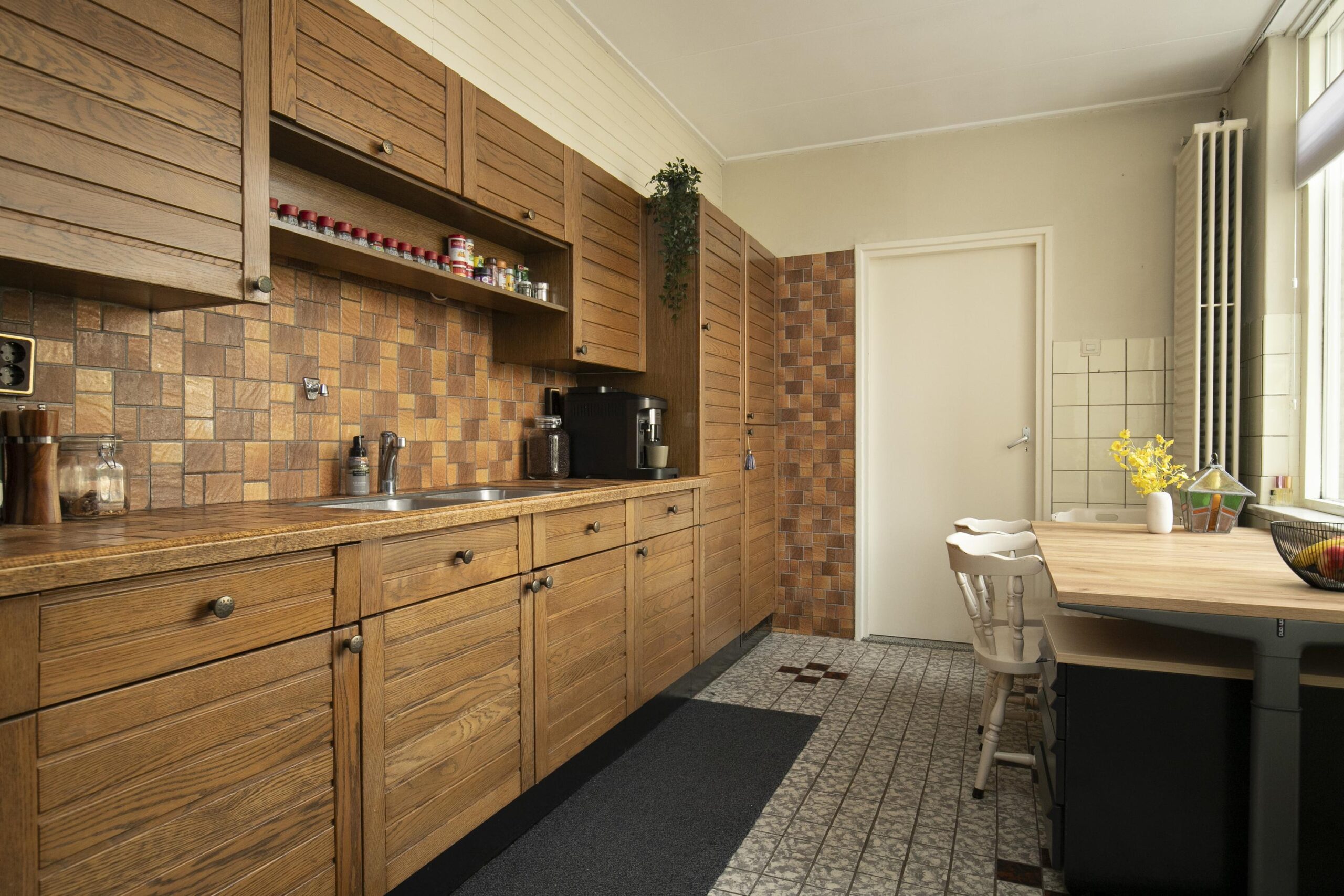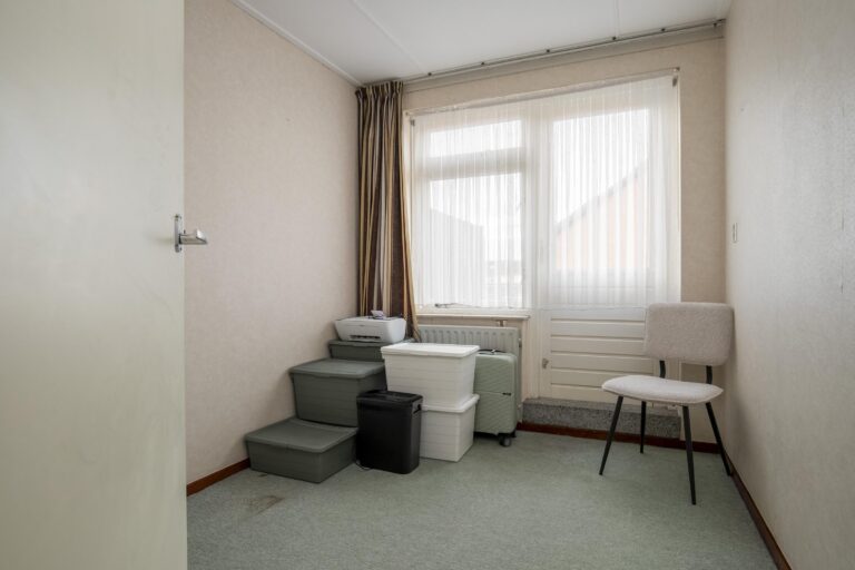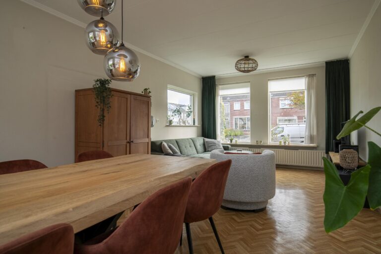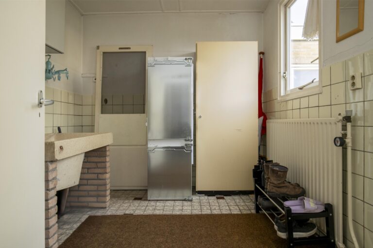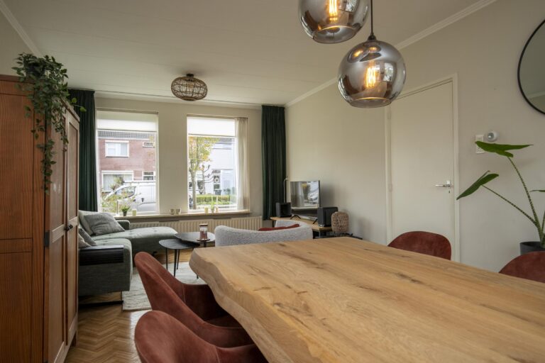 Bij binnenkomst in de woonkamer valt direct de lengte en het licht op. De grote ramen aan beide zijden zorgen voor een prettige daglichtinval en een ruimtelijk gevoel. Aan de voorzijde is ruimte voor een gezellige zithoek, terwijl het eetgedeelte aan de tuinzijde is gesitueerd. Een fijne plek voor lange avonden tafelen. Via het eetgedeelte bereik je de dichte keuken aan de achterzijde. Deze keuken beschikt over volop kast- en werkruimte en biedt een mooie basis om geheel naar eigen smaak te moderniseren. Aansluitend aan de keuken bevindt zich de bijkeuken, een praktische ruimte met wasmachineaansluiting, wastafel en extra opbergmogelijkheden. Vanuit de bijkeuken stap je zo de achtertuin in.