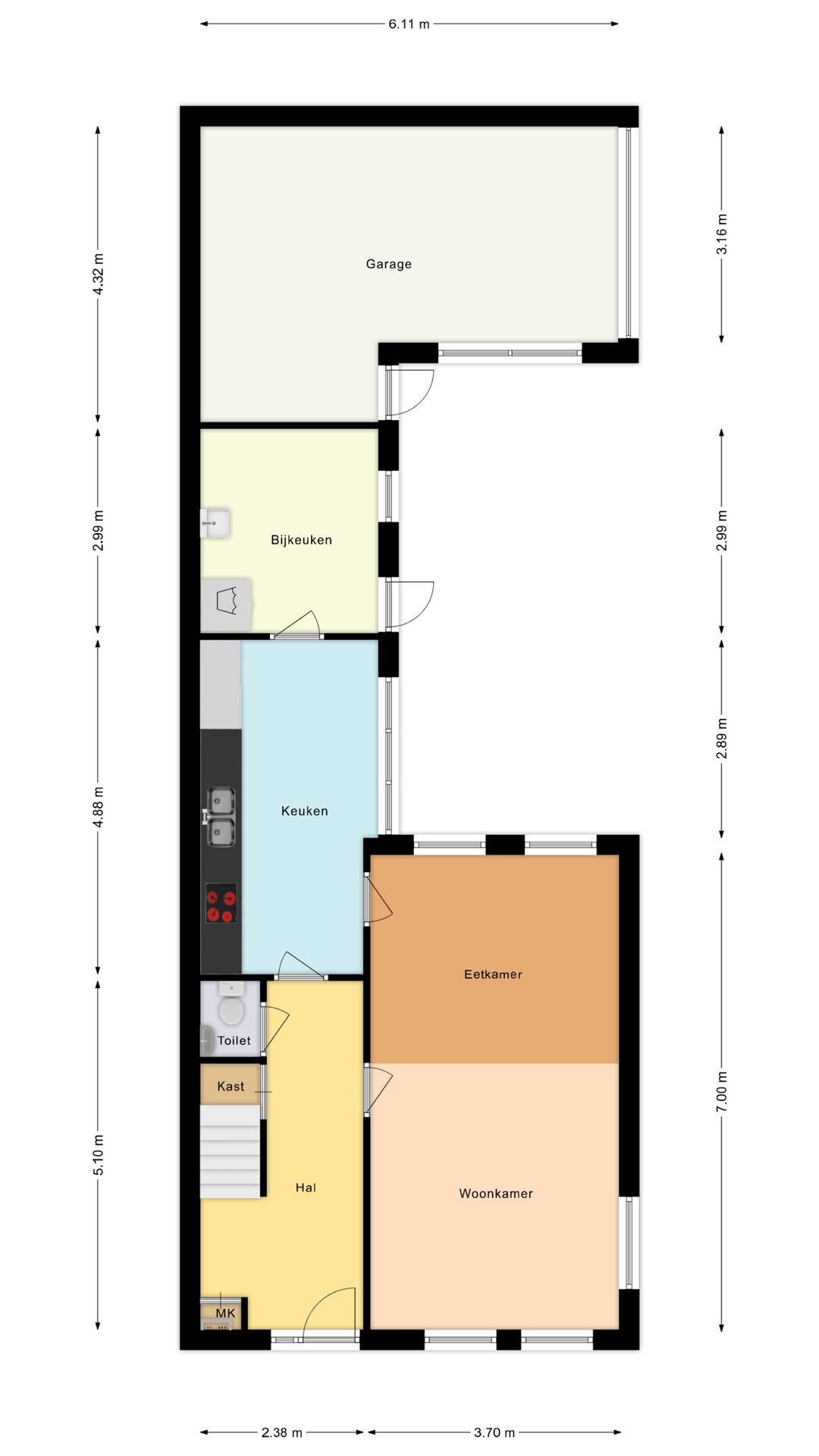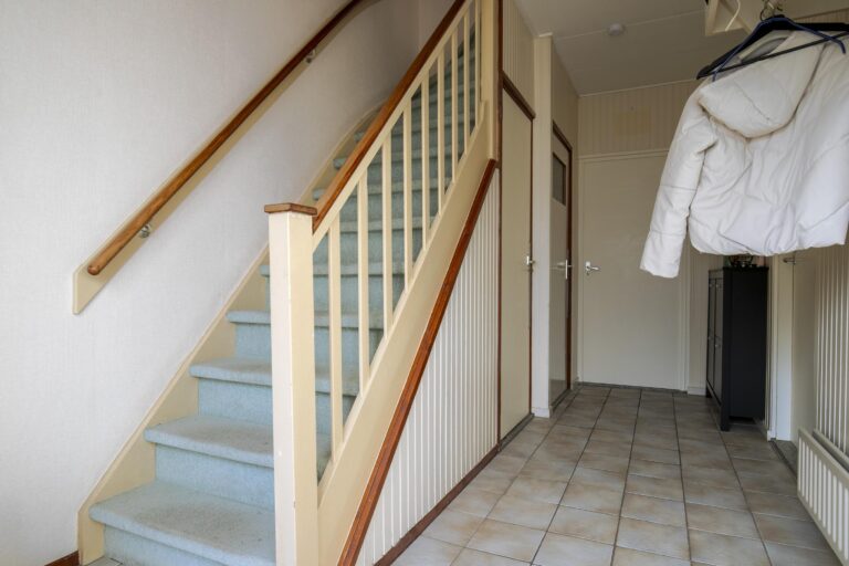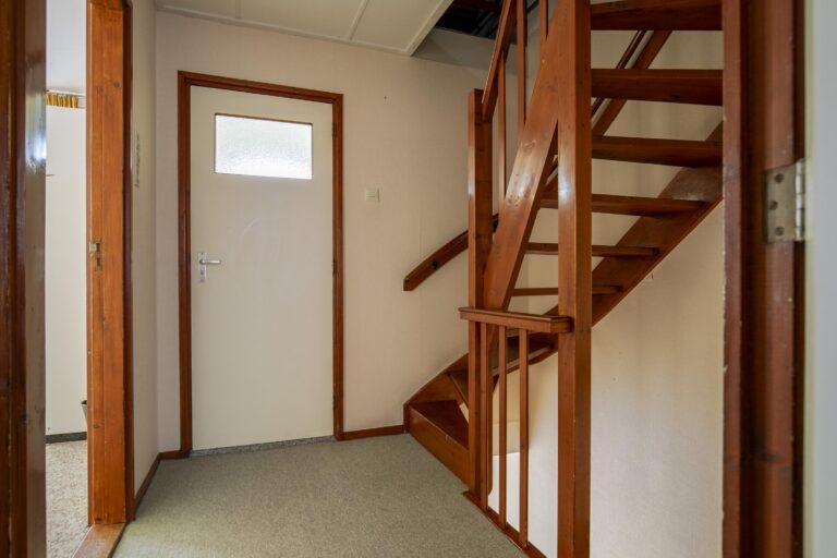 Via de voordeur kom je binnen in de ruime hal. Hier vind je de meterkast, trapopgang, trapkast en het toilet. De hal biedt toegang tot zowel de woonkamer als de keuken.