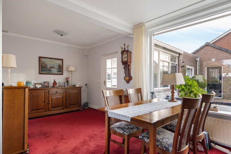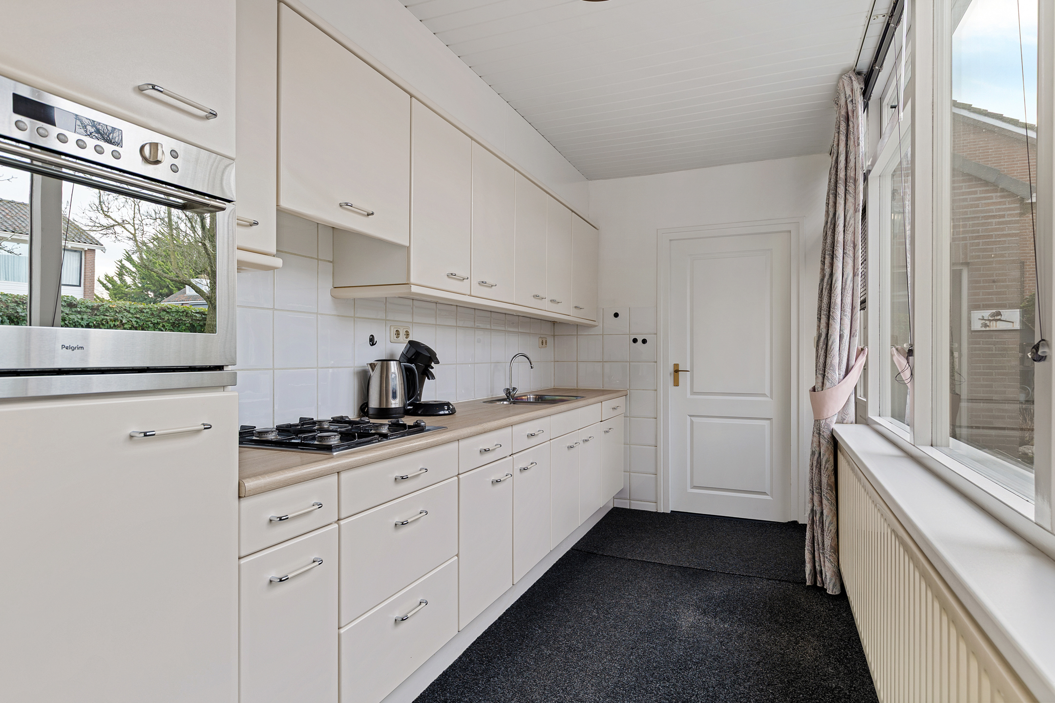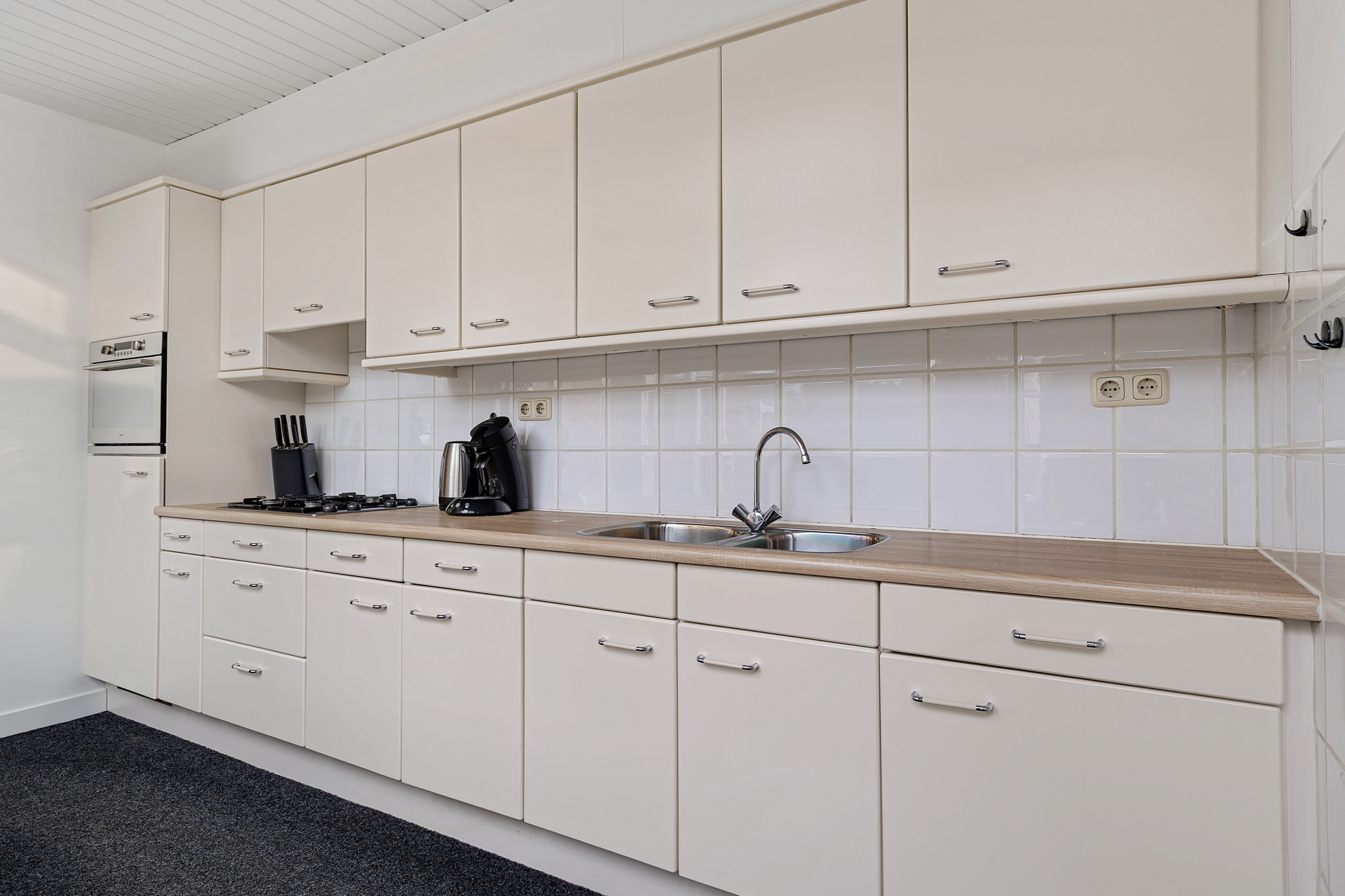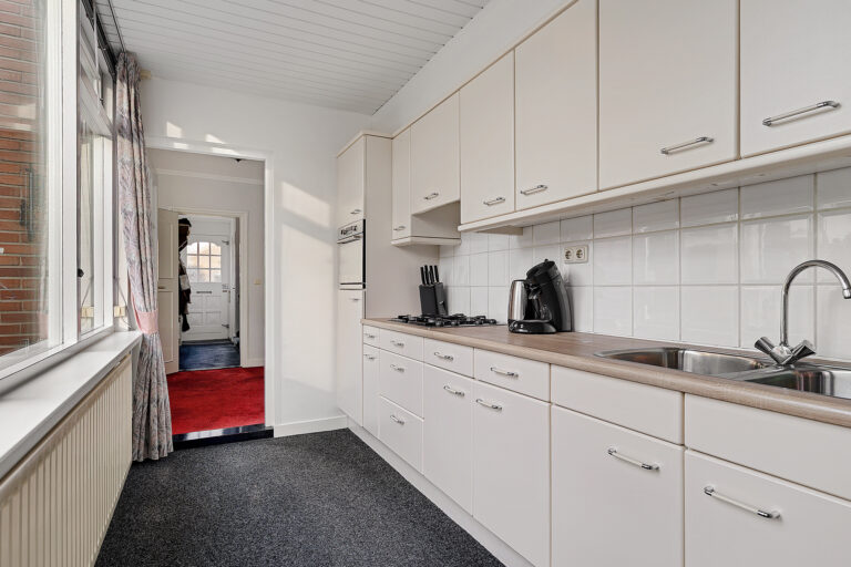 Aansluitend bevindt zich de lange keuken. Deze keuken biedt volop werk- en bergruimte, maar kan wel een moderniseringsslag gebruiken. Juist dat maakt dit een ideale plek om jouw droomkeuken te realiseren. Dankzij de grote ramen is het ook hier lekker licht en is er ruimte voor een knusse koffiehoek. Vanuit de keuken loop je door naar de bijkeuken, waar de wasmachine en droger staan en waar extra opbergruimte beschikbaar is.