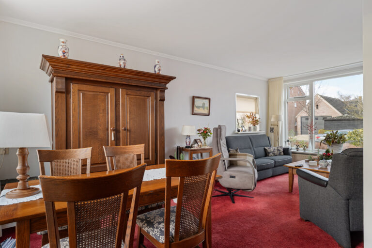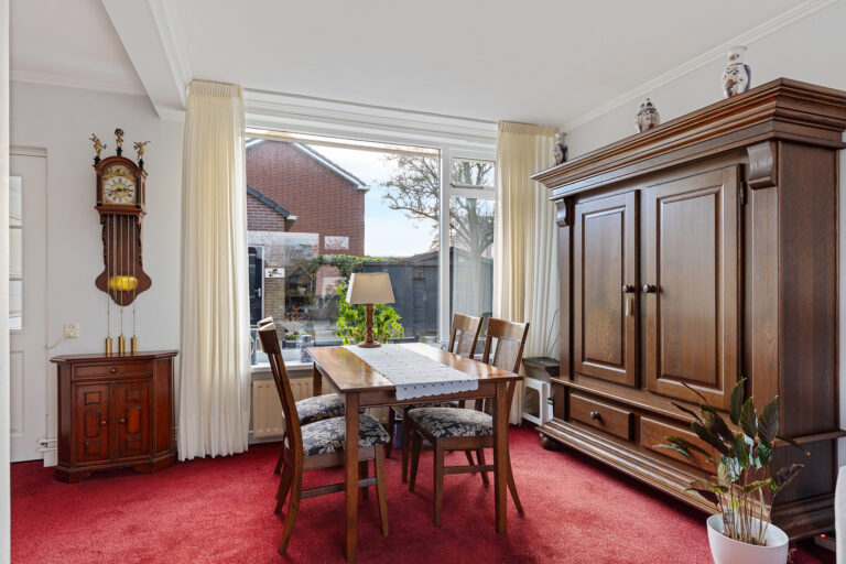 Je komt binnen via de entree met toilet en trapopgang naar boven. Vanuit hier stap je de ruime woonkamer in, waar met gemak plek is voor een gezellige zithoek én een grote eettafel. Door de ramen aan zowel de voor- als achterzijde valt het daglicht rijkelijk naar binnen, wat zorgt voor een fijne, open sfeer.