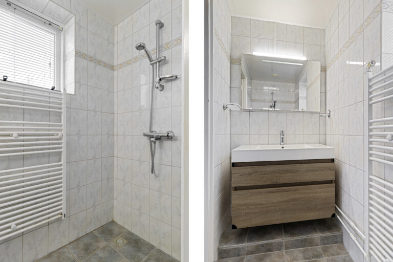 De badkamer is compact uitgevoerd en beschikt over een douche, designradiator en wastafel. Het wastafelmeubel is recent vernieuwd.