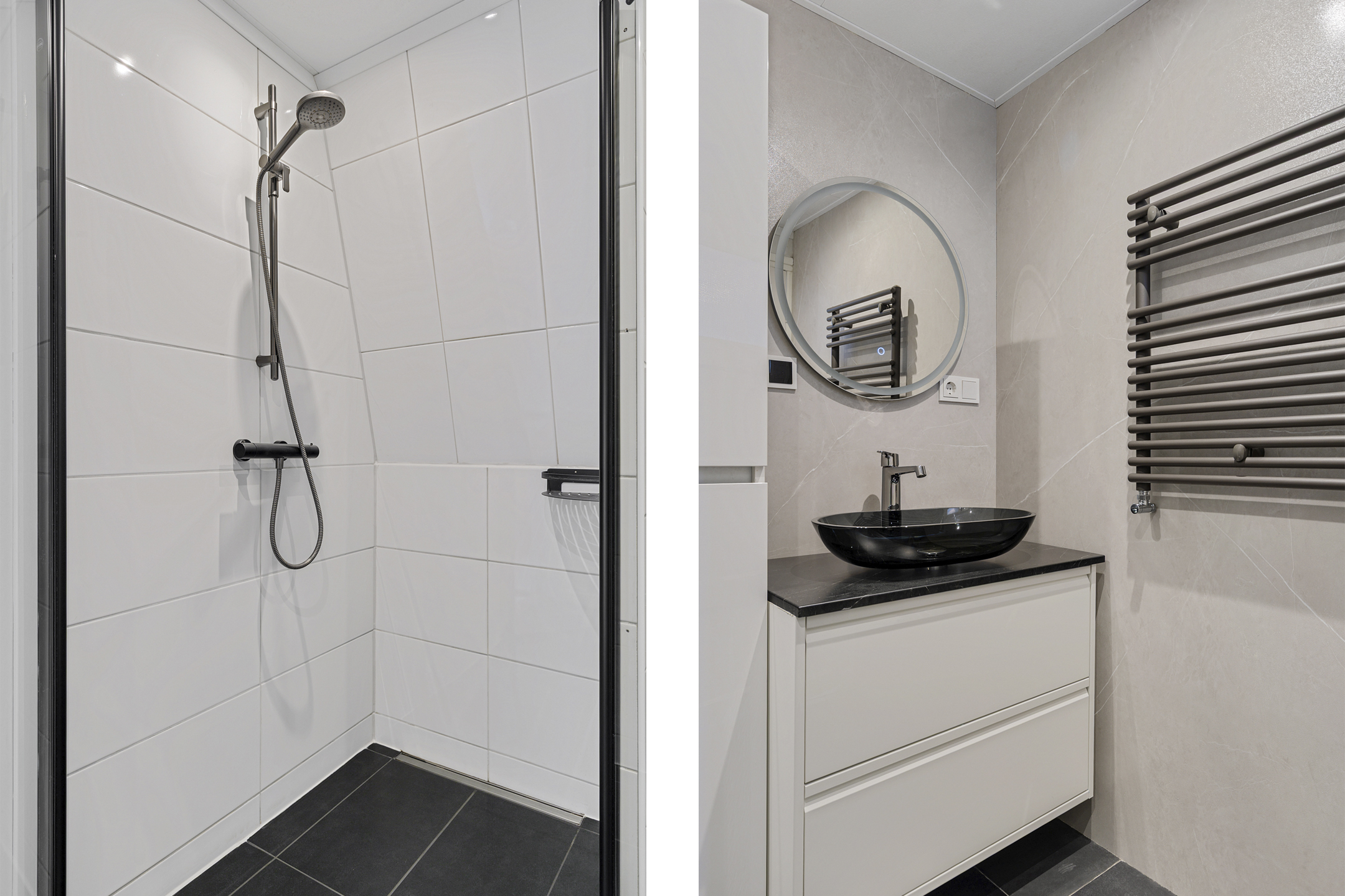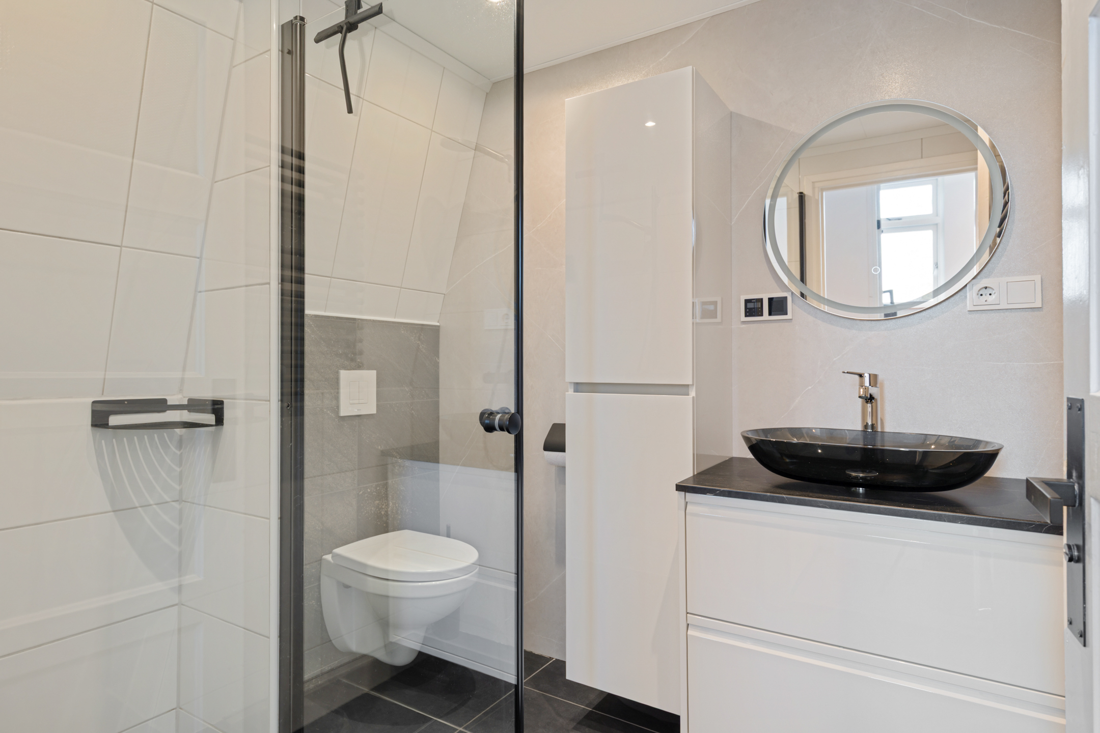 De moderne badkamer is 3 jaar geleden compleet vernieuwd. In deze moderne uitvoering vind je een wastafelmeubel, een douche en toilet. Daarnaast bevindt zich hier elektrische afzuiging.