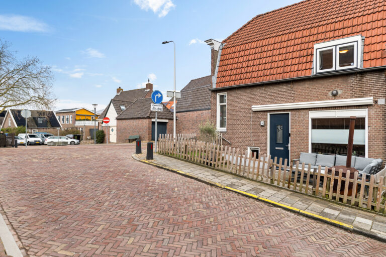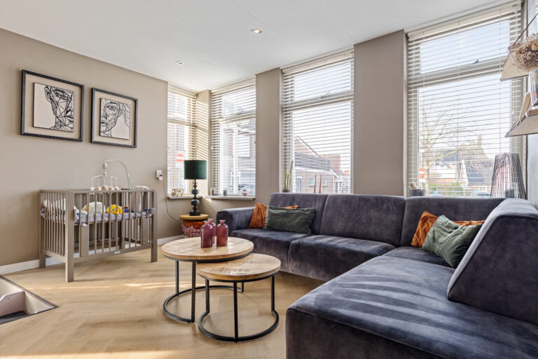 Via de voordeur bereik je met de trap de gezellige woonkamer. Hier vind je een fijne zithoek waar je heerlijk kunt ontspannen na een lange dag. De woning heeft door het hoogteverschil tussen de woonkamer en de keuken een speels splitlevel-effect – kenmerkend voor een dijkwoning. Dit zorgt niet alleen voor karakter, maar ook voor een leuke dynamiek in de leefruimte.