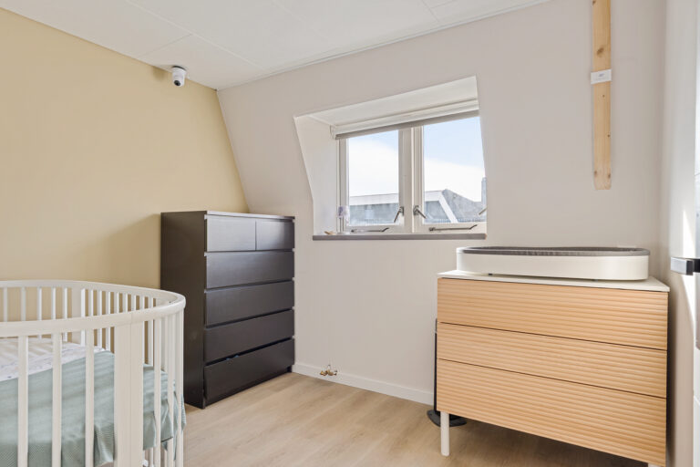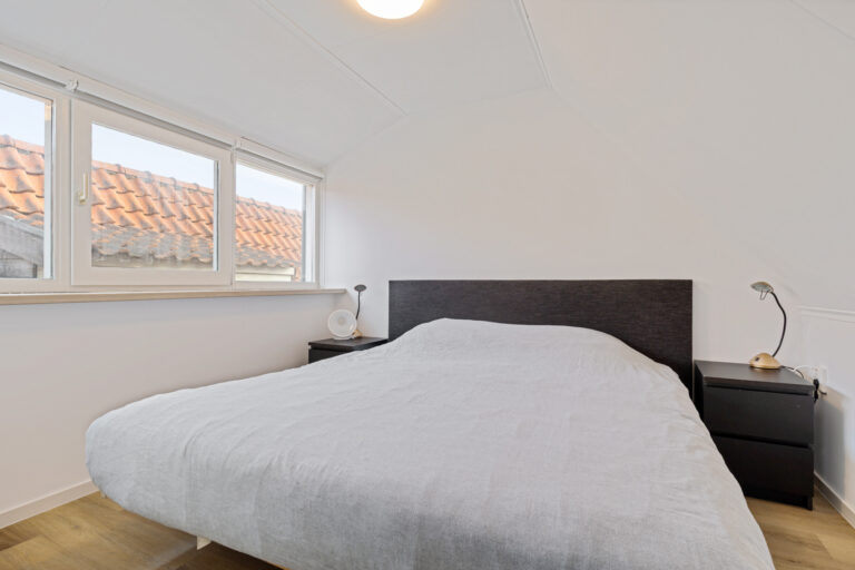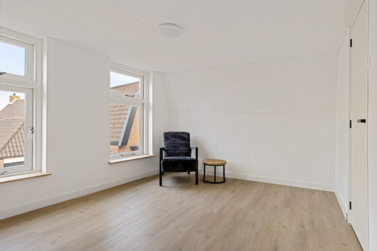 De tweede verdieping biedt nog een derde slaapkamer. De praktische verhoging naar de vliering zorgt voor extra bergruimte én geeft de kamer een speels karakter.