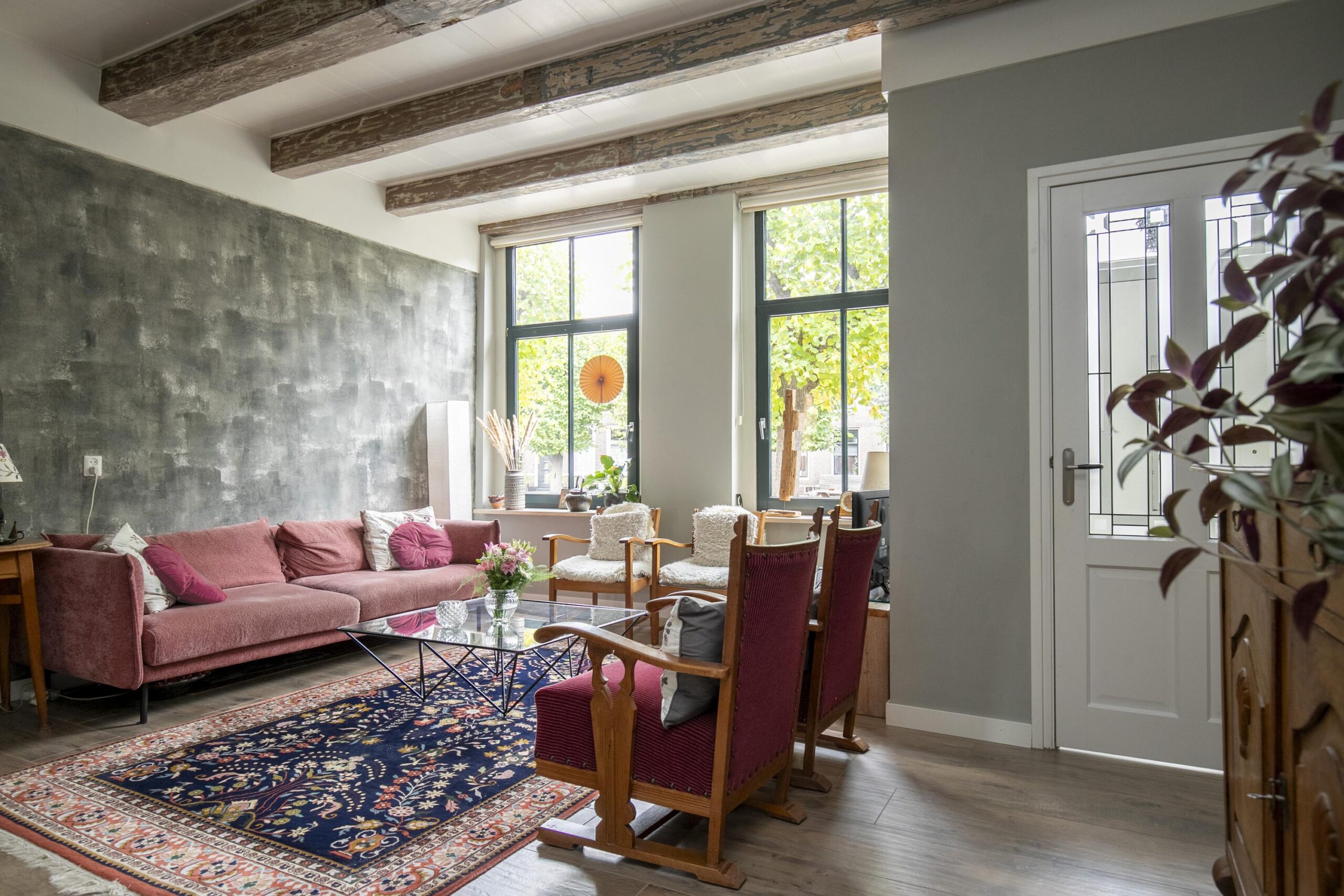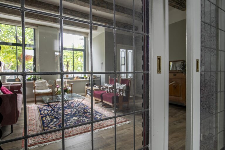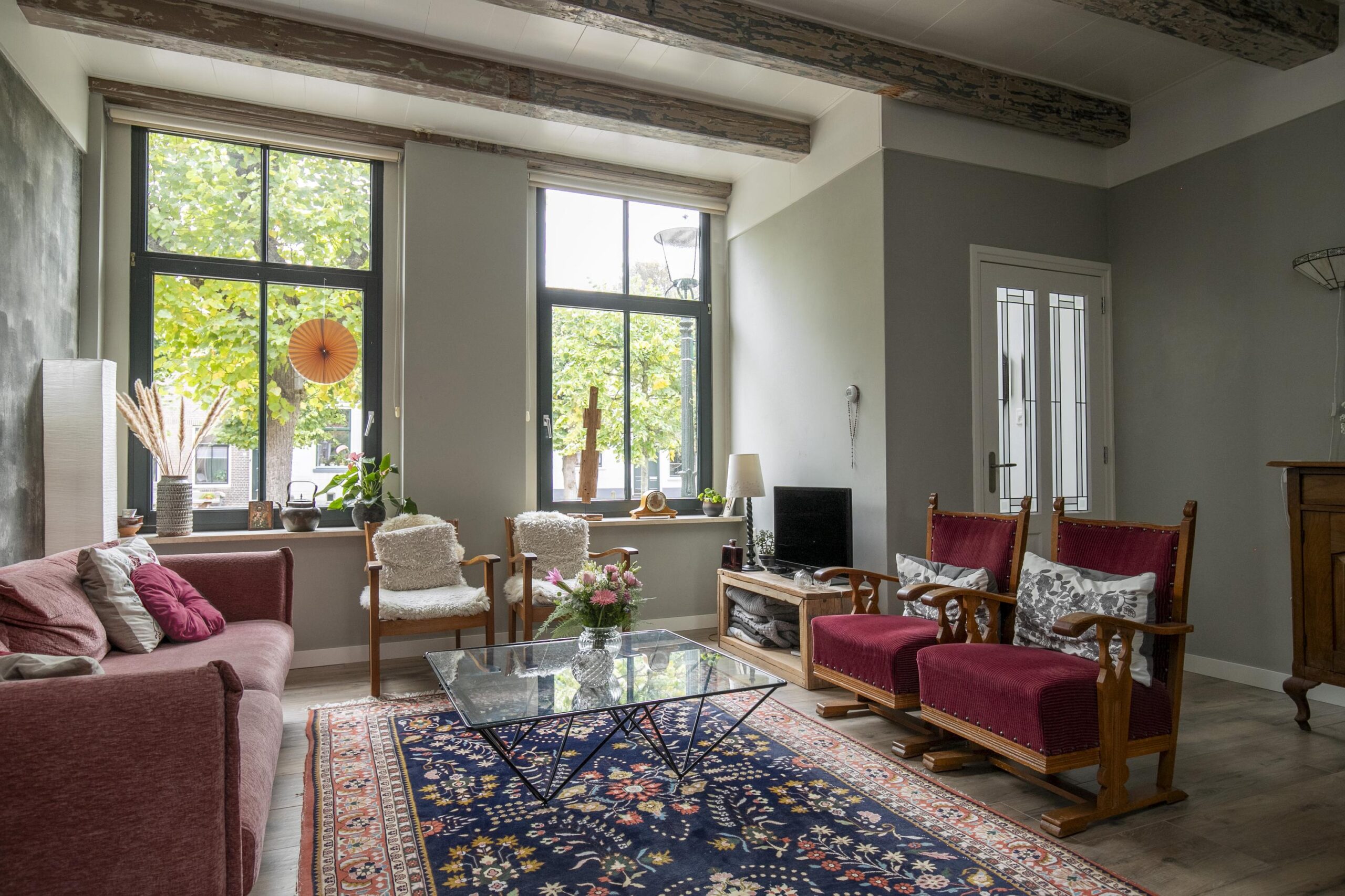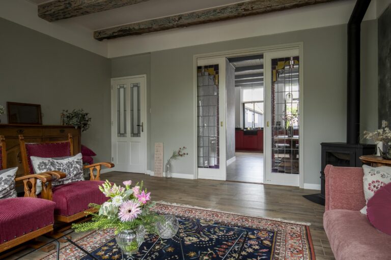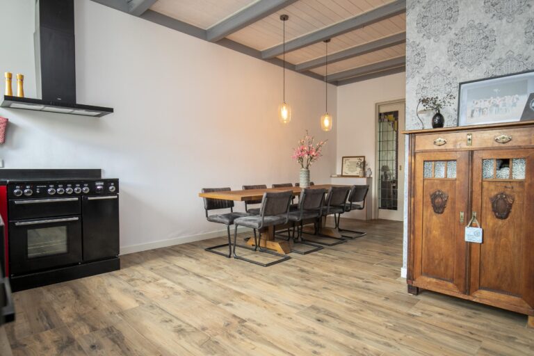Via het charmante voorportaal stap je de woning binnen in de ruime woonkamer. De grote ramen aan de voorzijde zorgen voor een prachtige lichtinval en bieden uitzicht op de gracht. De authentieke balken aan het plafond geven de ruimte karakter, terwijl de gladde wanden en keramische tegels met houtlook voor een moderne afwerking zorgen. Het is een sfeervolle leefruimte waar oud en nieuw samenkomen. Perfect om te ontspannen of vrienden te ontvangen.