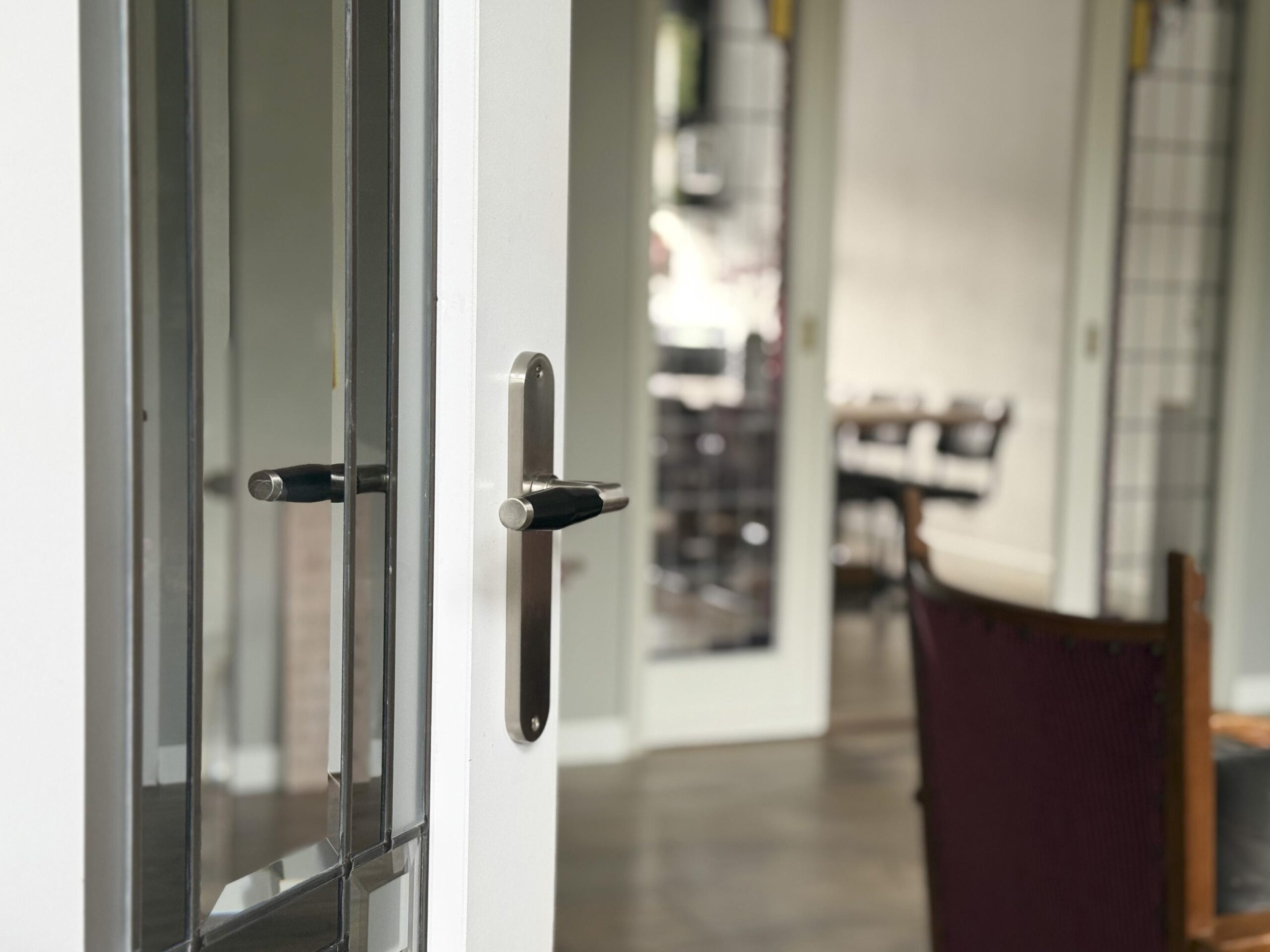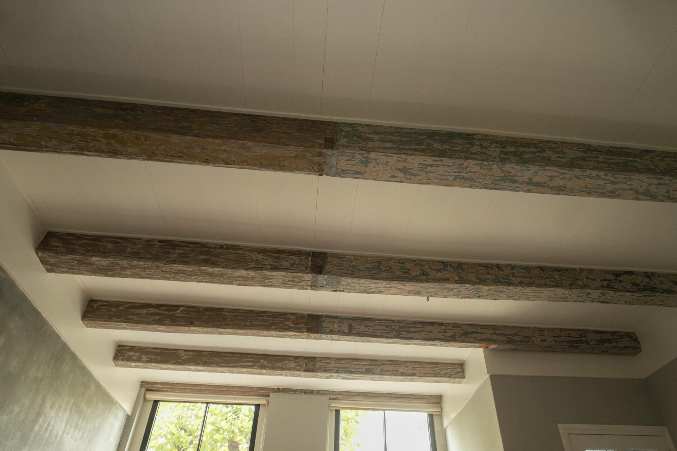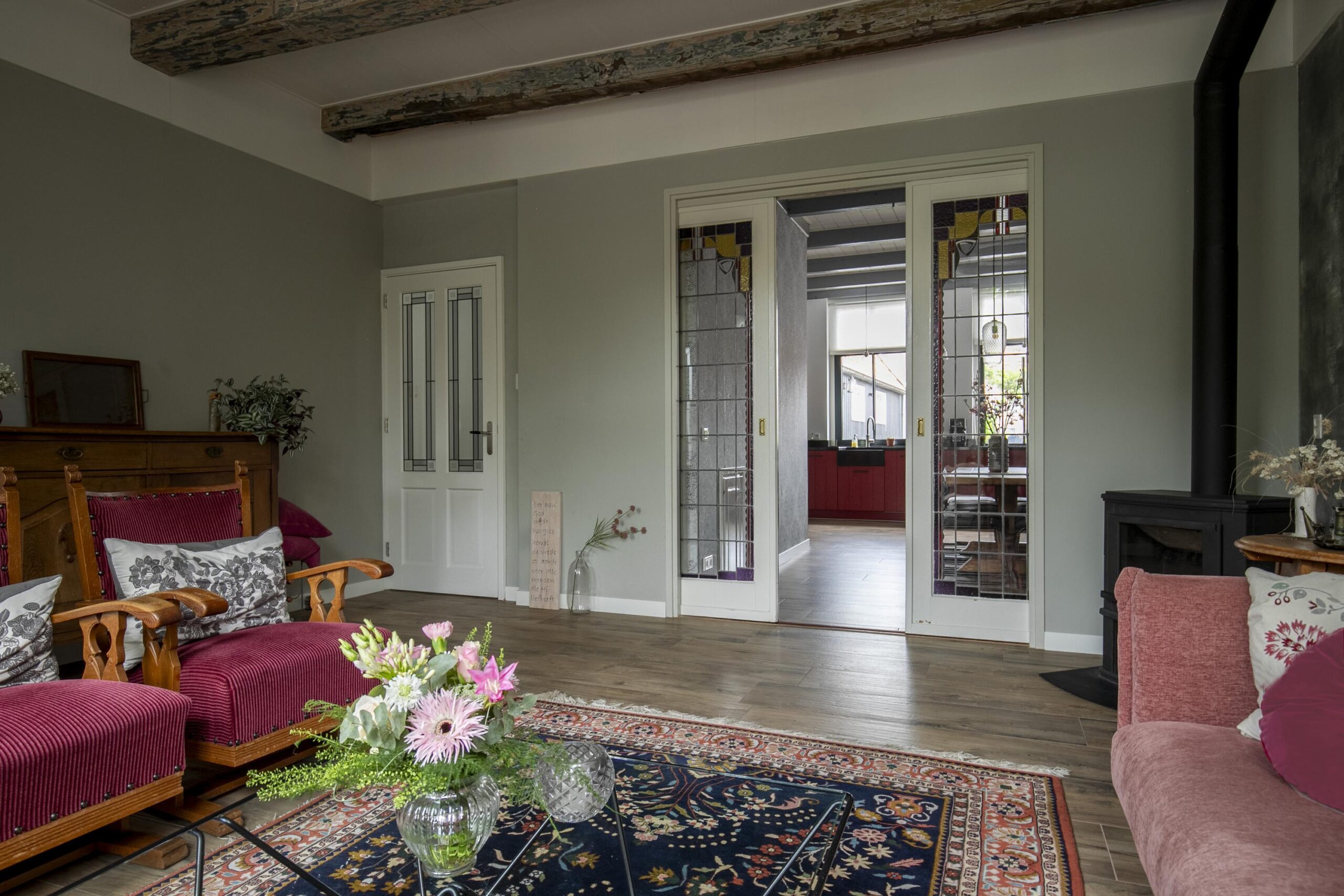Via het charmante voorportaal stap je de woning binnen in de ruime woonkamer. De grote ramen aan de voorzijde zorgen voor een prachtige lichtinval en bieden uitzicht op de gracht. De authentieke balken aan het plafond geven de ruimte karakter, terwijl de gladde wanden en keramische tegels met houtlook voor een moderne afwerking zorgen. Het is een sfeervolle leefruimte waar oud en nieuw samenkomen. Perfect om te ontspannen of vrienden te ontvangen.