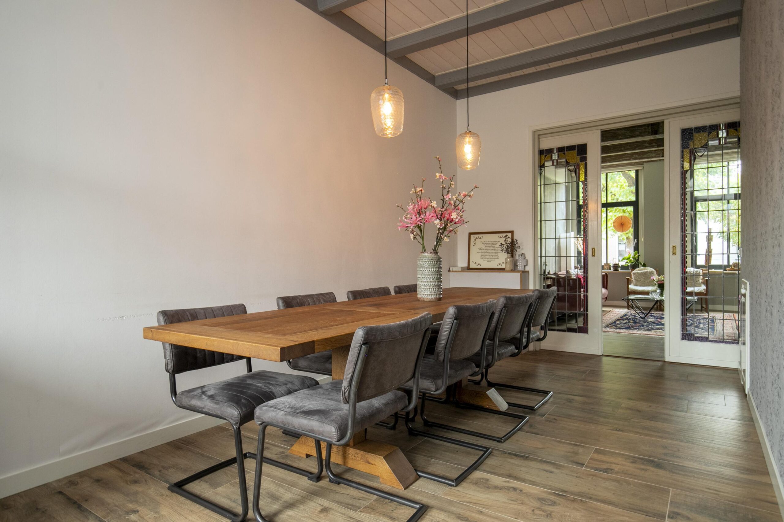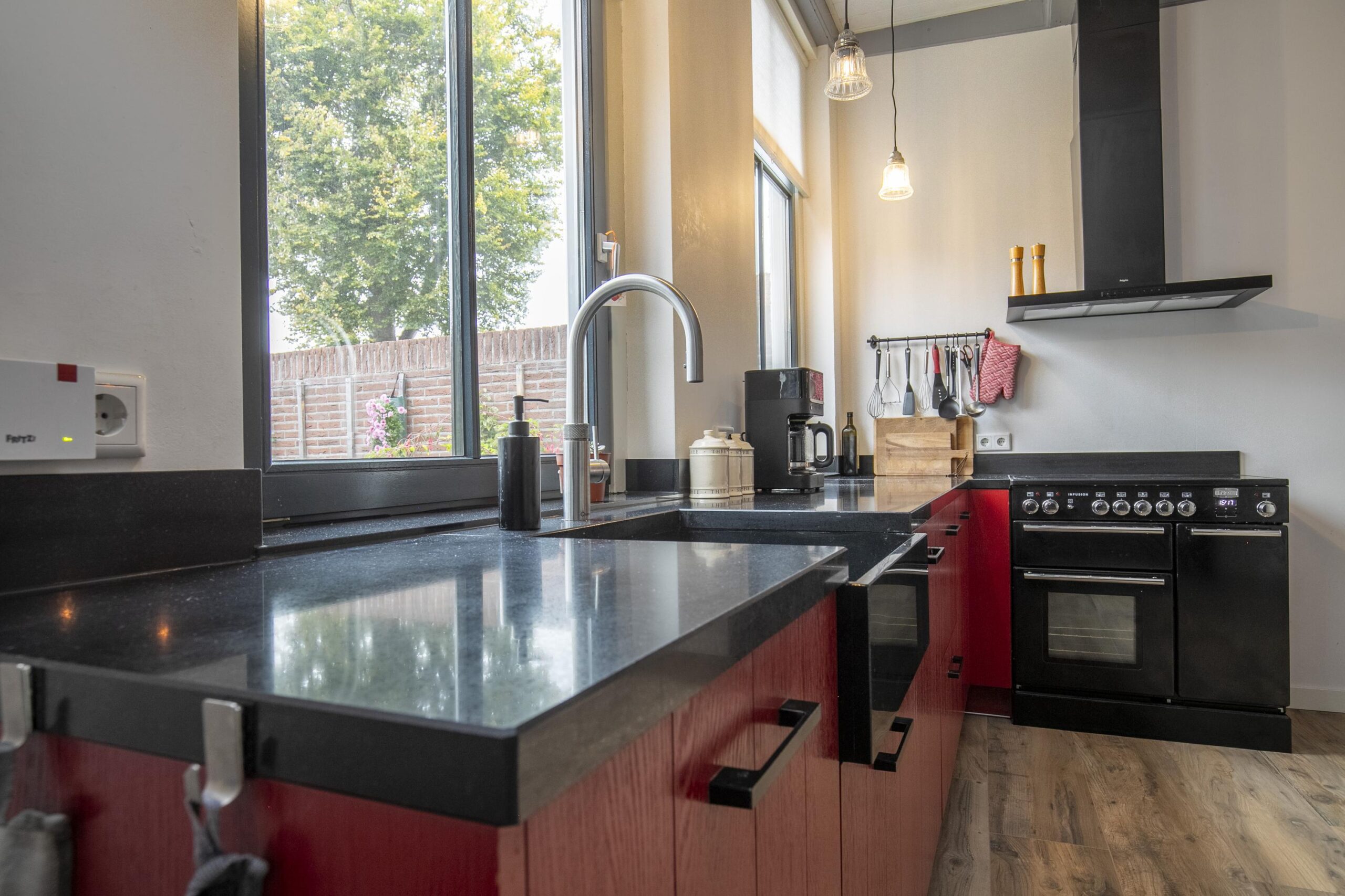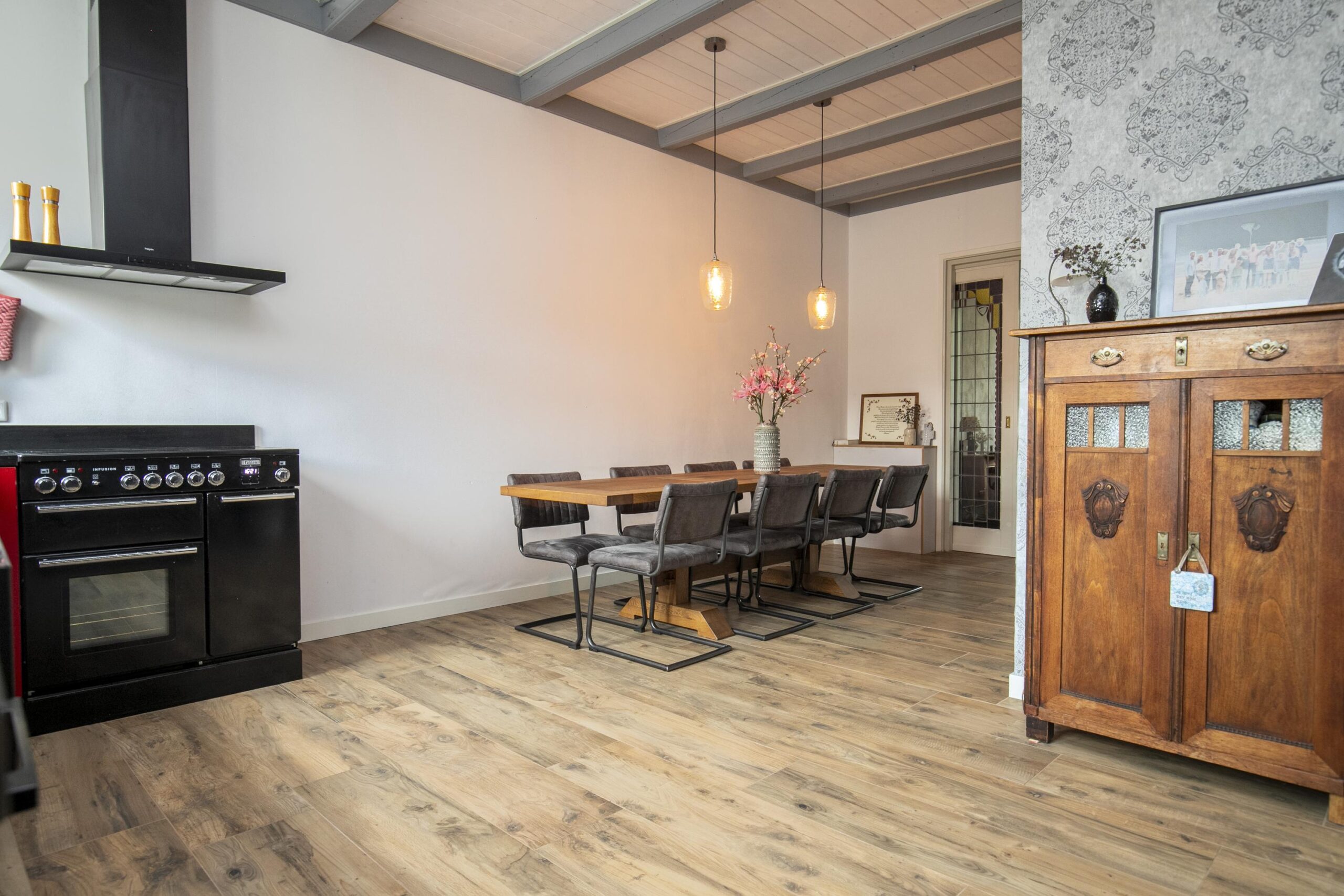 Via de prachtige ensuite deuren kom je in de ruime woonkeuken, een heerlijke plek waar koken, tafelen en samenzijn centraal staan. De keuken is uitgevoerd in een moderne, landelijke stijl, voorzien van diverse inbouwapparaten en biedt ruimte voor een grote eettafel. Dankzij de ligging aan de achterzijde heb je direct zicht op en toegang tot de tuin.