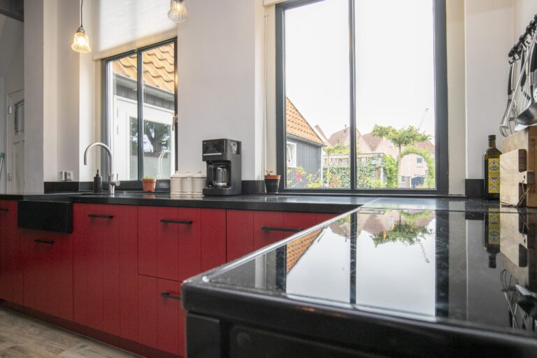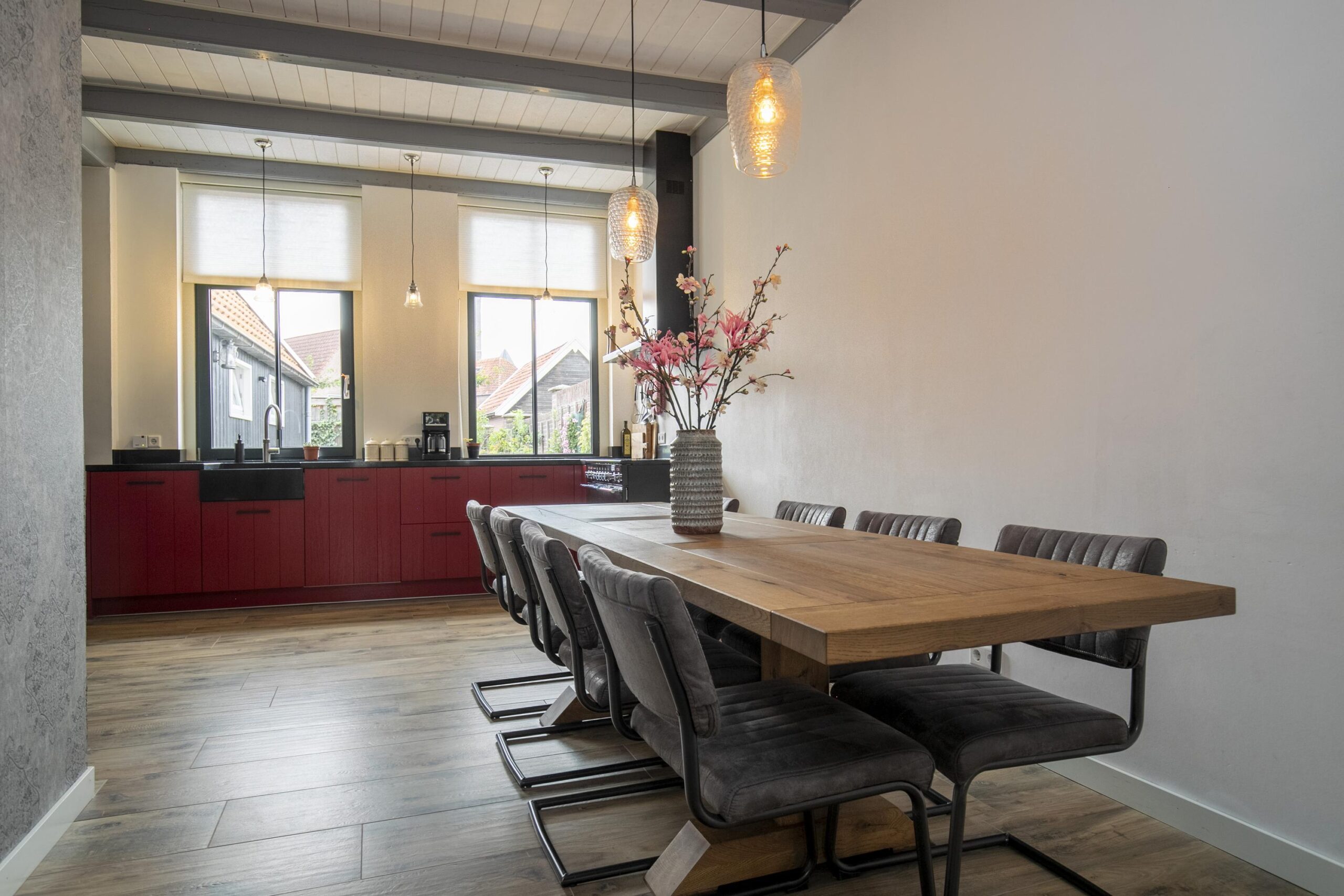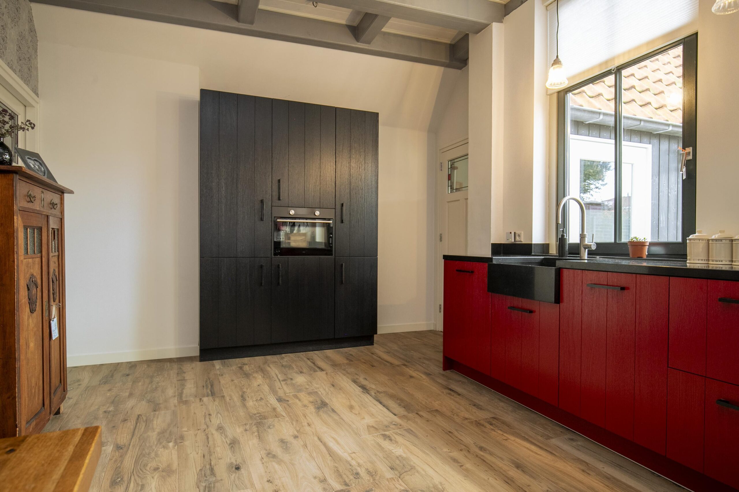 Via de prachtige ensuite deuren kom je in de ruime woonkeuken, een heerlijke plek waar koken, tafelen en samenzijn centraal staan. De keuken is uitgevoerd in een moderne, landelijke stijl, voorzien van diverse inbouwapparaten en biedt ruimte voor een grote eettafel. Dankzij de ligging aan de achterzijde heb je direct zicht op en toegang tot de tuin.