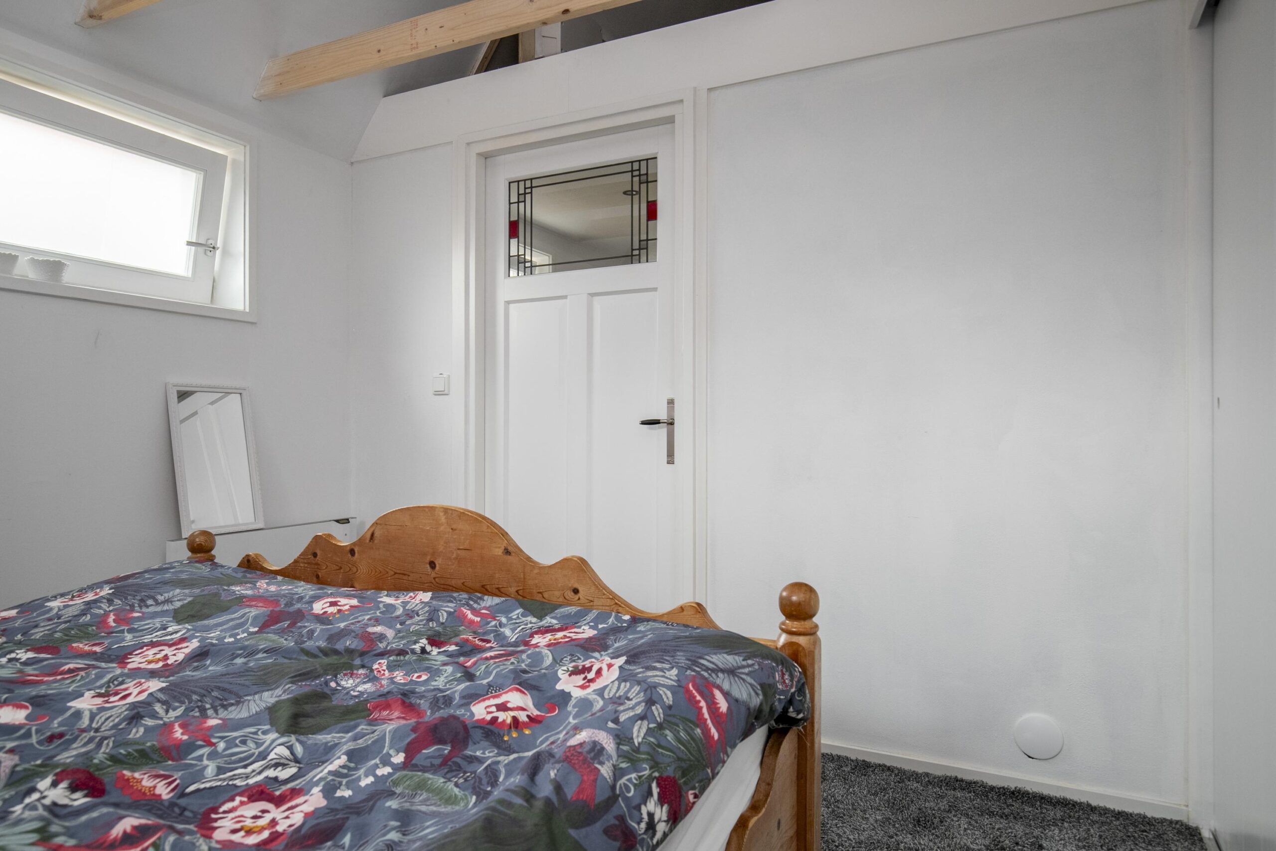 Aan de voorzijde bevindt zich een lichte slaapkamer met een dakraam en inbouwkast, een fijne kamer met uitzicht op de gracht, die ook uitstekend als werkkamer of logeerkamer kan dienen.