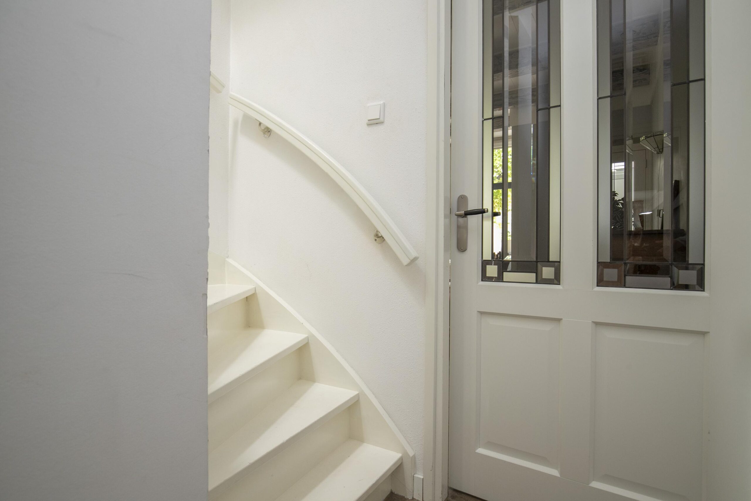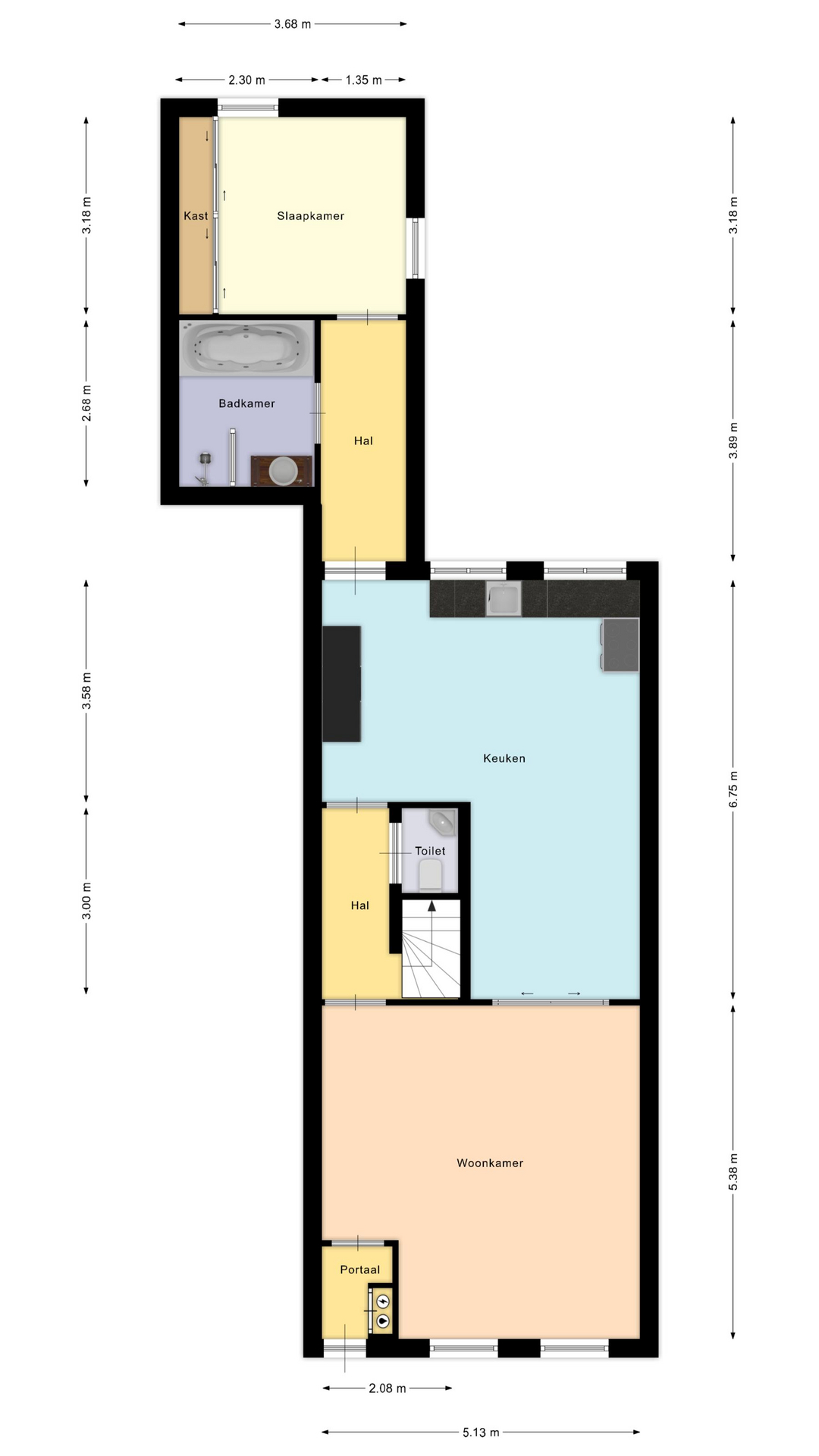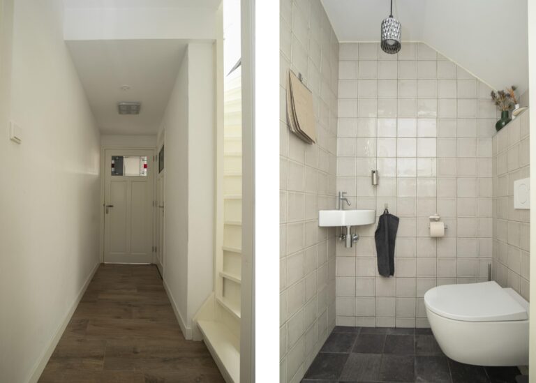 In het midden van de woning vind je het toilet en de trapopgang naar boven. Deze bevinden zich in de hal, die zowel vanuit de woonkamer als de keuken toegankelijk is.