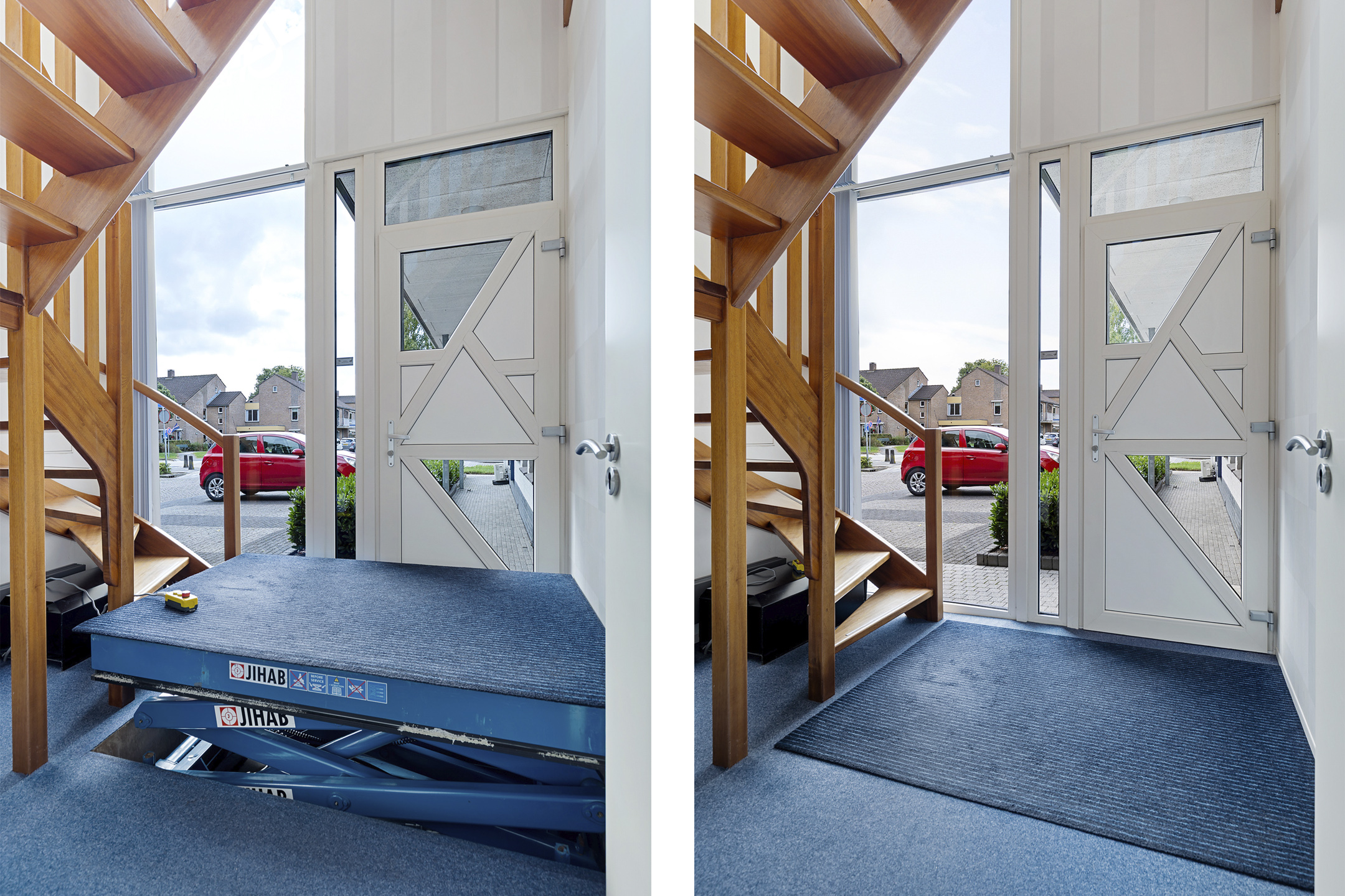In de entree op de begane grond bevindt zich de trap naar de bovenwoning. Ook is hier een goederenlift aanwezig, subtiel weggewerkt onder de deurmat – een bijzonder praktisch detail.