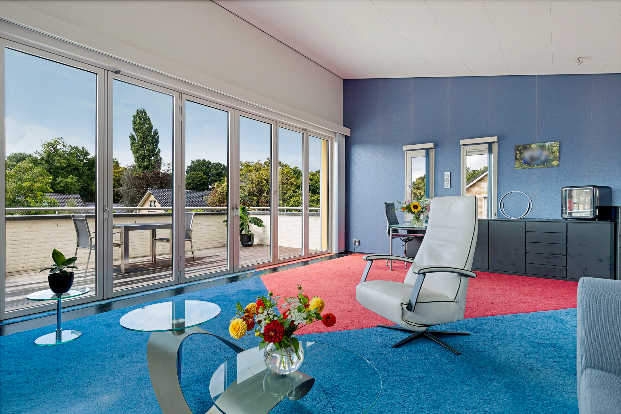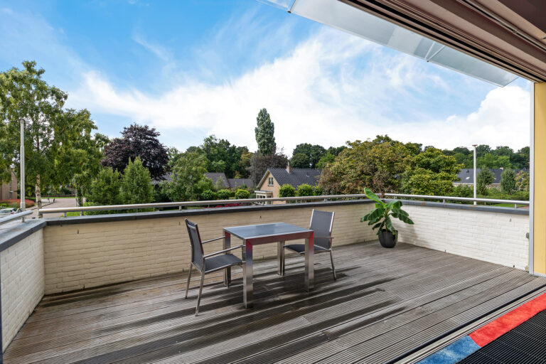Hier kun je ’s ochtends in alle rust genieten van een kop koffie, terwijl je uitkijkt over de groene omgeving. In de middag en avond is het terras een heerlijke plek om samen te eten of te borrelen, en op warme zomeravonden is het dé plek om tot laat buiten te zitten. Met een volledig geopende pui haal je het comfort van binnen naar buiten en andersom. Dankzij de ligging op de eerste verdieping heb je bovendien veel privacy en een vrij uitzicht.