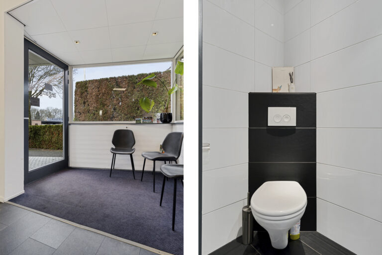 De praktijk- /kantoor-/ bedrijfs-/ multifunctionele ruimte op de begane grond, met eigen entree aan de Dr. H.A.W. van der Vechtlaan vormt een volwaardig en zelfstandig te gebruiken praktijkgedeelte van 115 m². Via de eigen entree betreed je een nette ontvangstruimte/wachtruimte met veel lichtinval, wat direct een professionele en verzorgde indruk geeft.