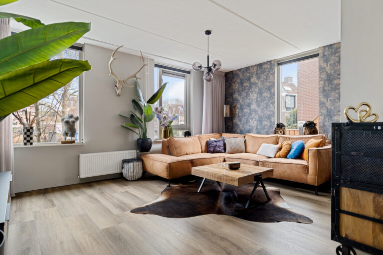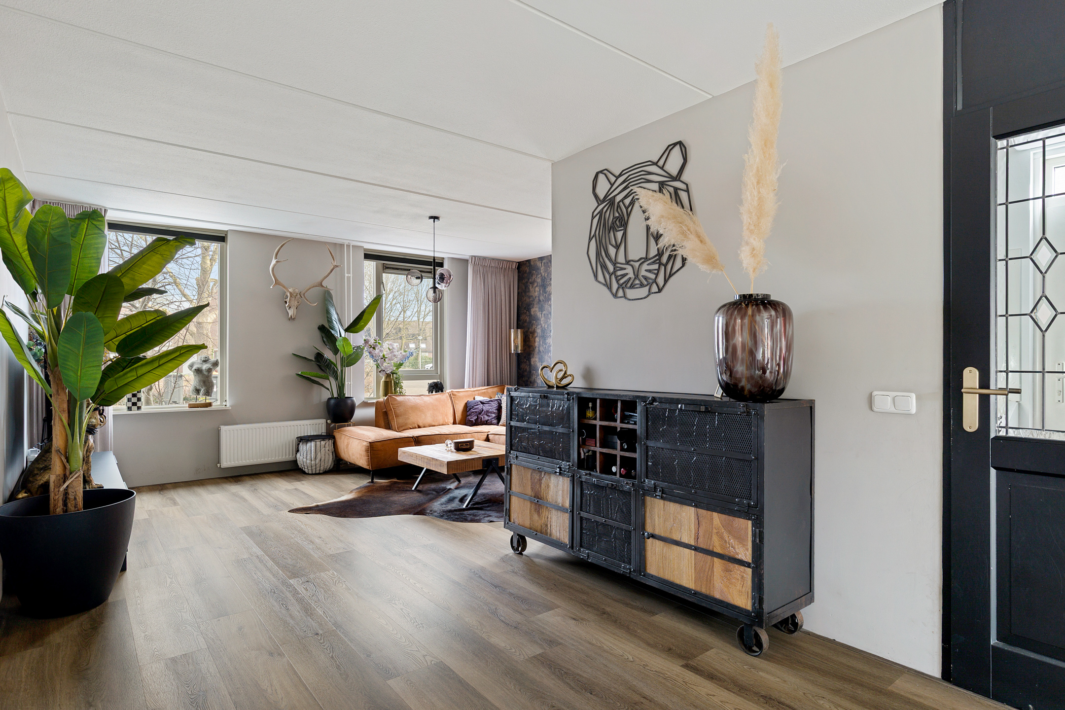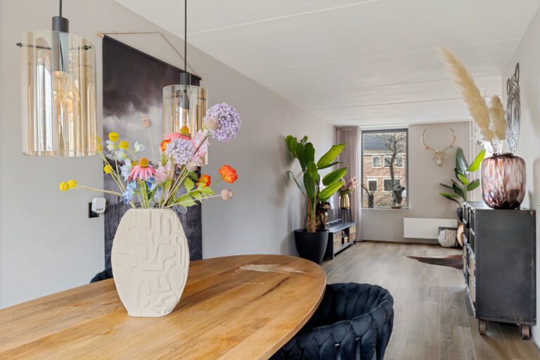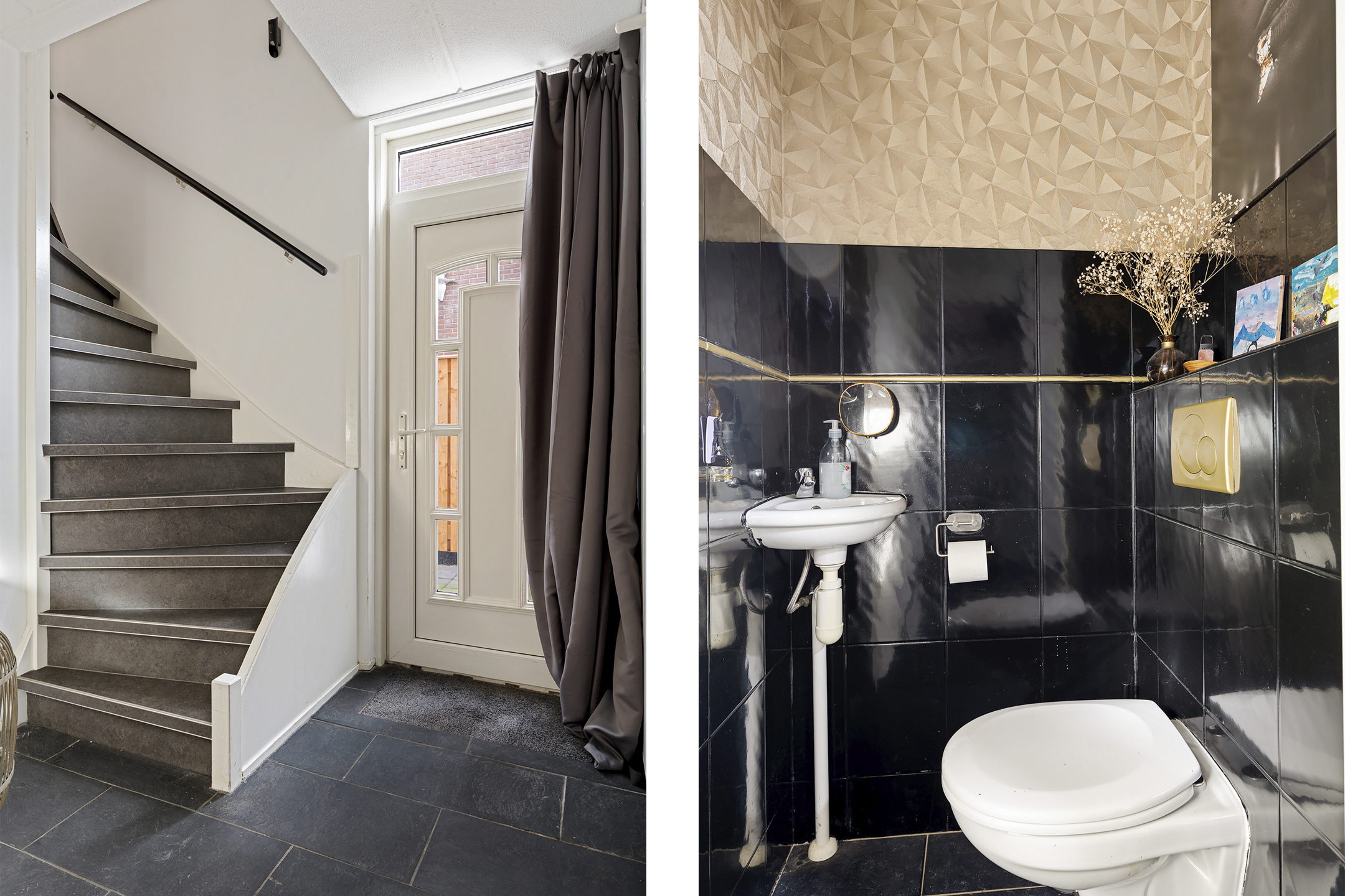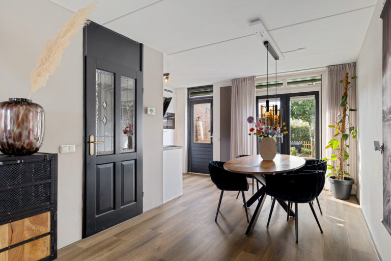 Je komt binnen in de hal met toilet, meterkast en trapopgang naar de eerste verdieping. De woonkamer met PVC-vloer is licht en sfeervol. De halfopen keuken is voorzien van inbouwapparatuur en biedt direct toegang tot de zonnige achtertuin.