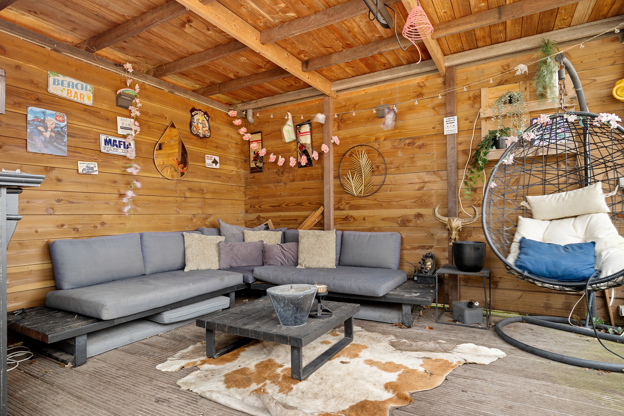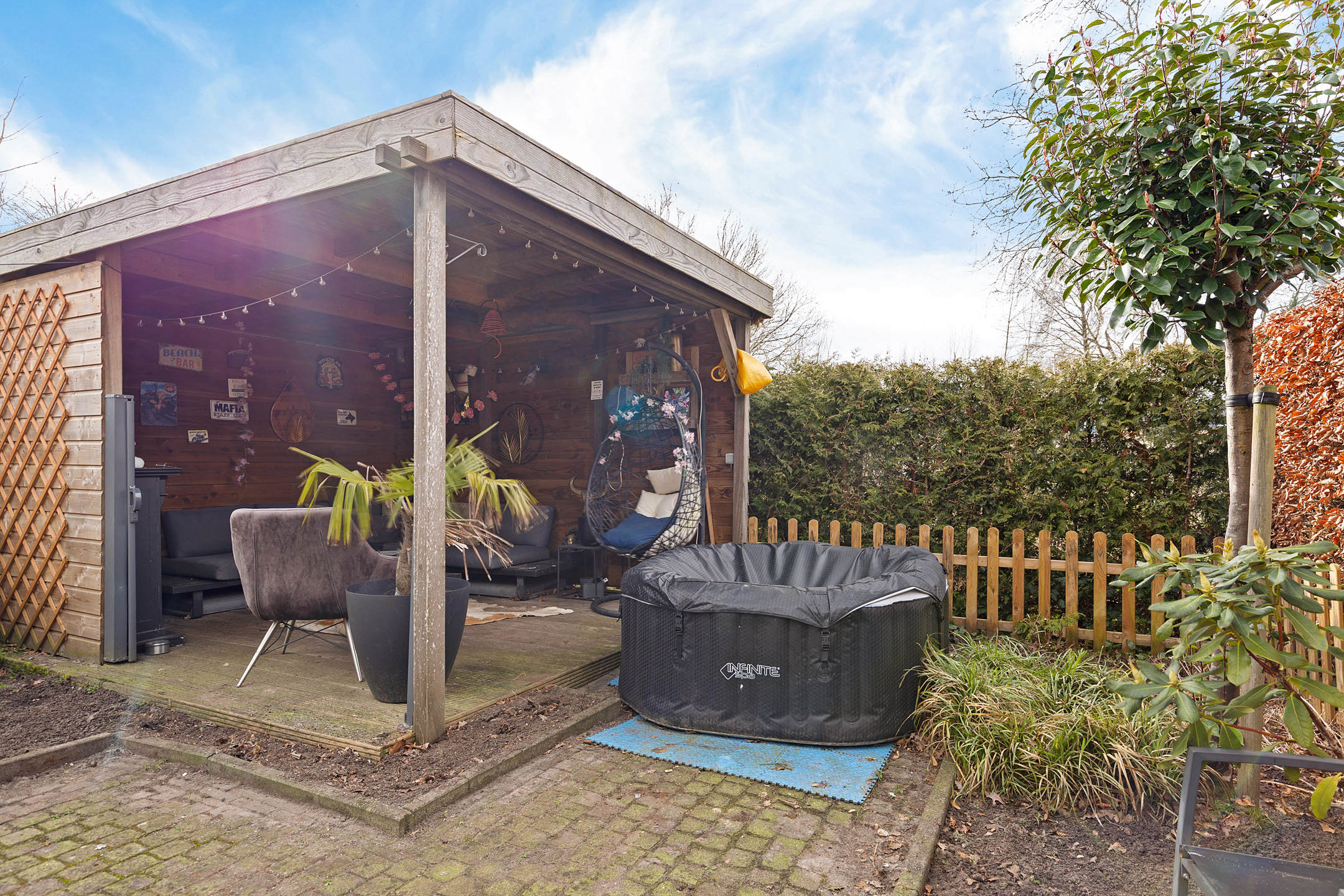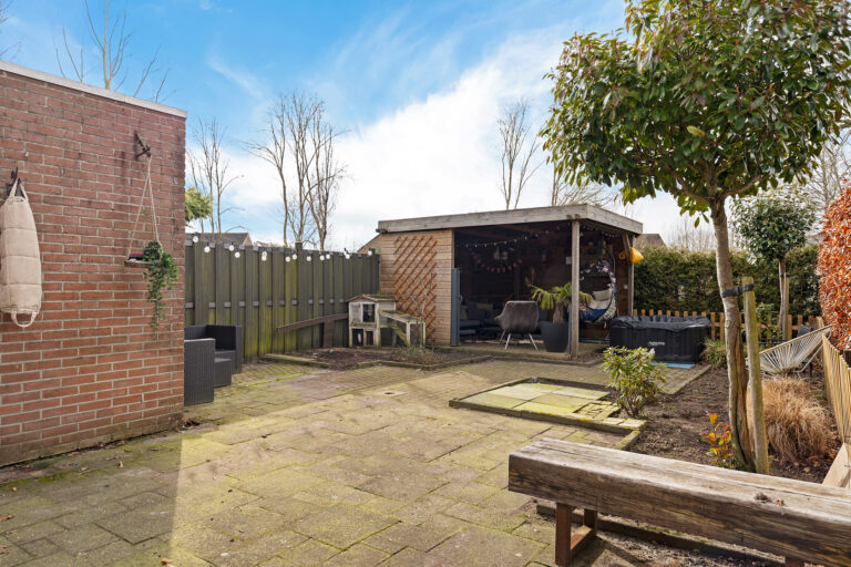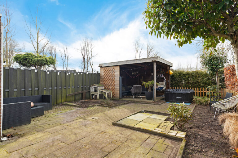 De zonnige achtertuin op het zuidwesten biedt volop privacy en is een heerlijke plek om te ontspannen. Onder de overkapping geniet je tot in de late uurtjes van het buitenleven. Parkeren doe je eenvoudig op je eigen oprit, naast de aangebouwde stenen garage.