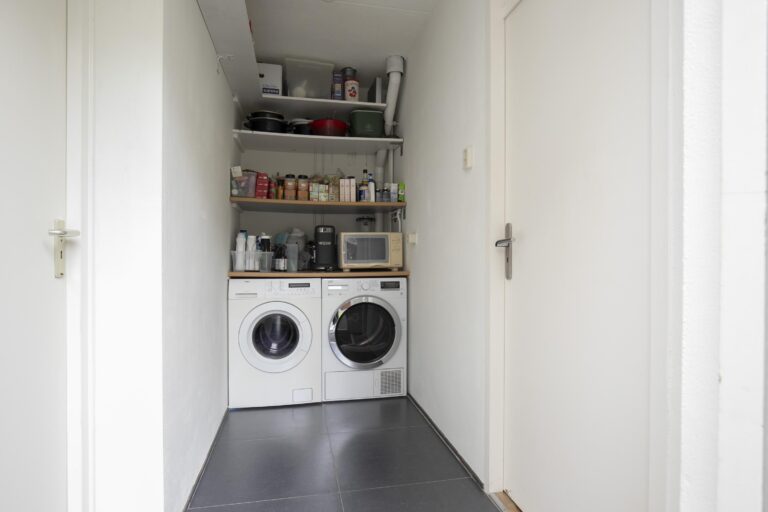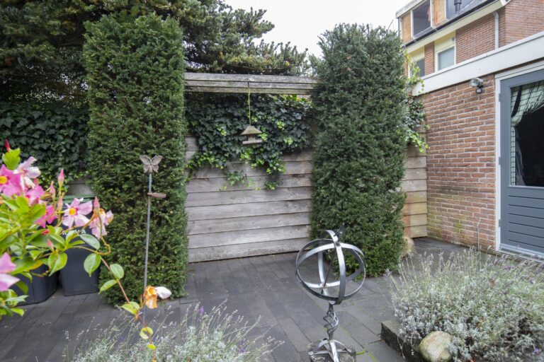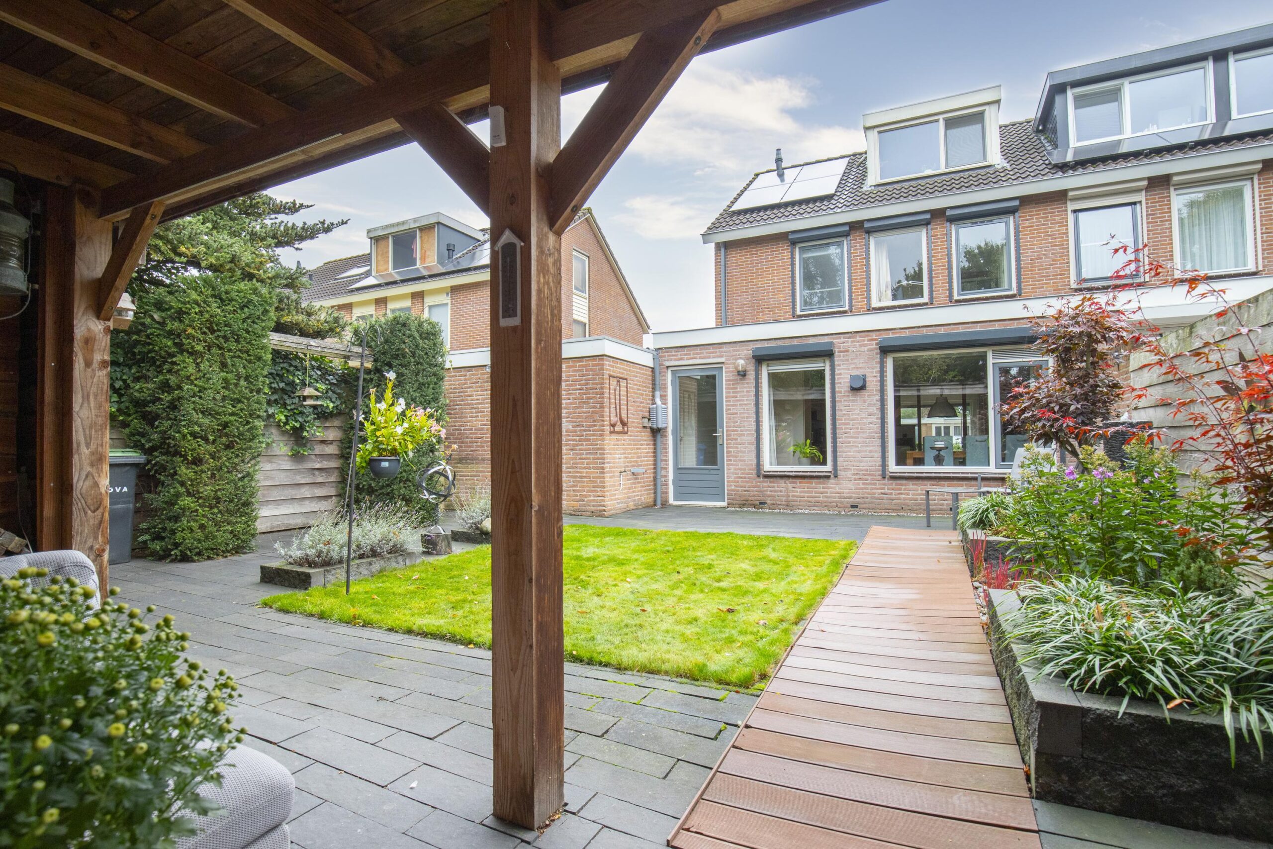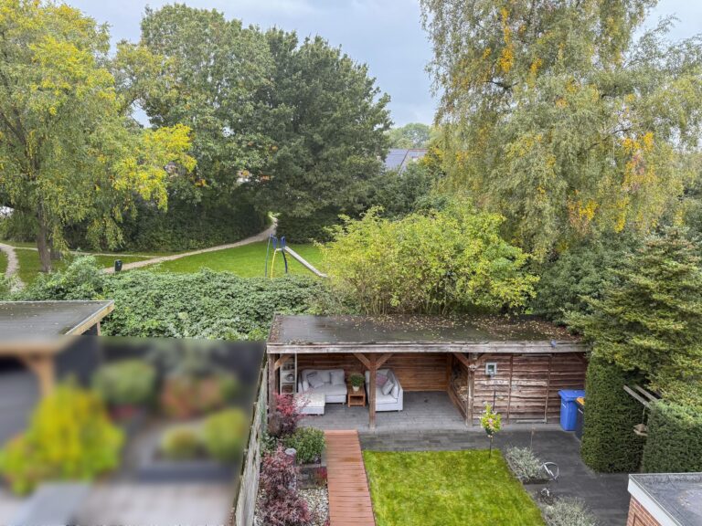 Een diepe, zonnige achtertuin op het westen biedt volop privacy én een heerlijke plek om tot rust te komen. Geniet onder de overkapping van lange zomeravonden, terwijl de kinderen spelen in de tuin. Parkeren? Dat doe je gewoon op eigen terrein.