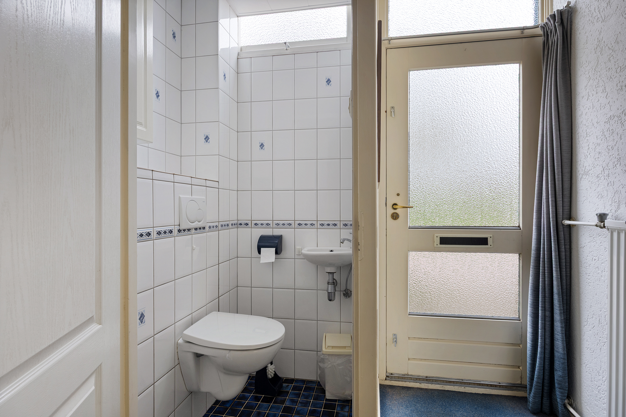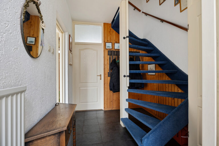 Bij aankomst valt direct de vrije situering op. Geen directe inkijk aan de voorzijde, maar een open en groen uitzicht dat zorgt voor een gevoel van ruimte en privacy. Via de entree kom je in de hal met toegang tot het toilet, de meterkast en de trapopgang naar boven. Vanuit hier stap je de woonkamer binnen.