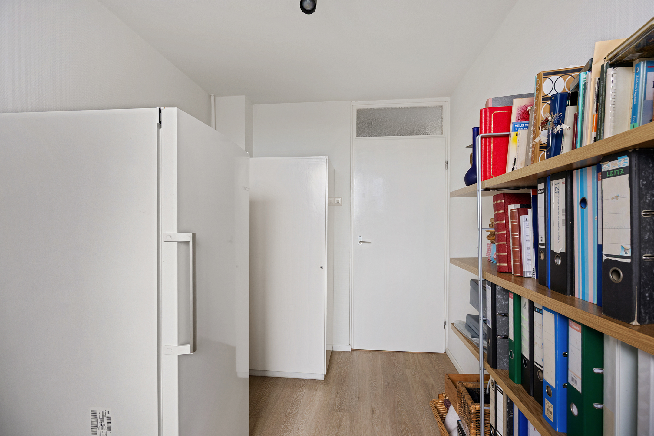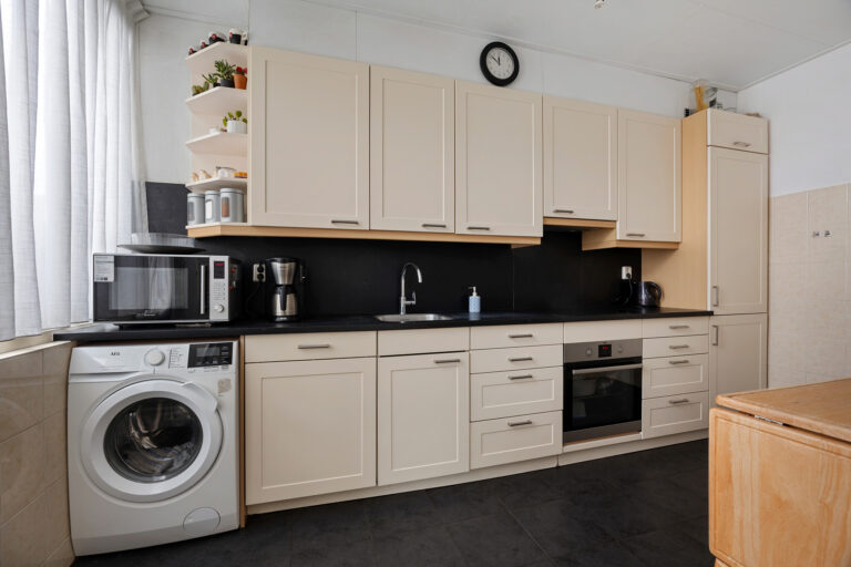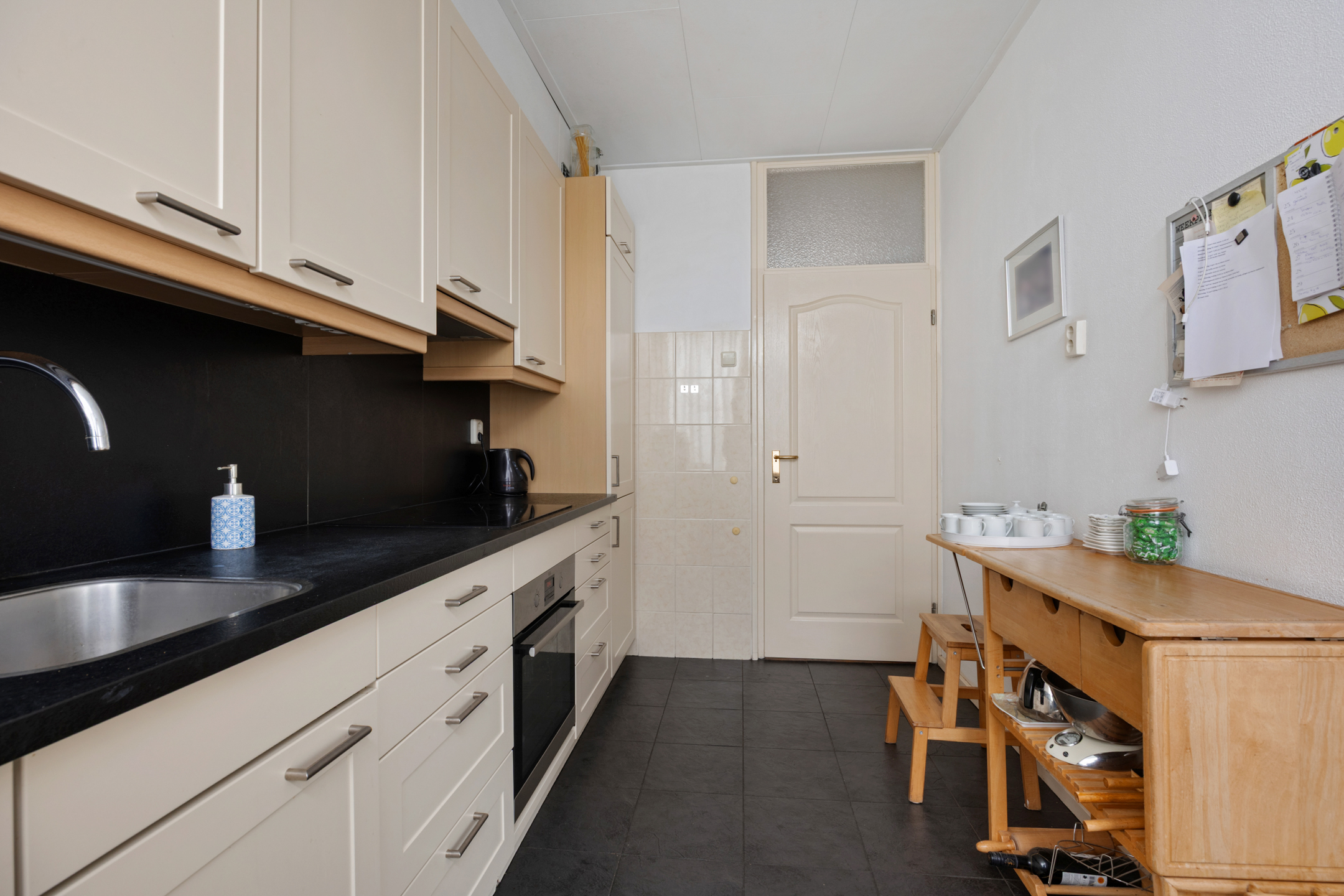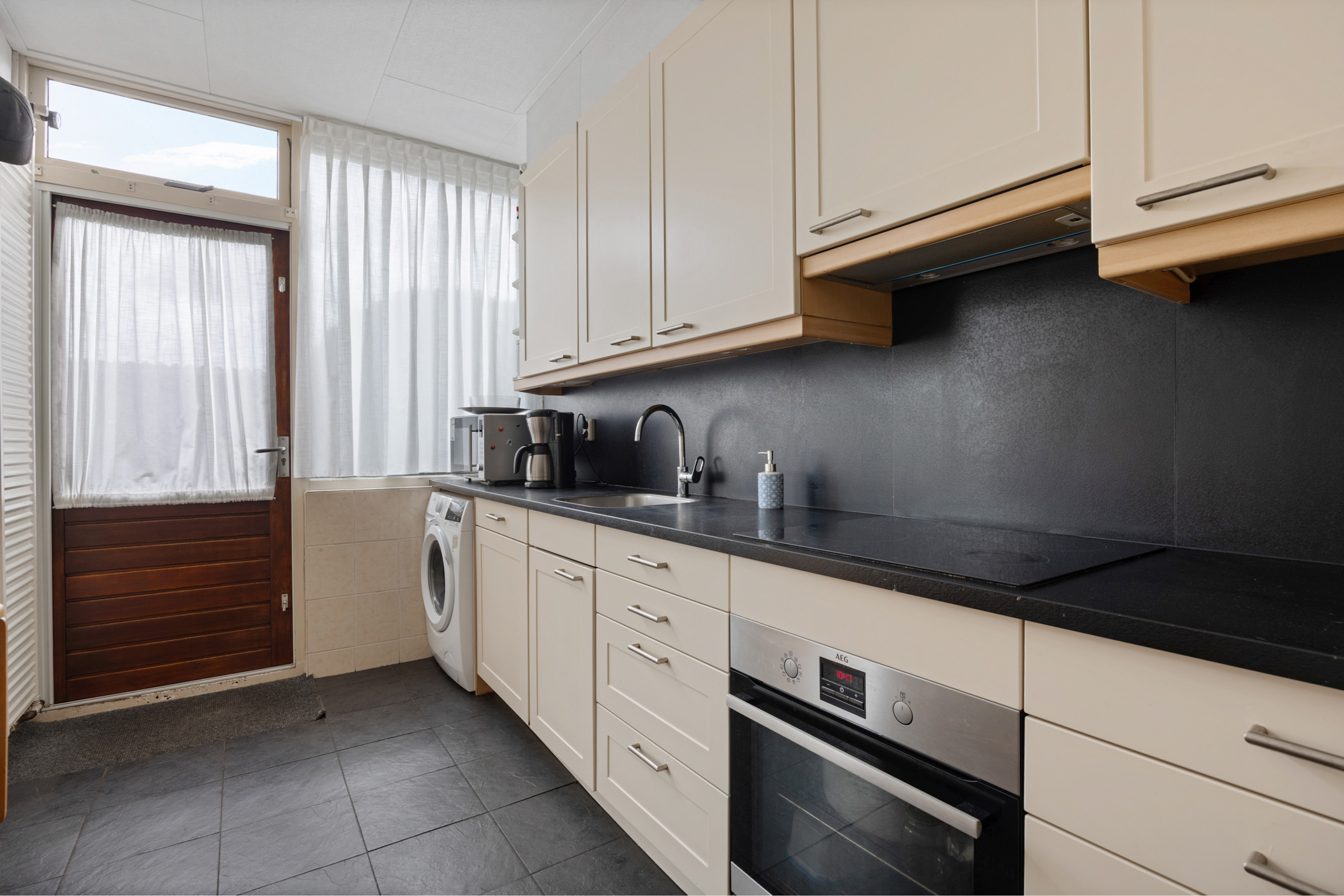 De keuken bevindt zich aan de achterzijde van de woning en is praktisch ingericht met voldoende werk- en bergruimte. Vanuit de keuken is er toegang tot de tuin, waardoor binnen en buiten naadloos in elkaar overlopen.
